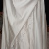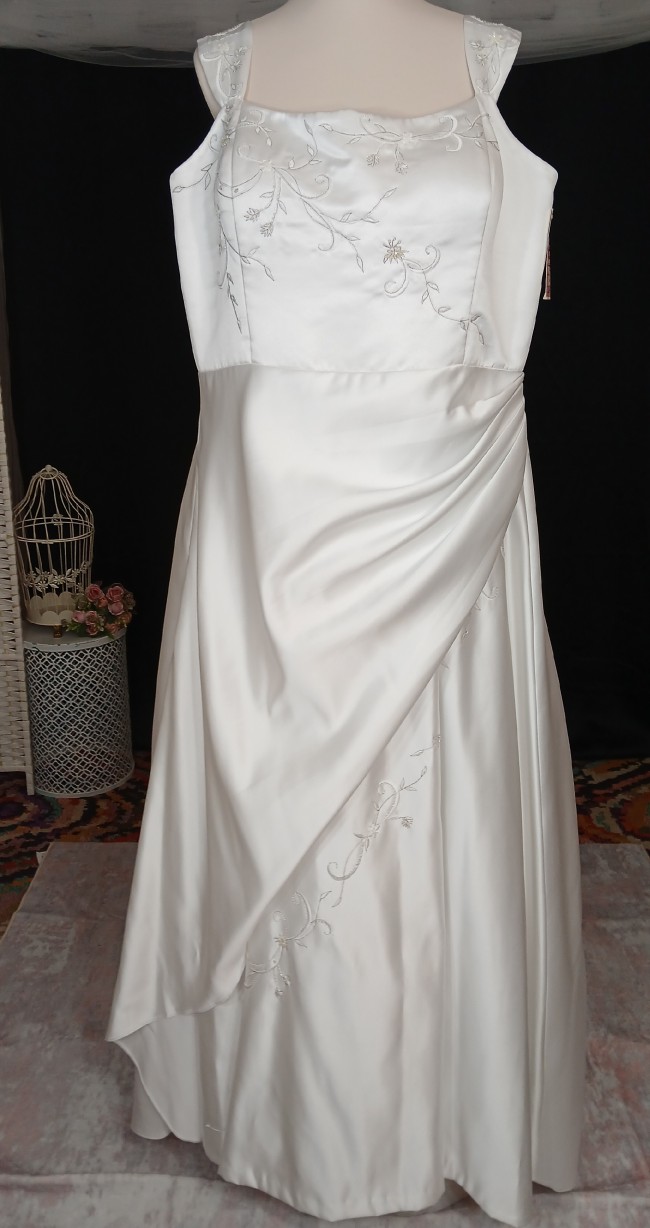 This enchanting A-Line wedding dress by Les Soirées captures the essence of timeless elegance, designed for the modern bride seeking sophistication. The straight neckline gracefully frames the face while the capped sleeves offer delicate support and comfort. The corset back cinches in at the waist, creating a silhouette that flatters all body types. This floor-length gown has a Greek goddess draped feature on the front skirt, which allows for graceful movements when walking down the aisle. The beading and silver embroidery on the bodice add a touch of opulence, catching the light in all the right ways. This is a contemporary version of a traditional bridal gown, and is perfect for a modern bride who still appreciates a traditional style. This is a bridal sample without a tag - only tried on at bridal boutique and has not been worn outside. The original cap sleeves have been altered at the boutique to provide arms with more comfort when trying on the gown. See photos for how the sleeves were professionally altered. Length is 55" from neckline to hemline. The train adds elegance to this lovely bridal gown.