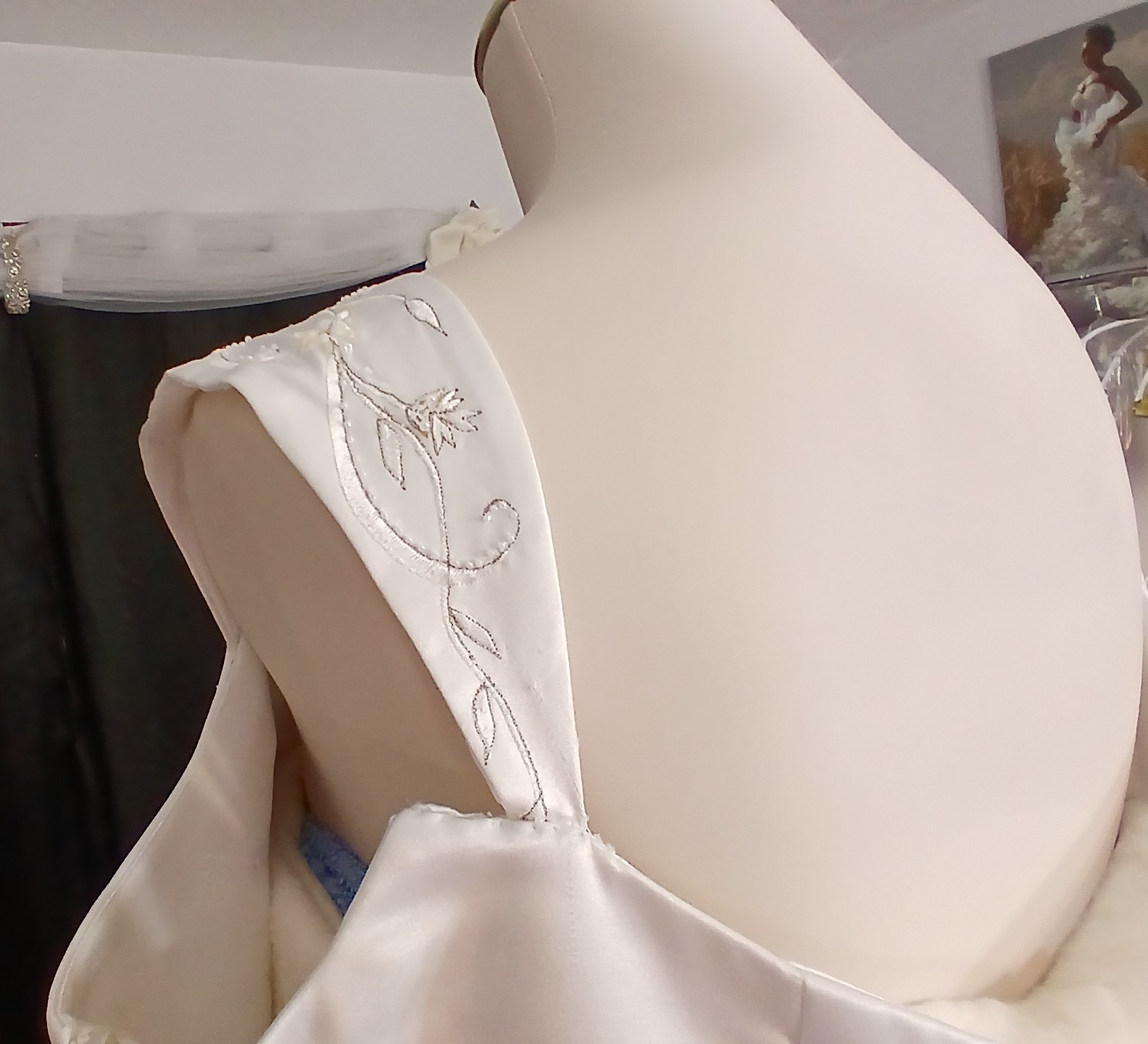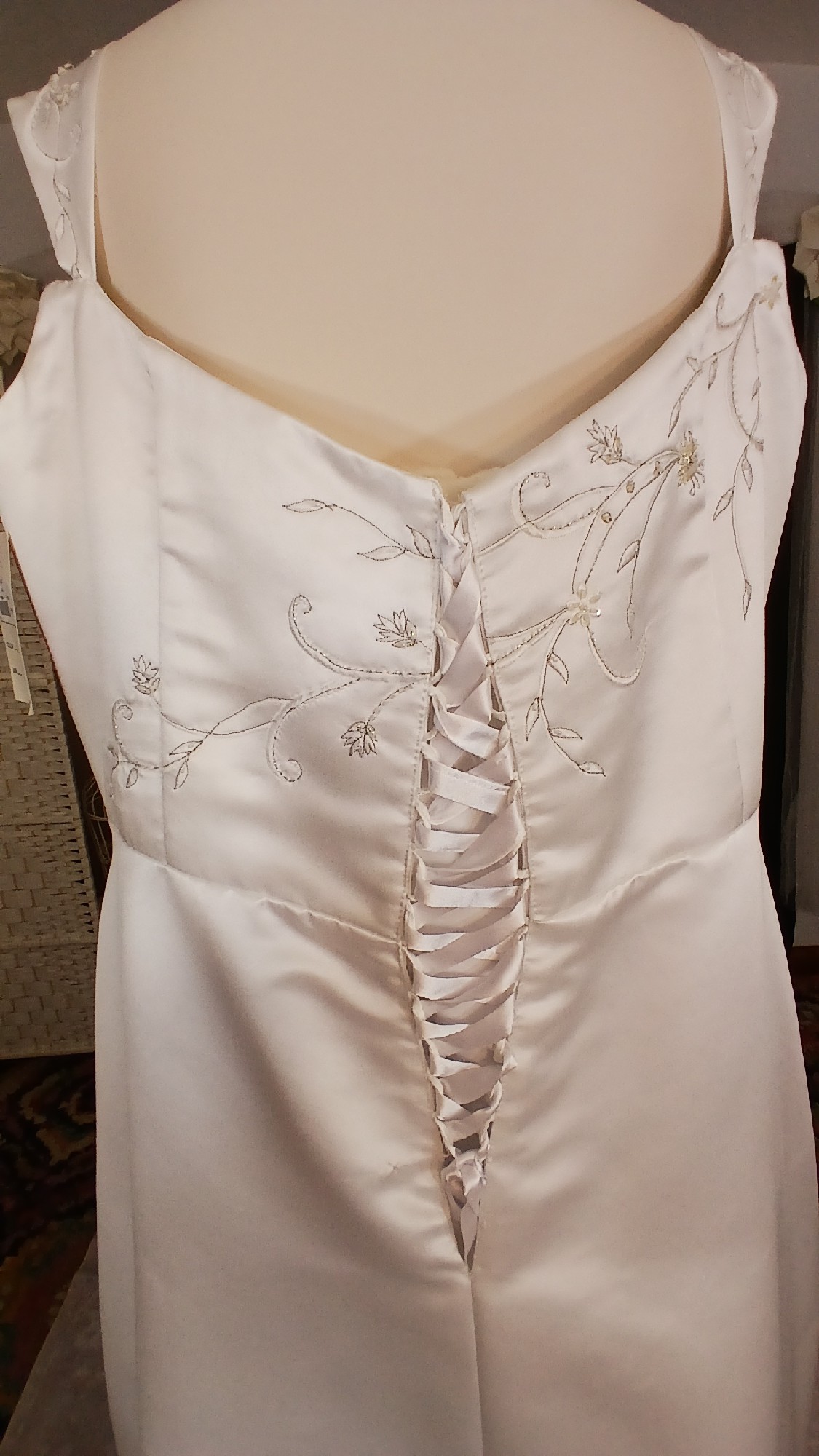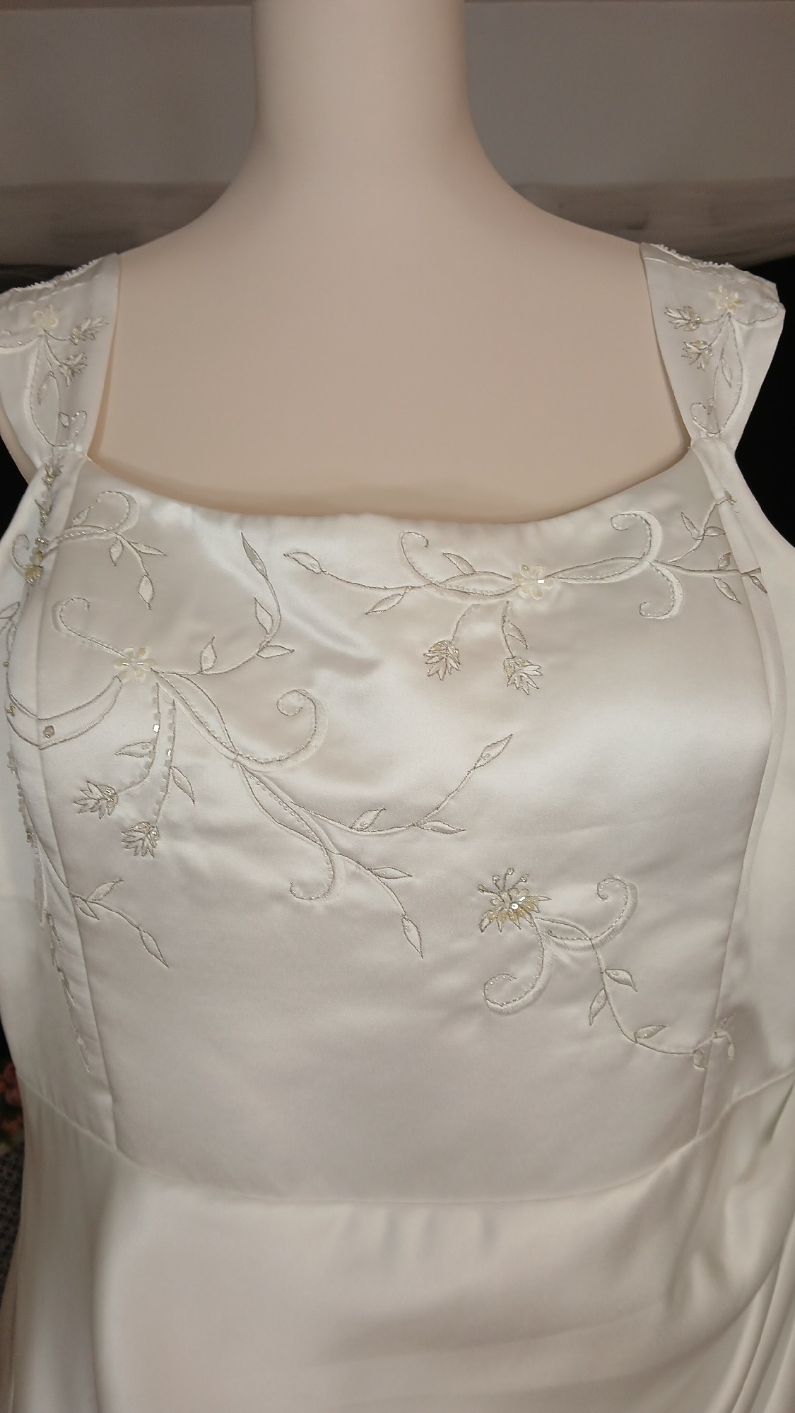 - The original cap sleeves have been altered at the boutique to provide arms with more comfort when trying on this gown