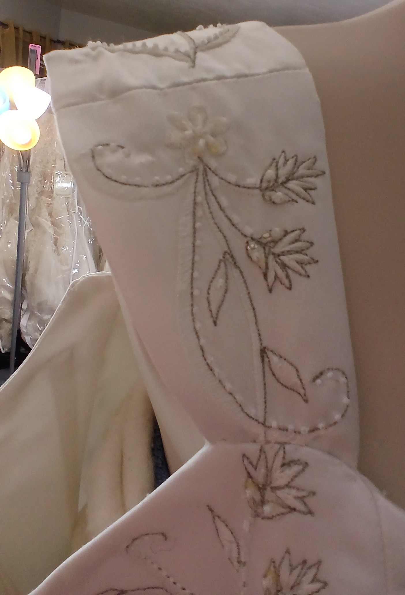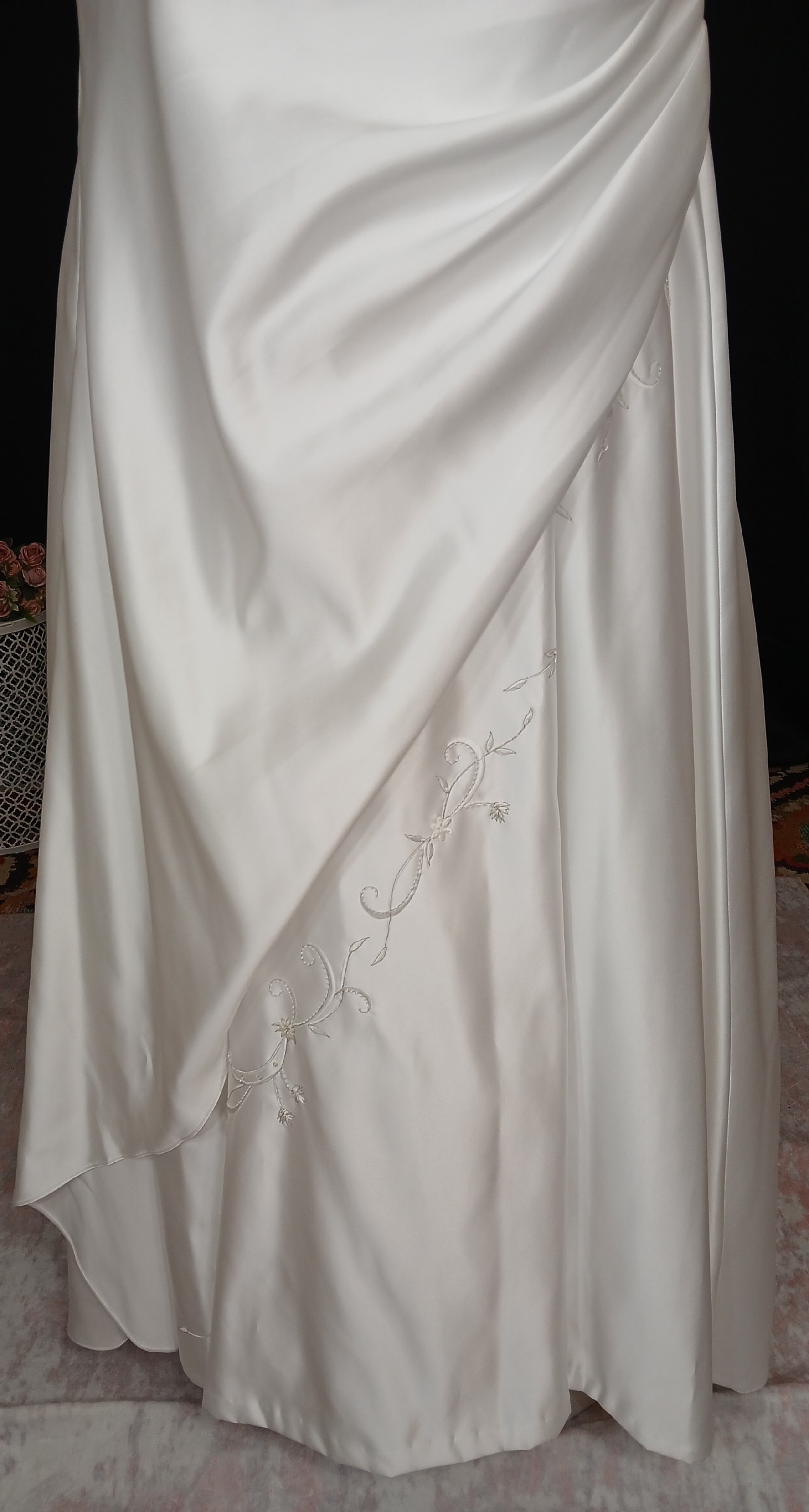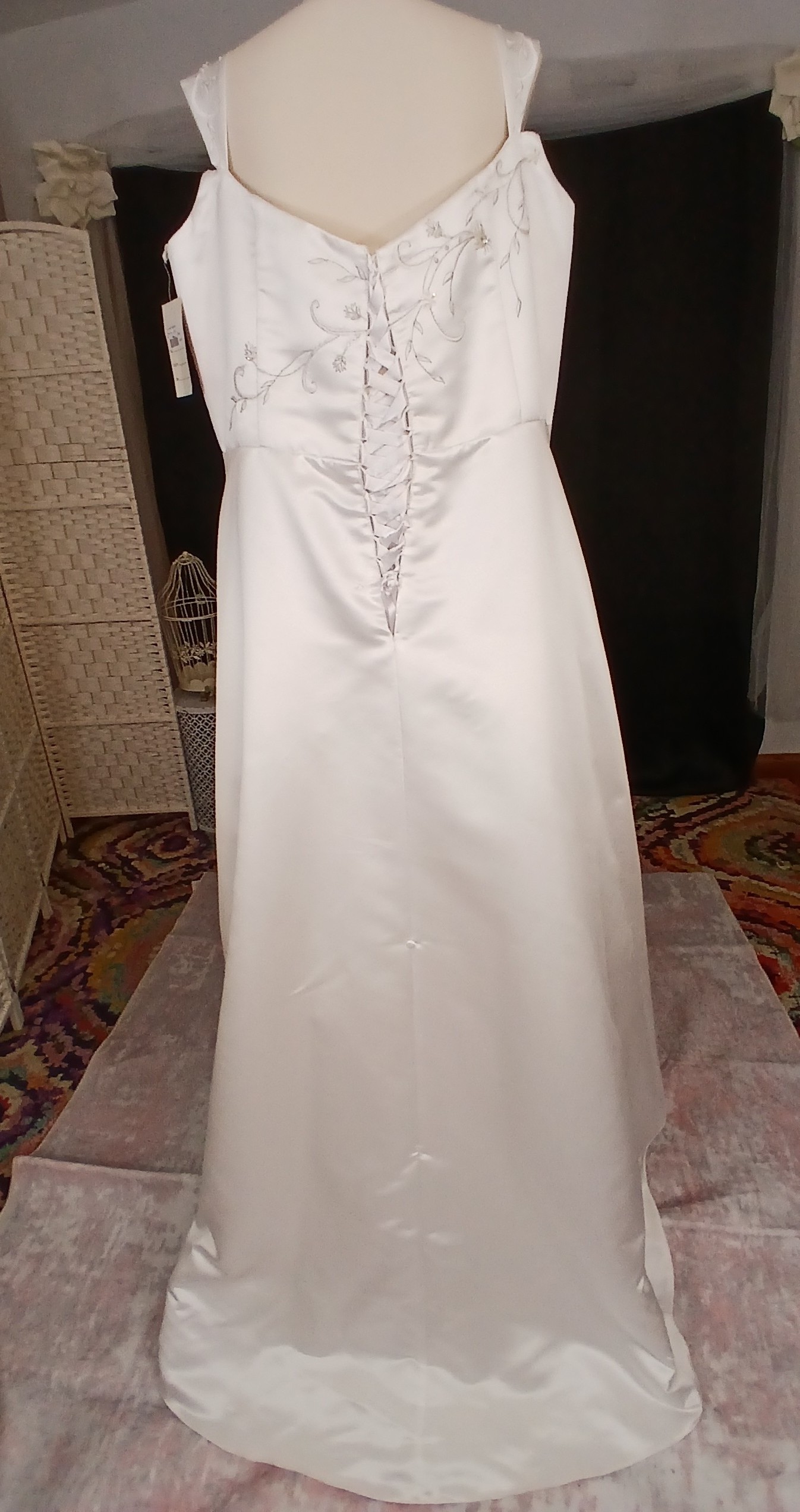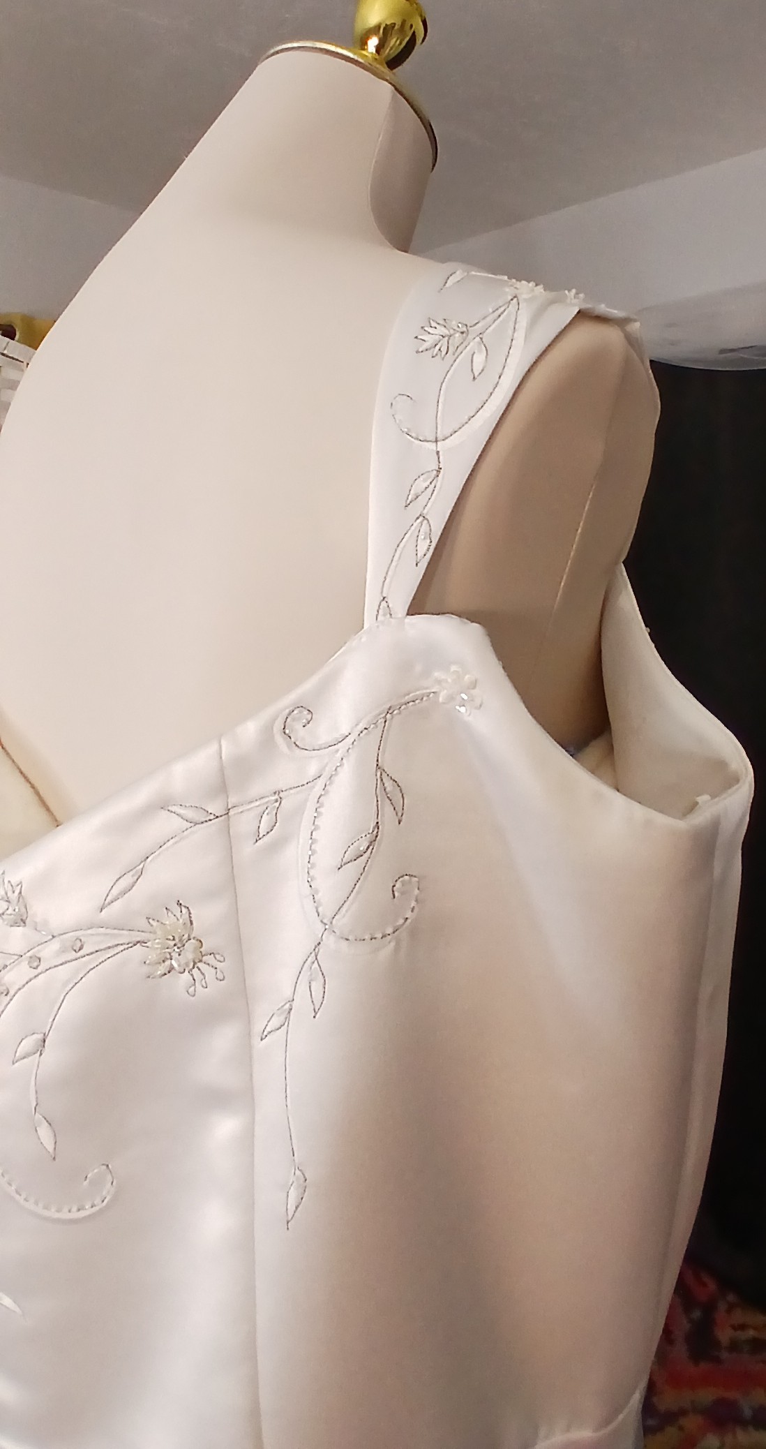 - The original cap sleeves have been altered at the boutique to provide arms with more comfort when trying on this gown