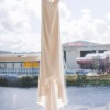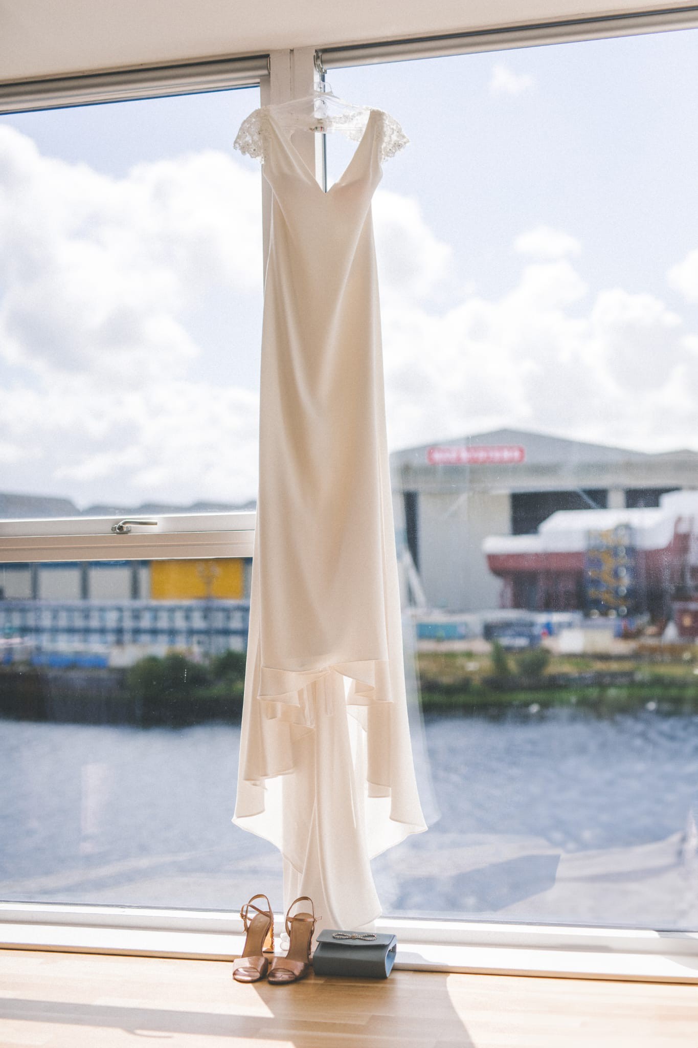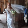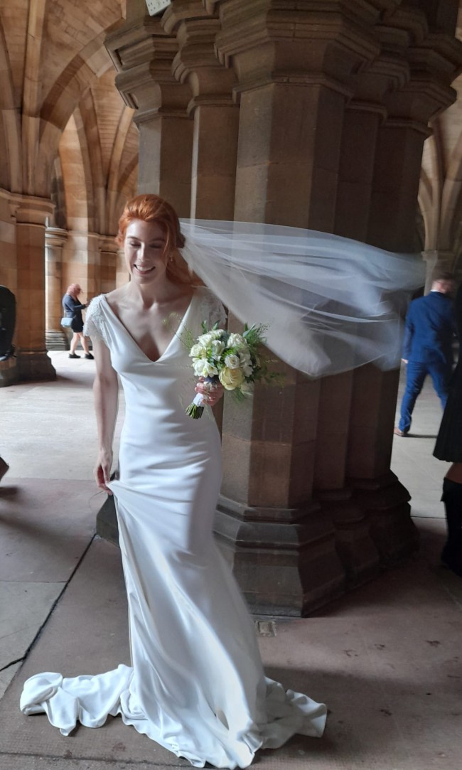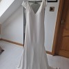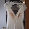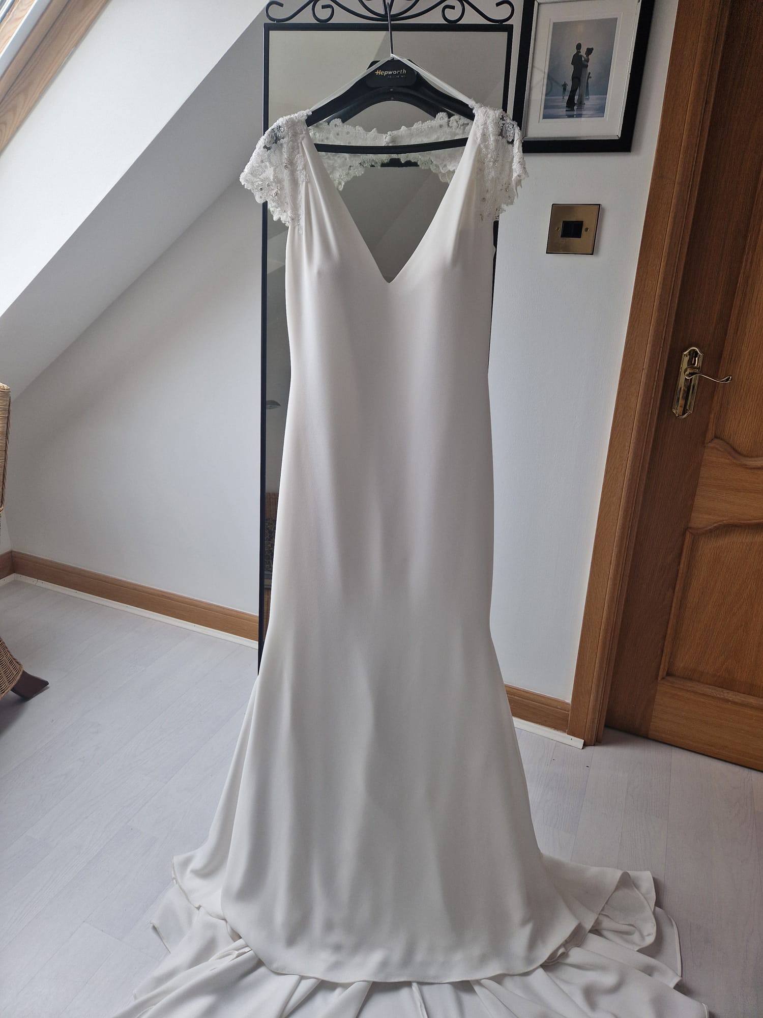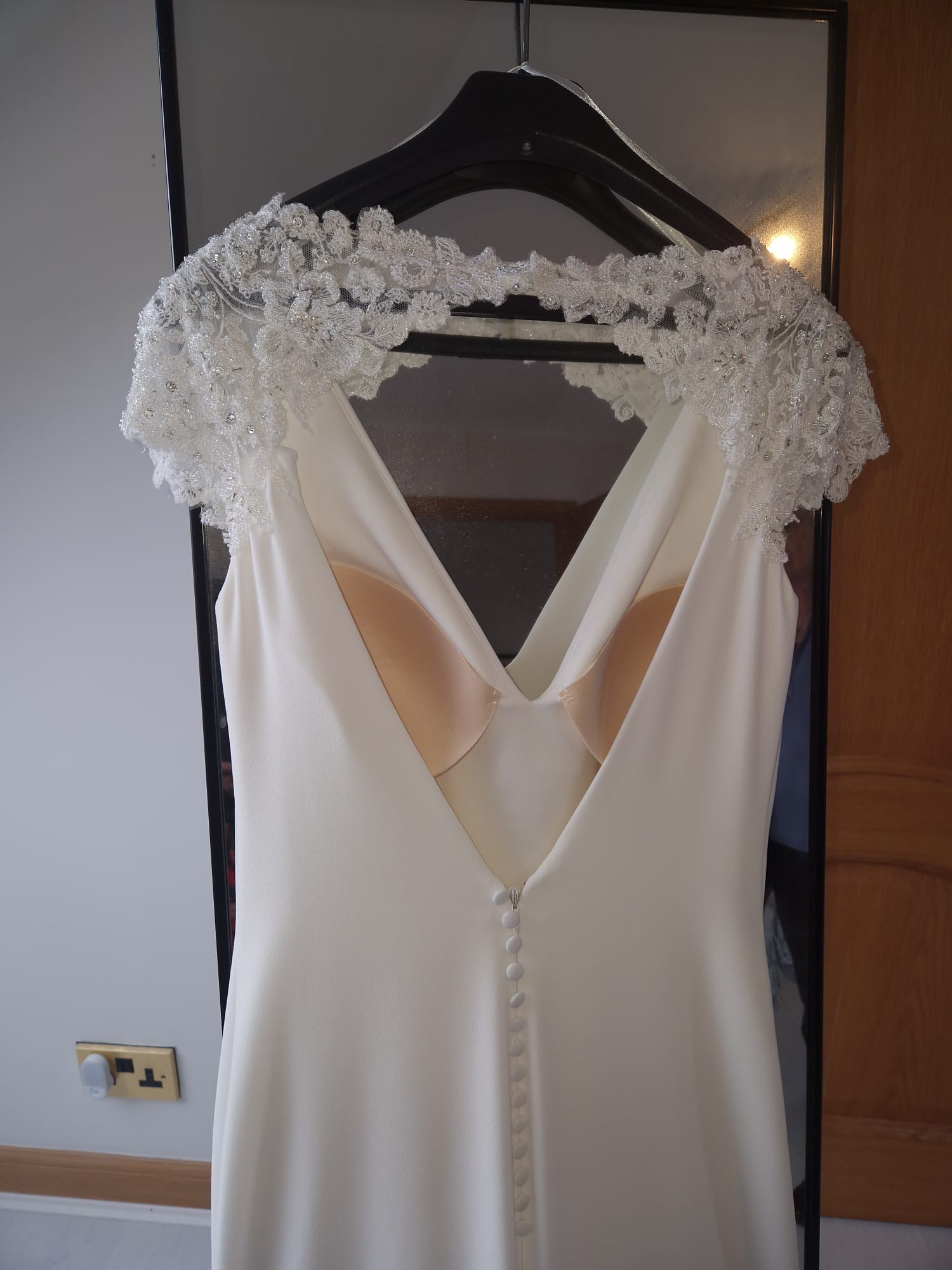 This is an elegant ivory wedding dress with a clean, modern silhouette and delicate lace cap sleeves with a subtle embelishment. It features a flattering V‑neckline, low V‑back with covered buttons, and a soft, flowing train. The dress was very comfortable with smooth satin style fabric allowing it to flow gracefully into a gentle train at the back creating a stunning shape. The dress was worn and loved all day.