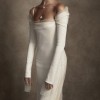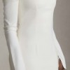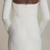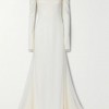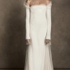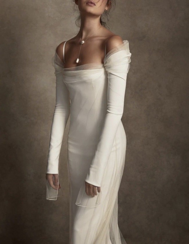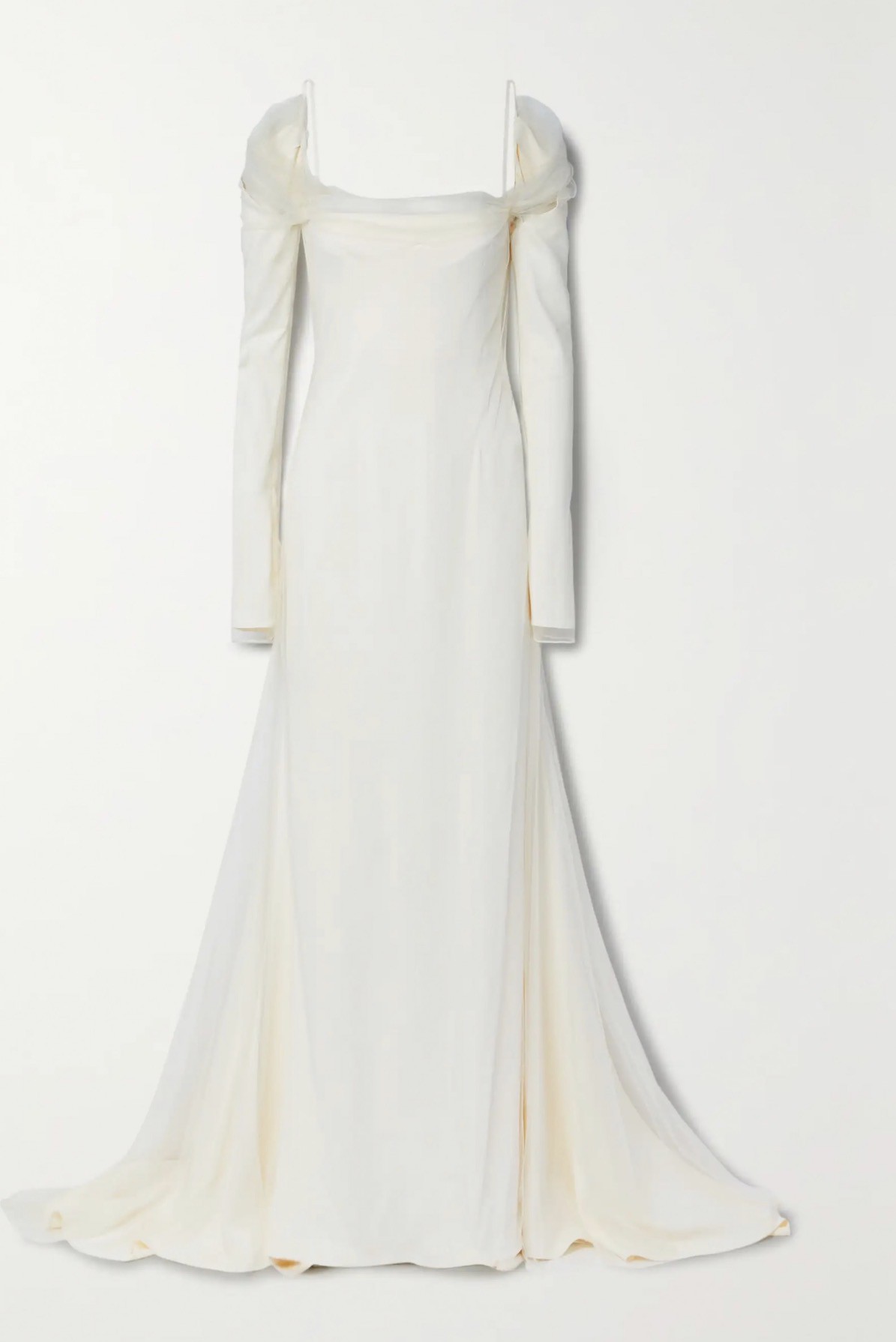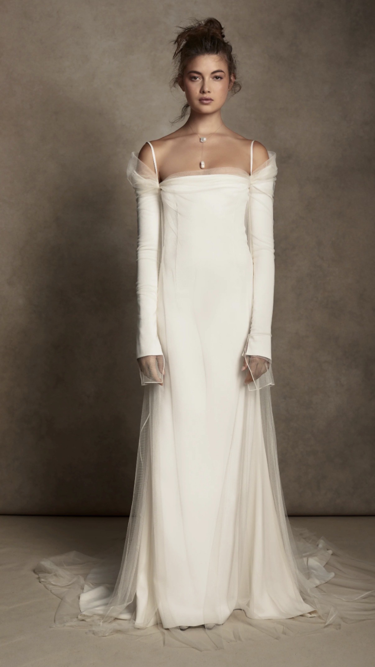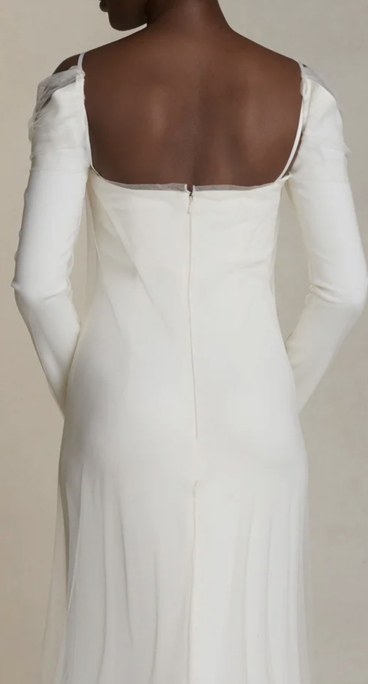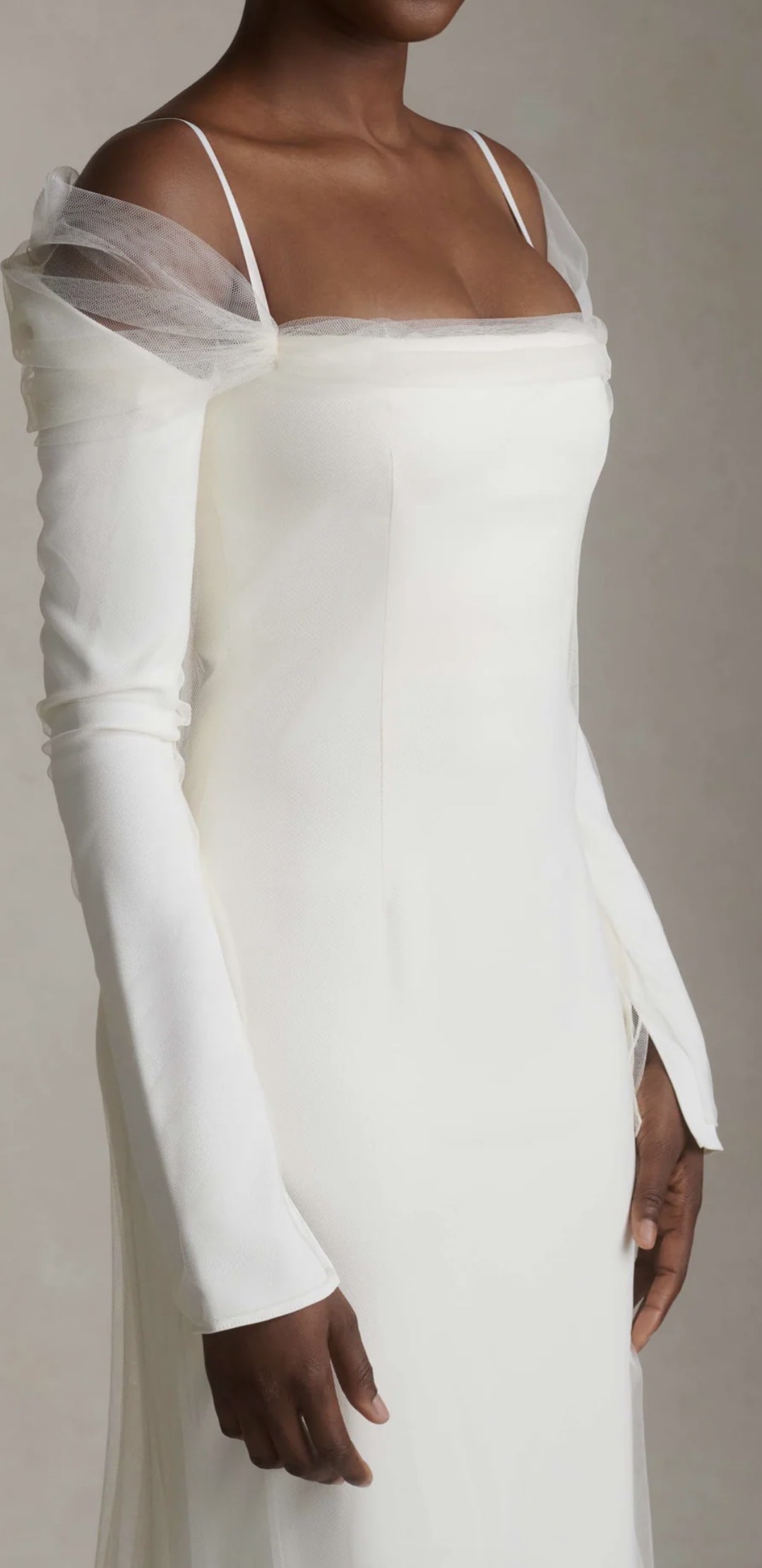 Stretch Cady off the shoulder gown with extended tulle overlay. Squared neckline accented by draped high tulle, long sleeves lightly bound to narrow satin ribbon straps. Center back external zipper and soft internal bustier with grosgrain waistband belt and three hook positions for support.