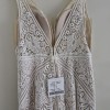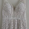 All-natural takes on a luxurious new meaning in this simple yet ornately detailed design from Essense of Australia. Matte graphic laces feature unique, linear patterns throughout the silhouette, popping over the neutral Imperial crepe fabric for a nude illusion that still keeps you covered. The V-neckline and wide straps are framed by delicate linear banding, also seen over the waistline and the mirroring V-side cutouts which are masked with illusion tulle for added support. Finally, the open V-back closes at the base and zips beneath a row of neutral-covered buttons for an extra pop of detail. A slight, easy train gently flares out toward the hem for that extra-special aisle moment.