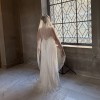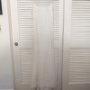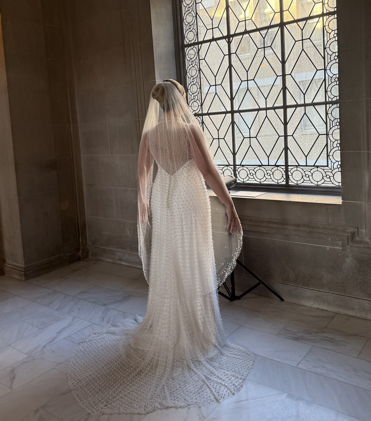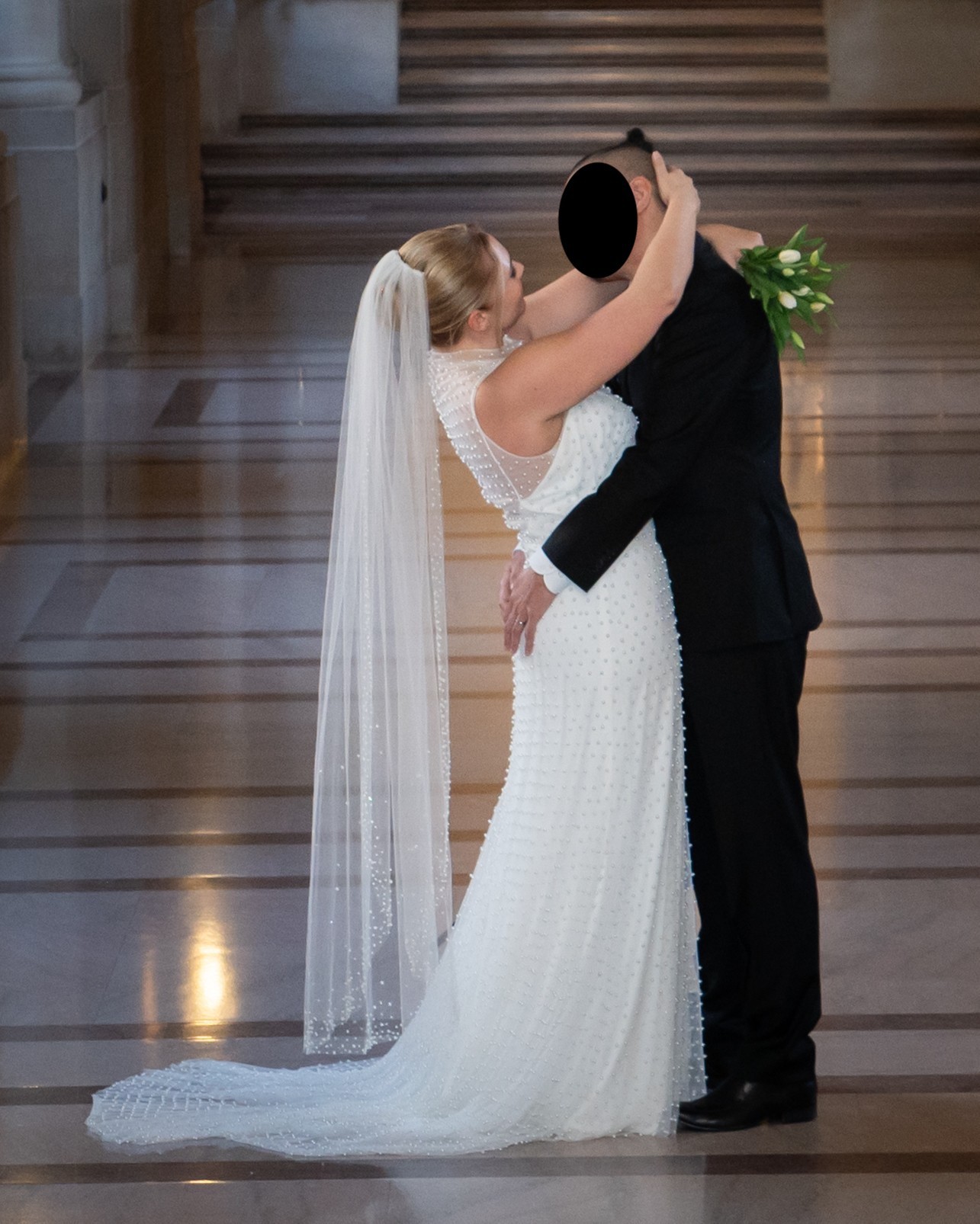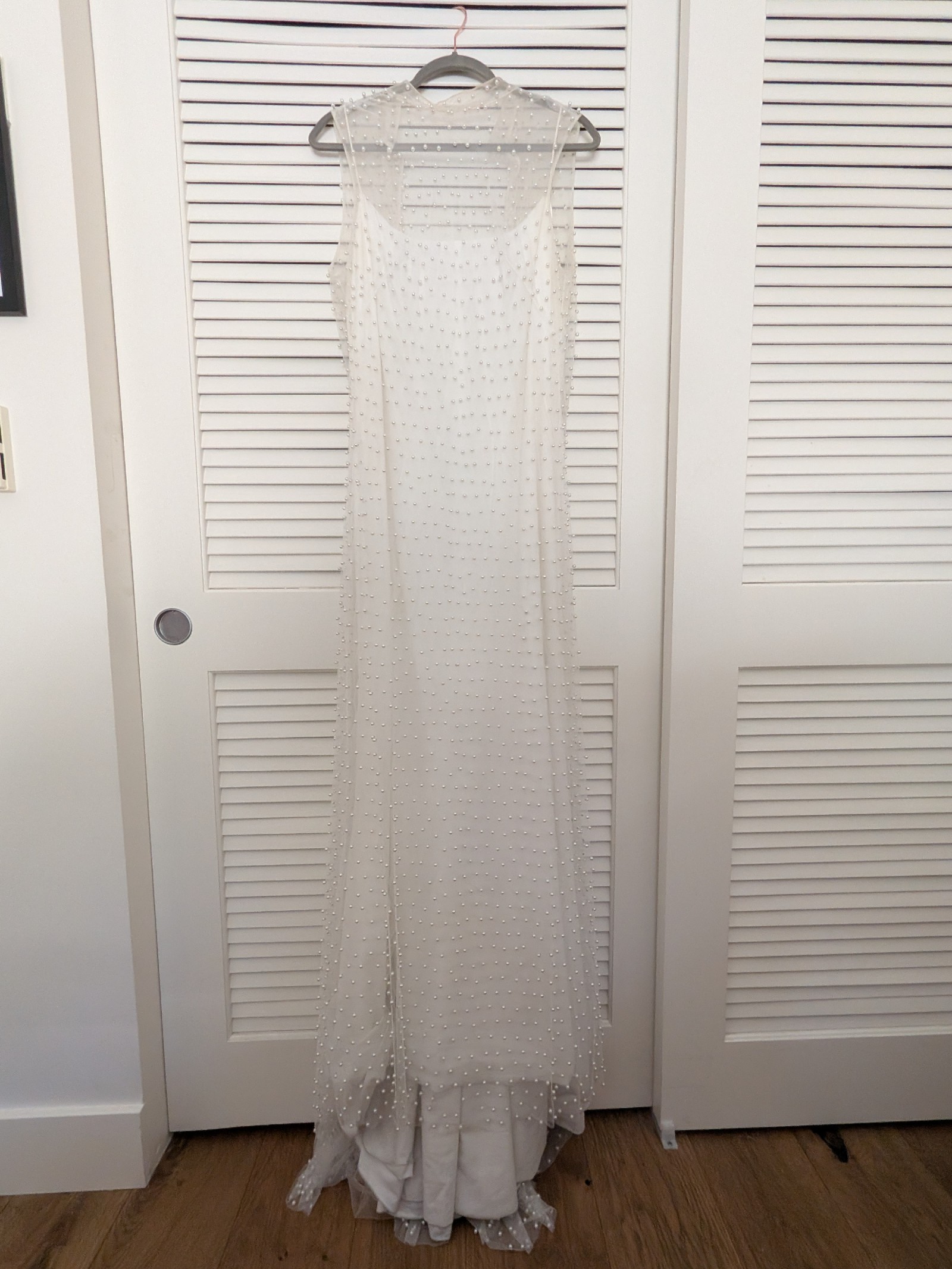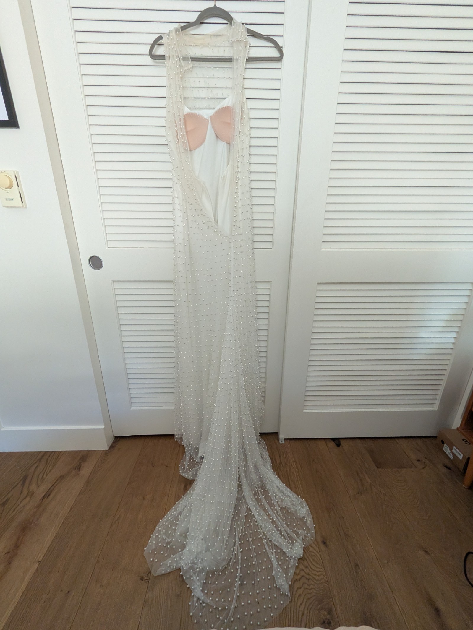 Used for just 5 hours for our courthouse wedding and then dinner with friends. Spent $1,500 for alterations to repair missing pearls, strengthen the back loops and pearls, add bust cups, hem, shorten straps, and add a sheer panel on the lower back portion (to hide my back rolls)