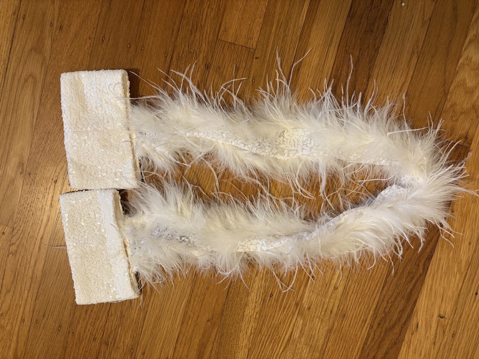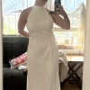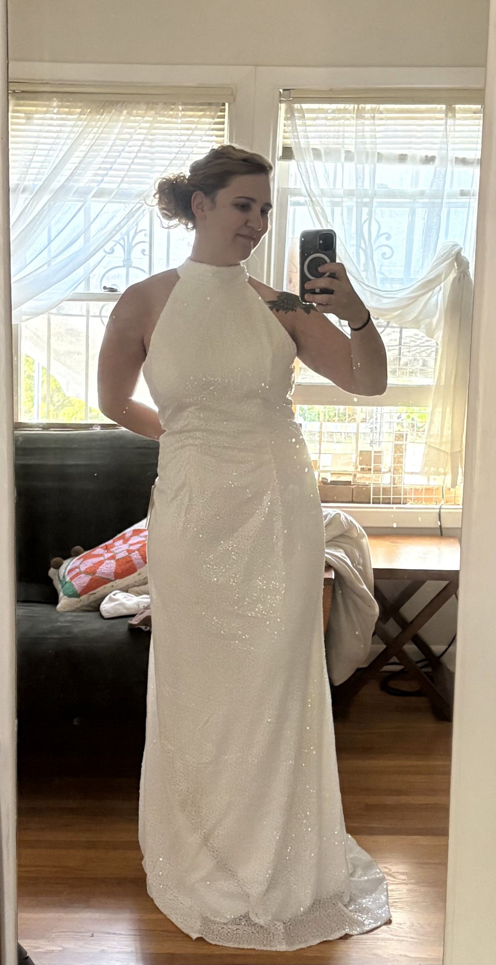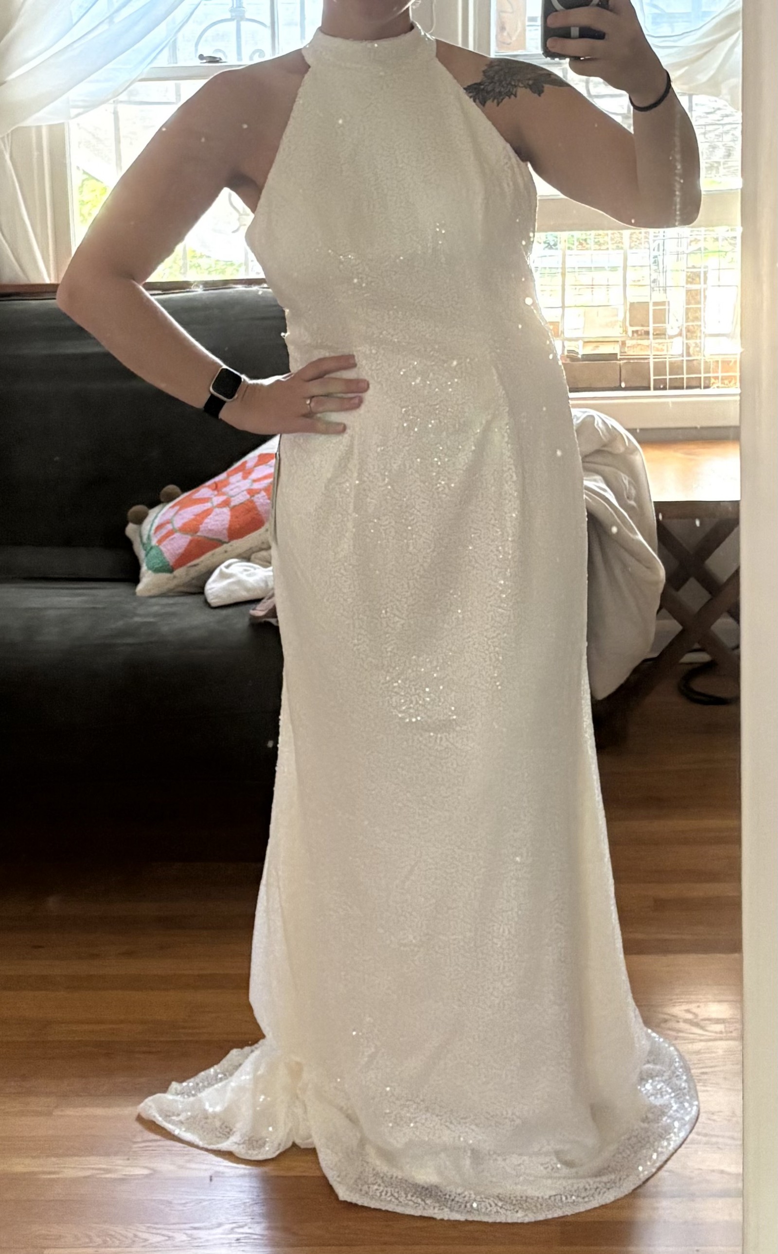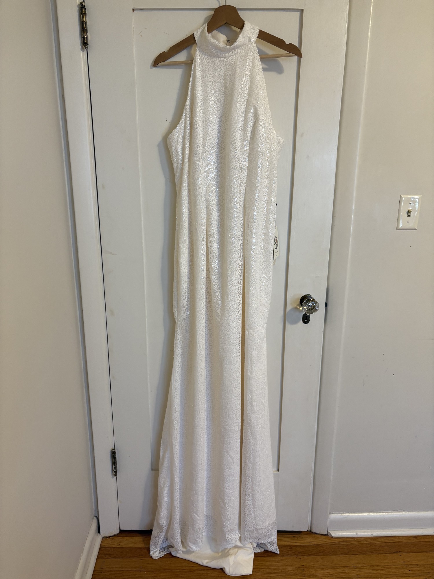 Brand-new, never worn sequined gown from an online retailer (PreppyDress). It's a fun, 70s-esque look with a halter top and open back. Custom-made but fits true to size. Lovely white sequins with a feathered arm accessory. I ordered this for my wedding but decided to go a different route.
