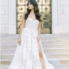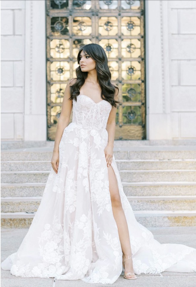 There is a silk skirt underneath as the bottom layer. There is very subtle beading which creates a subtle shimmer. Detachable straps are pictured (once above) but they did not come with the dress.