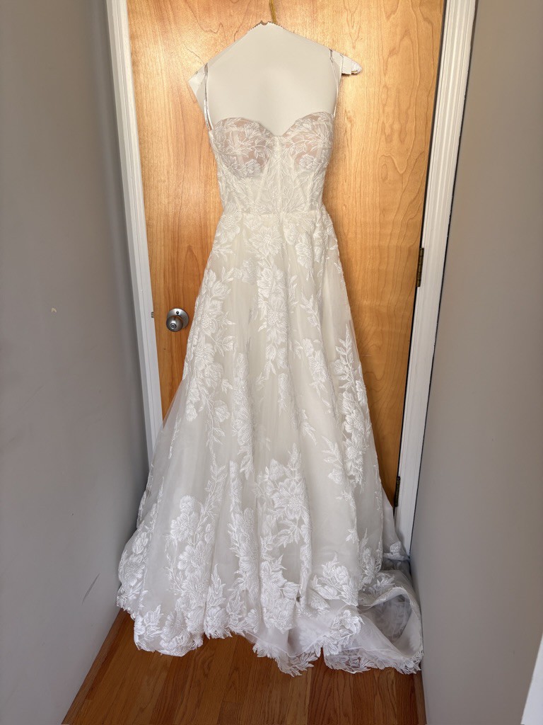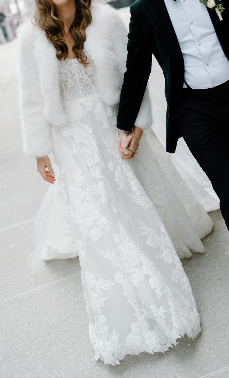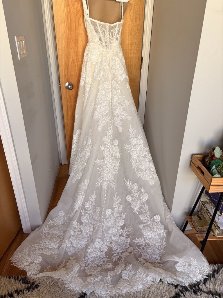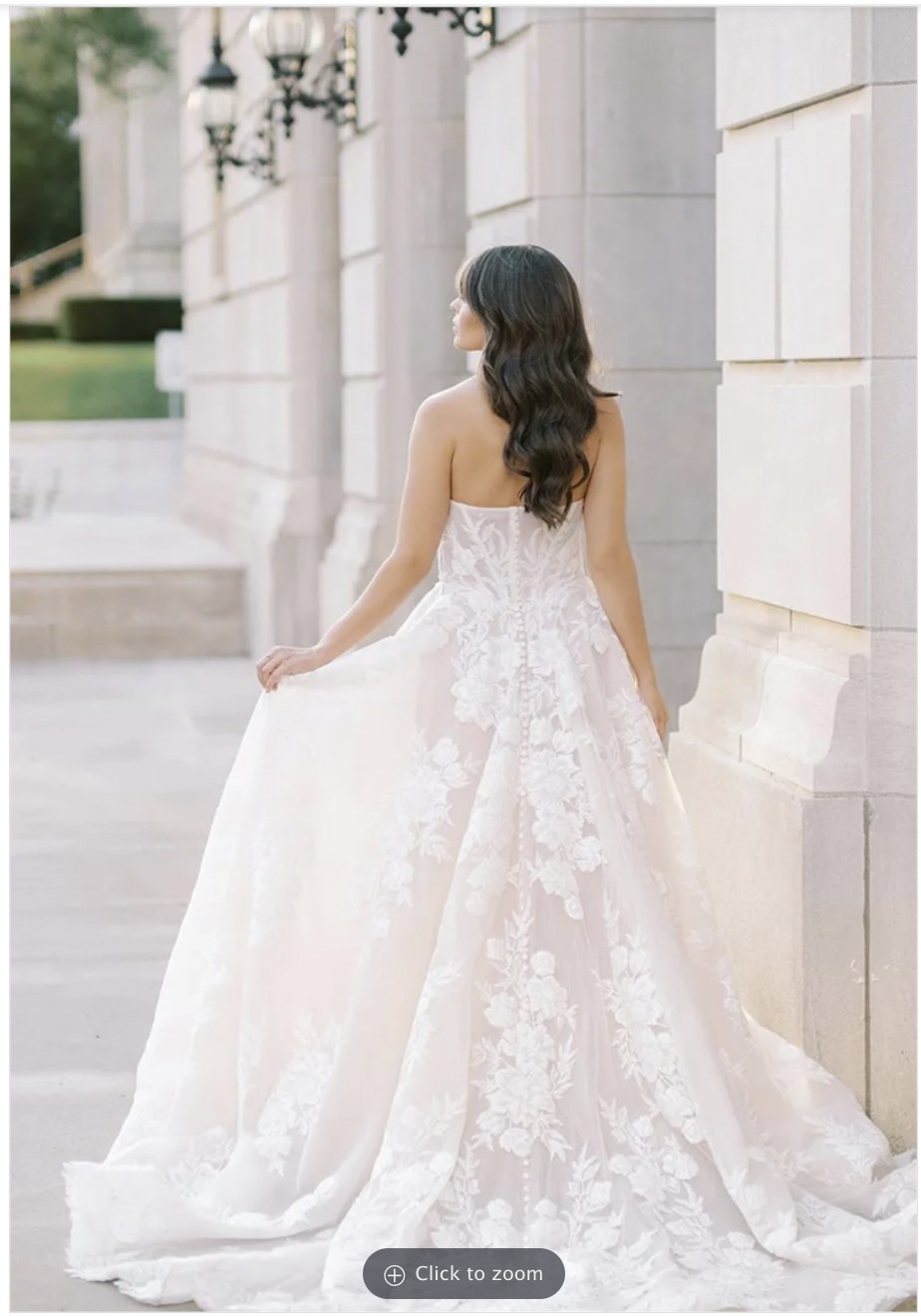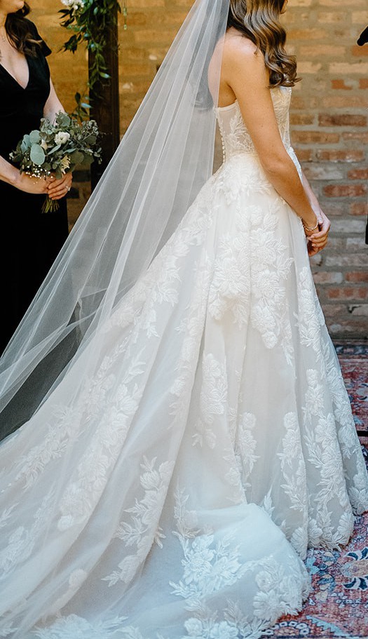 Although the dress has been altered, all the material was left on the dress so it can be undone. It has a french bustle in place. There is also a wrist hoop / wristlet bustle installed to carry the skirt.