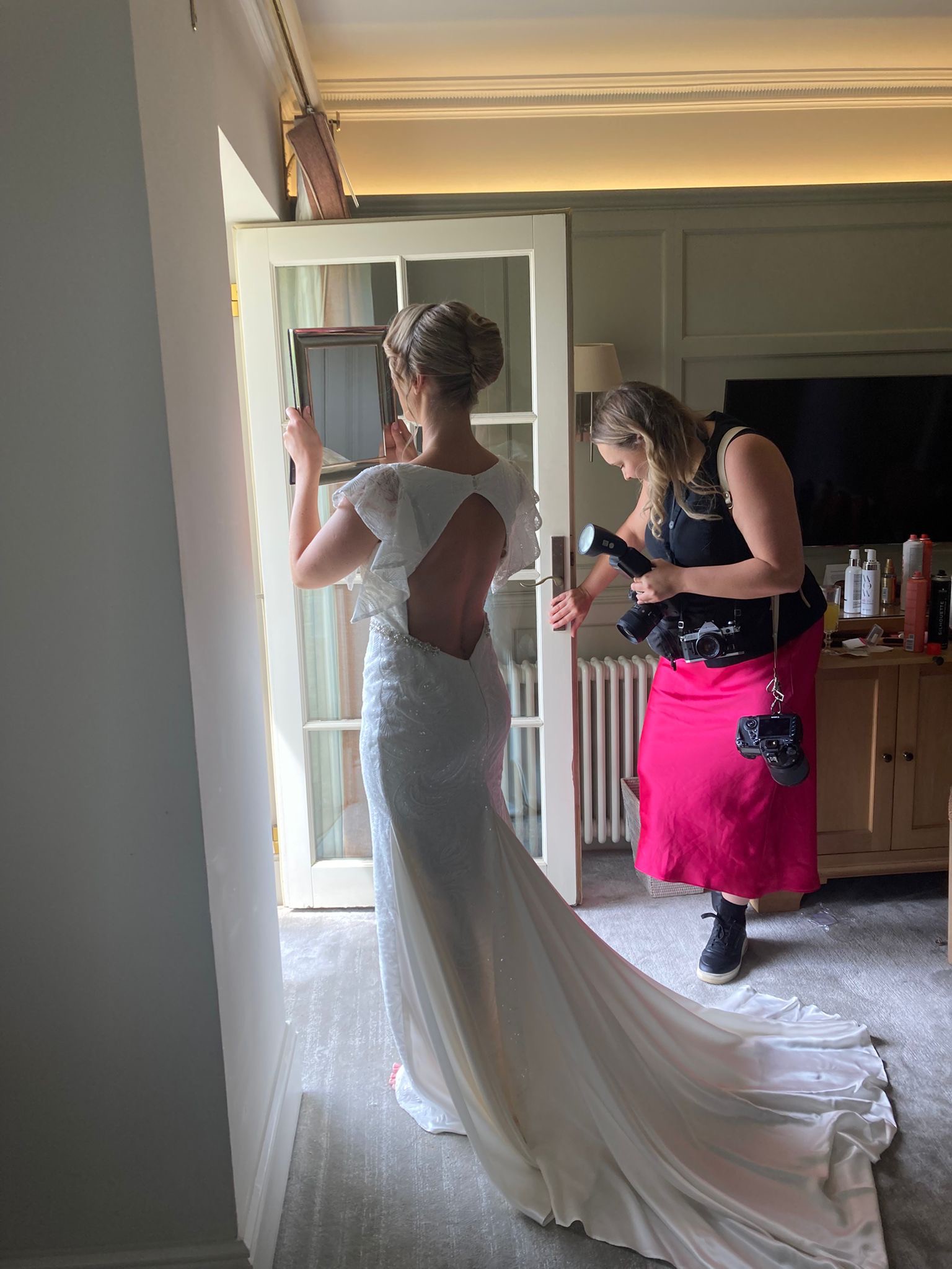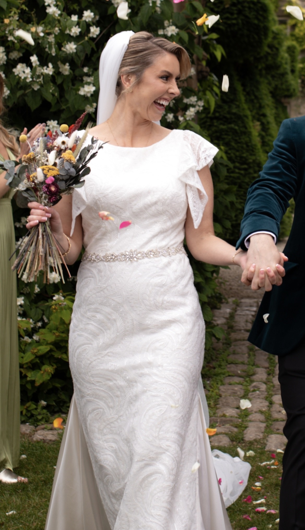 Everything about this dress is so pretty, the design, the material (French lace) with slight sequins and then French silk at the bottom.