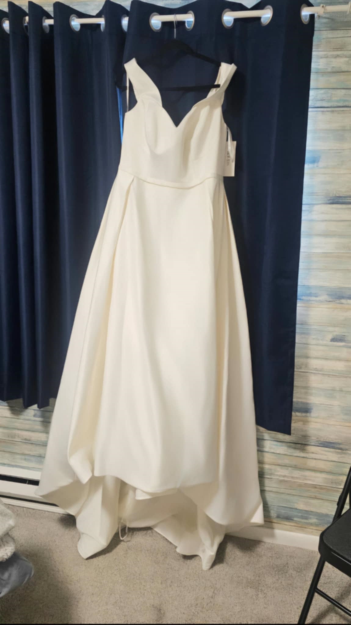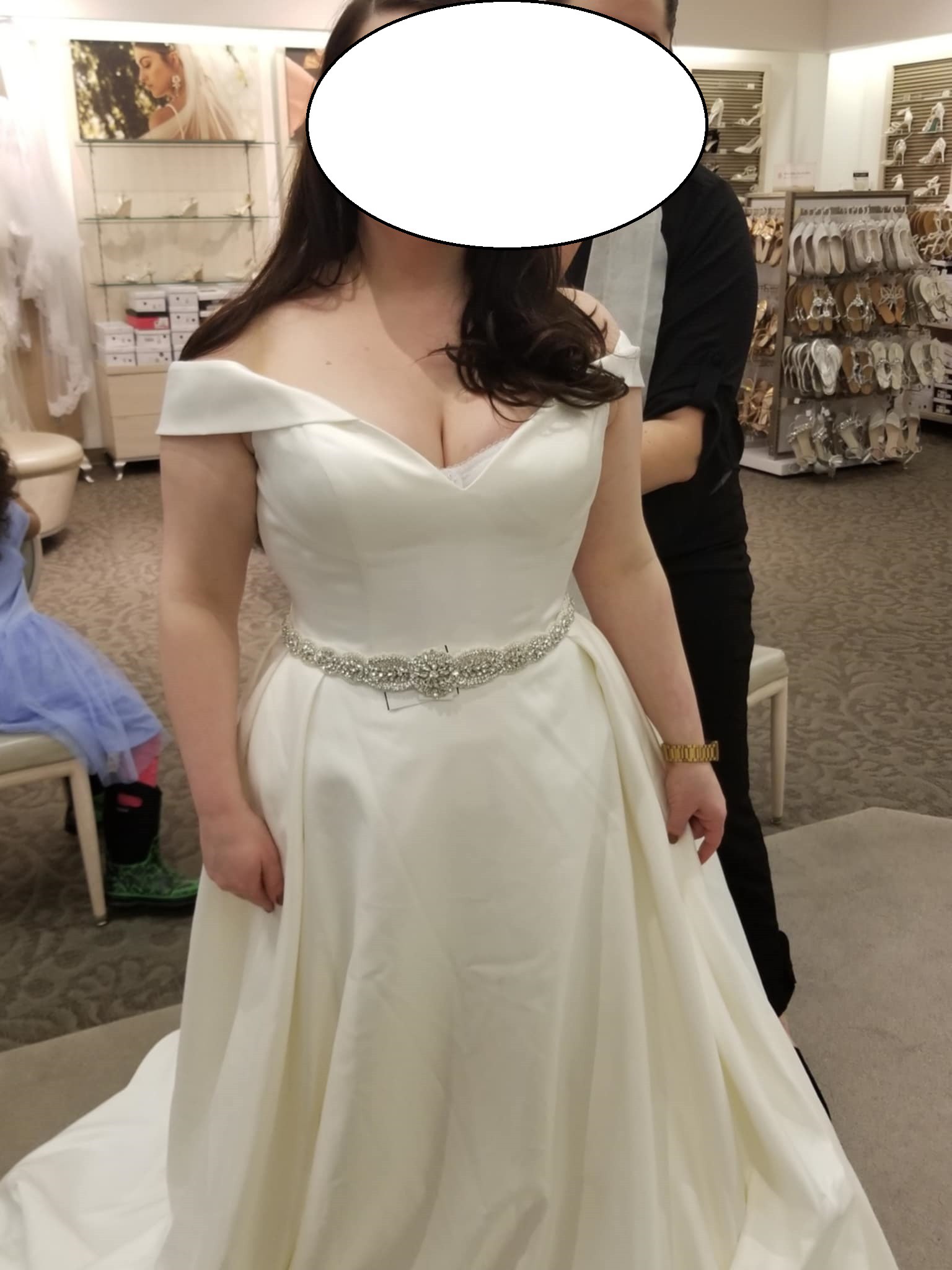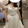 Crafted in luxurious satin, this off-shoulder ball gown hugs your curves before cascading into a dreamy chapel train that whispers romance. Practical yet stunning, hidden side pockets add modern convenience to timeless design. Whether you're walking down a grand aisle or an intimate ceremony, this designer bridal gown promises to make you feel absolutely radiant, confident, and beautifully, uniquely you. Chapel train, no detachable belt. Has only been tried on, has never been altered.