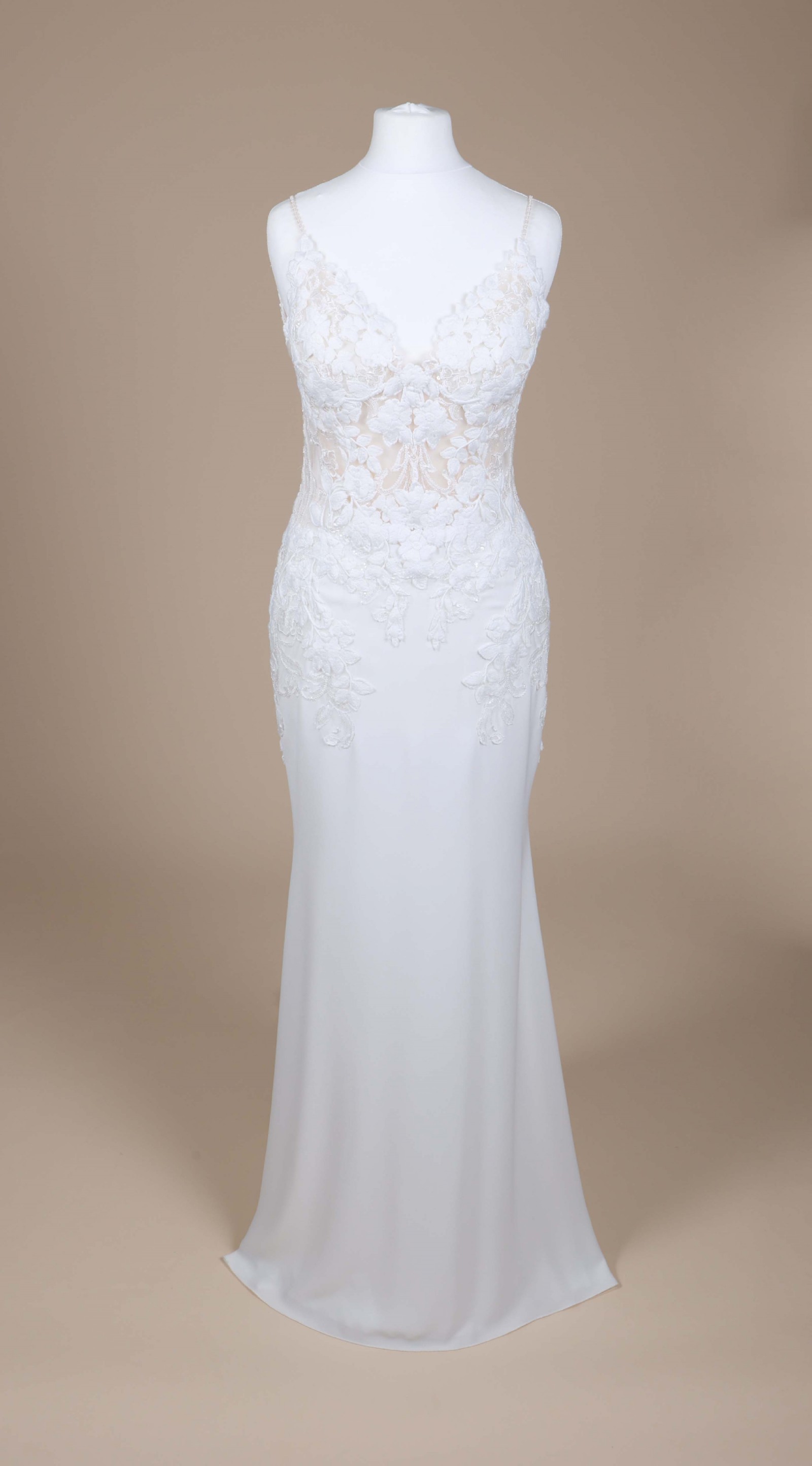 This Enzoani gown channels effortless goddess elegance with its romantic 3D floral embroidered lace and
