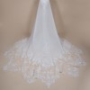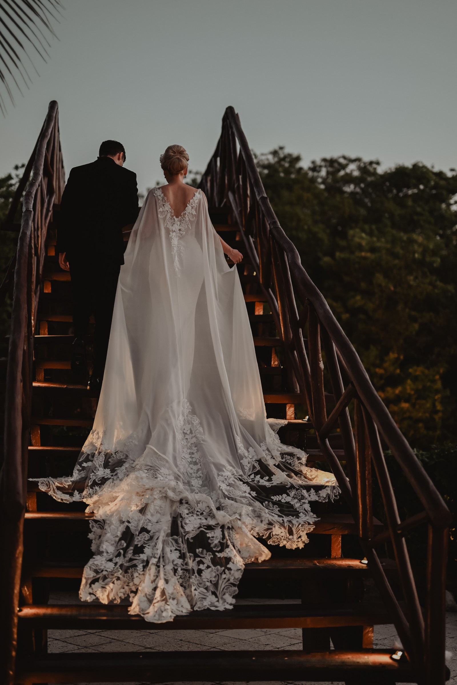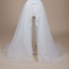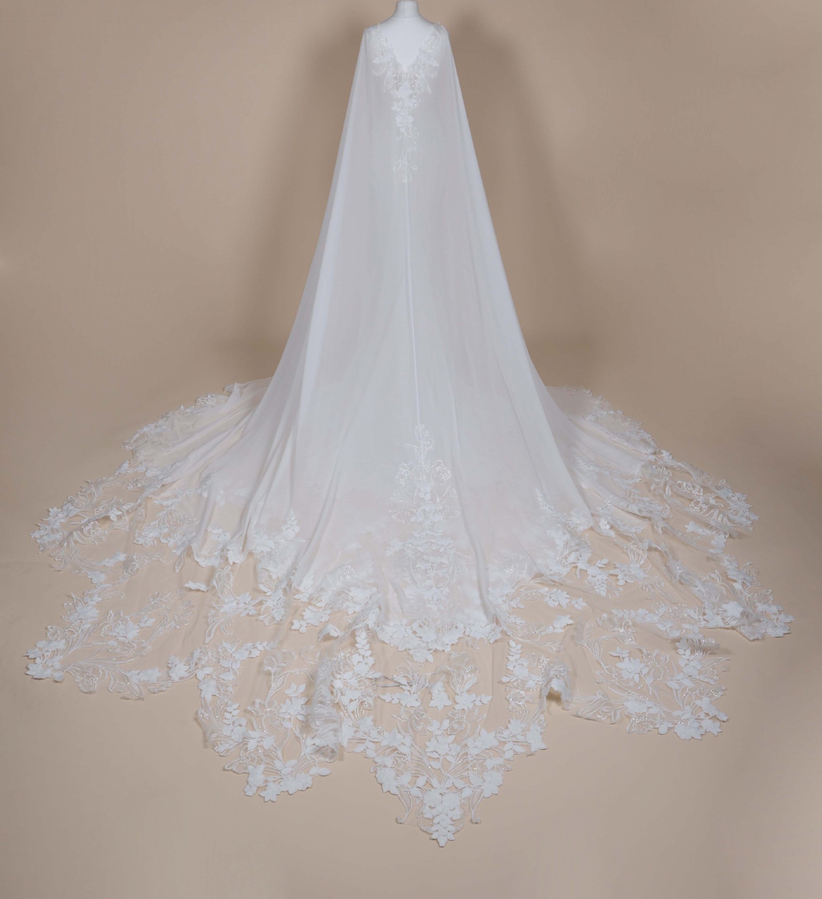 Includes dress, detachable extended train, detachable cape, overskirt and veil.
