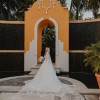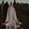 The gown comes with two dramatic detachable elements: a light chiffon cape that mirrors the gown’s