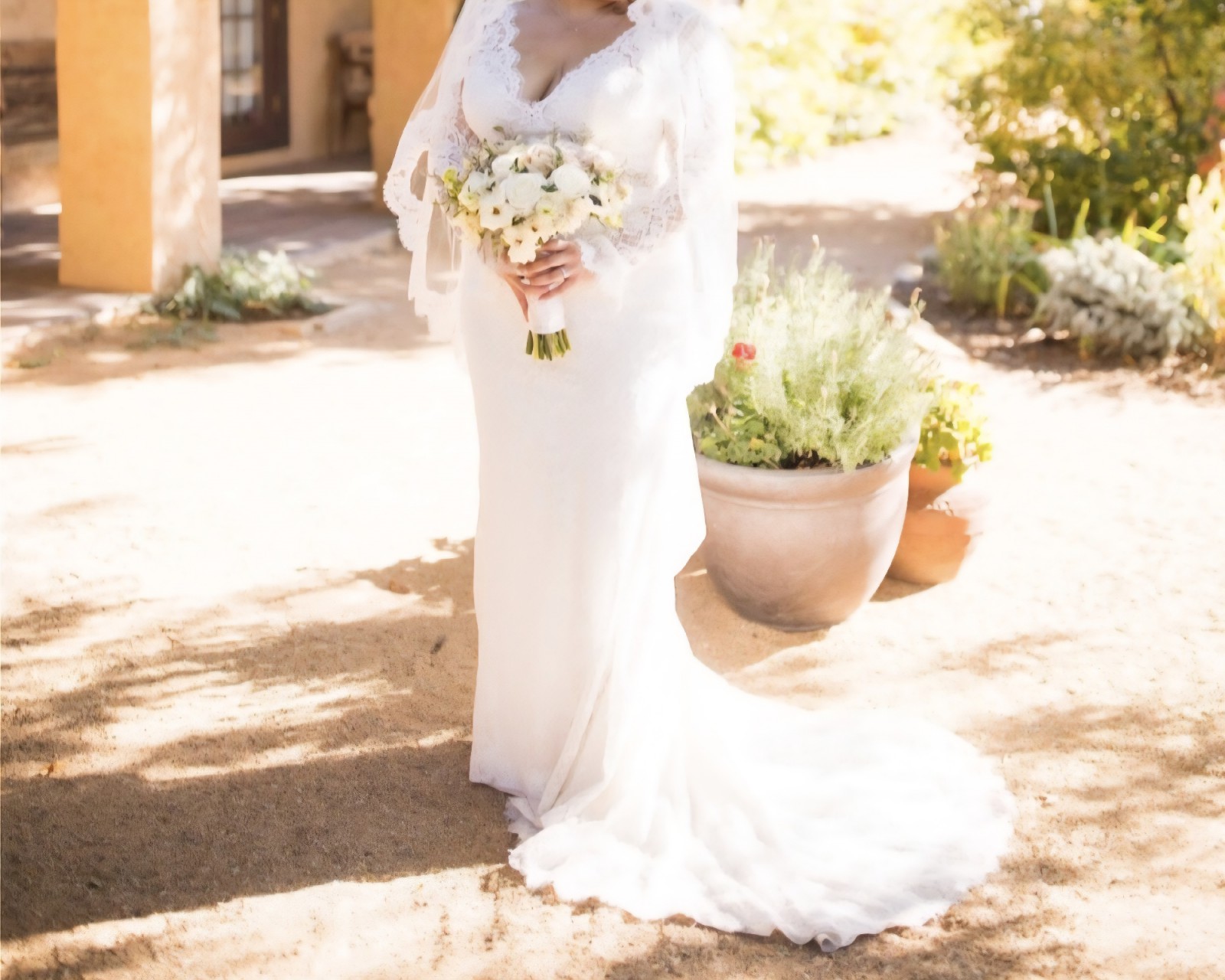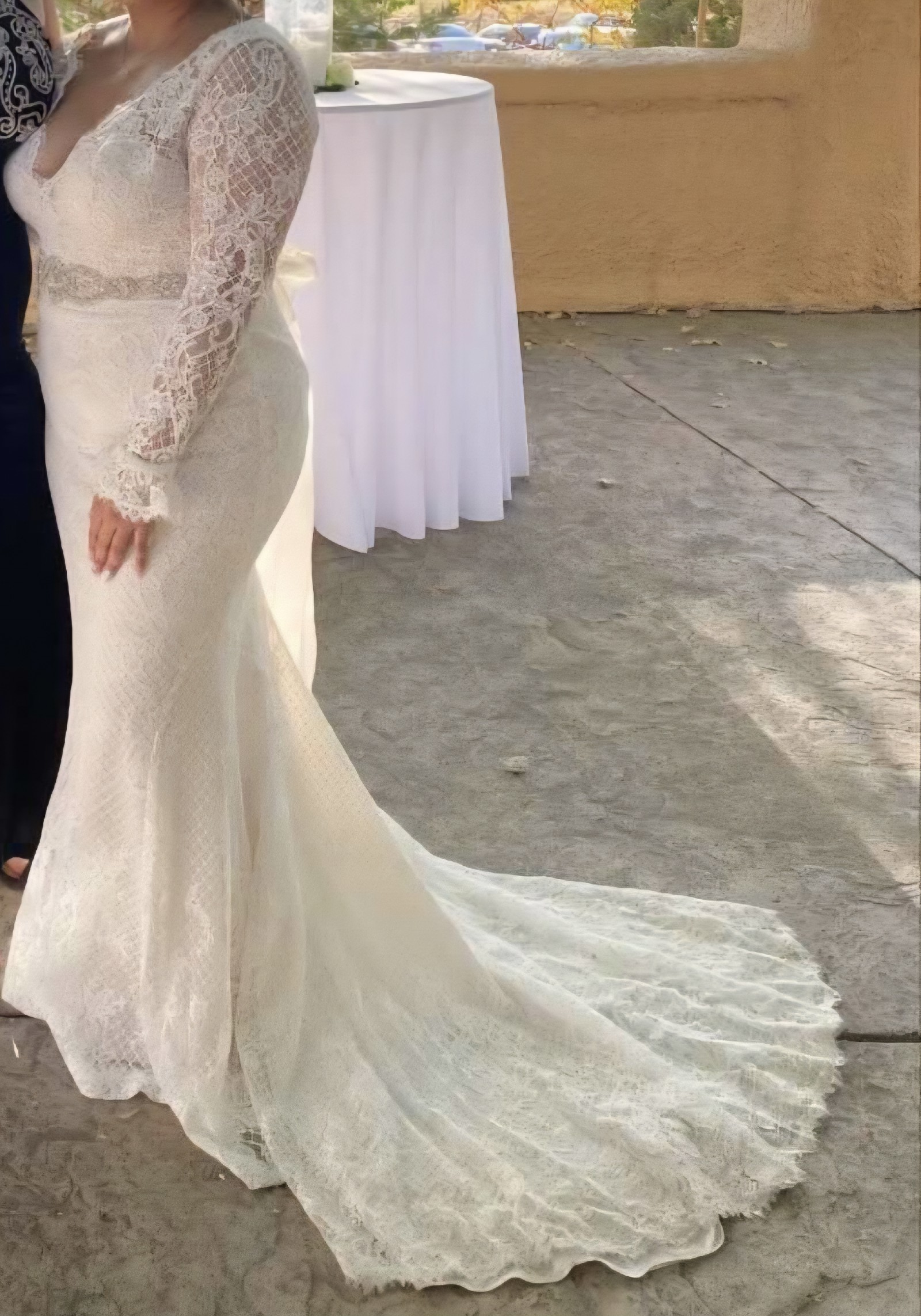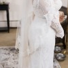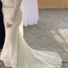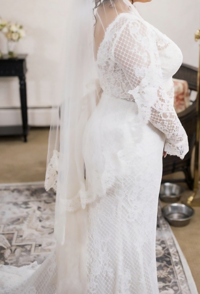This sleeved boho wedding dress is comprised of allover lace, with sheer lace comprising the long sleeves, bell cuffs, V-back, and V-neckline. Sheath silhouette lined with York jersey for a luxe feel. Finished with covered buttons and zipper closure.