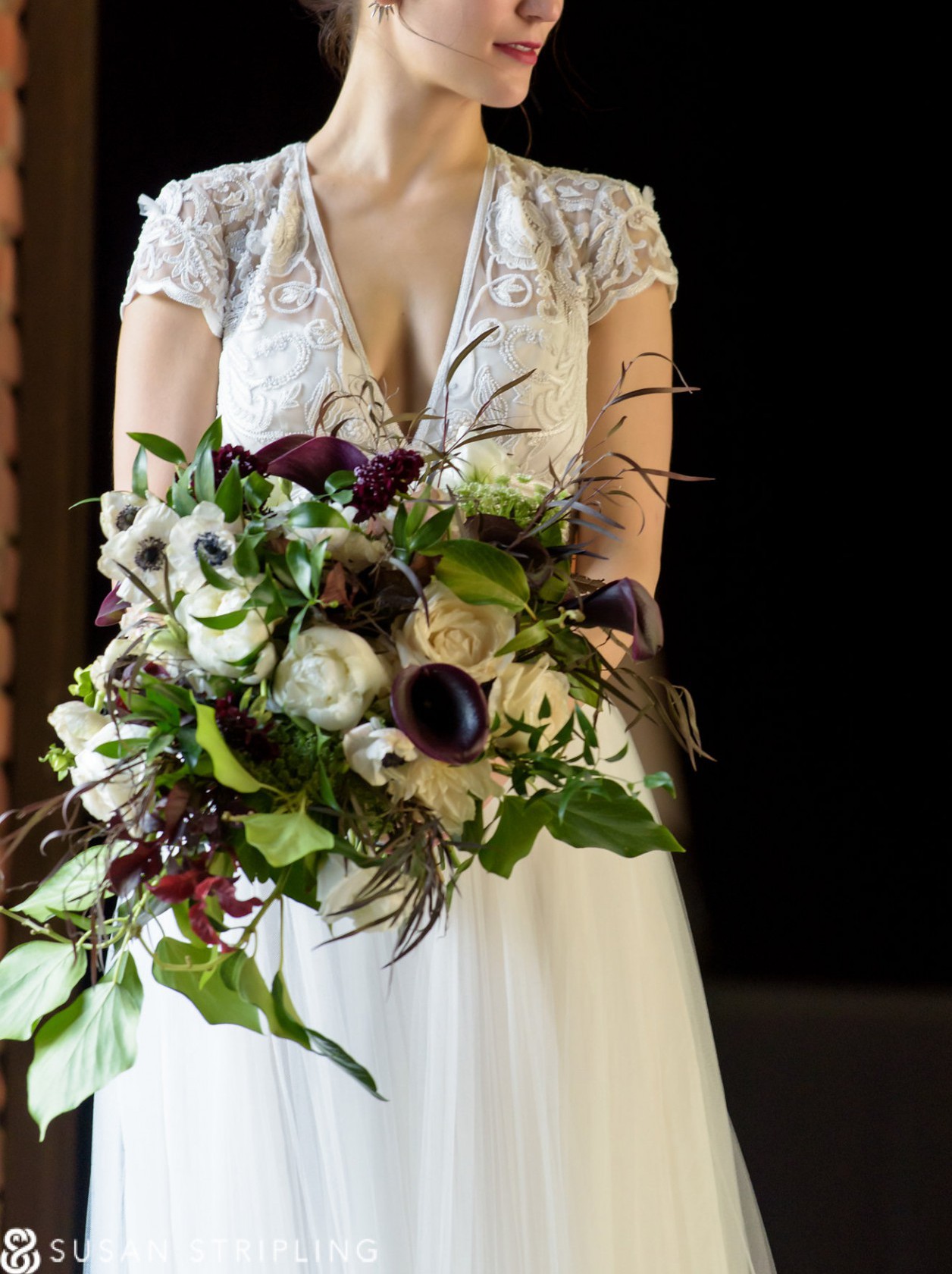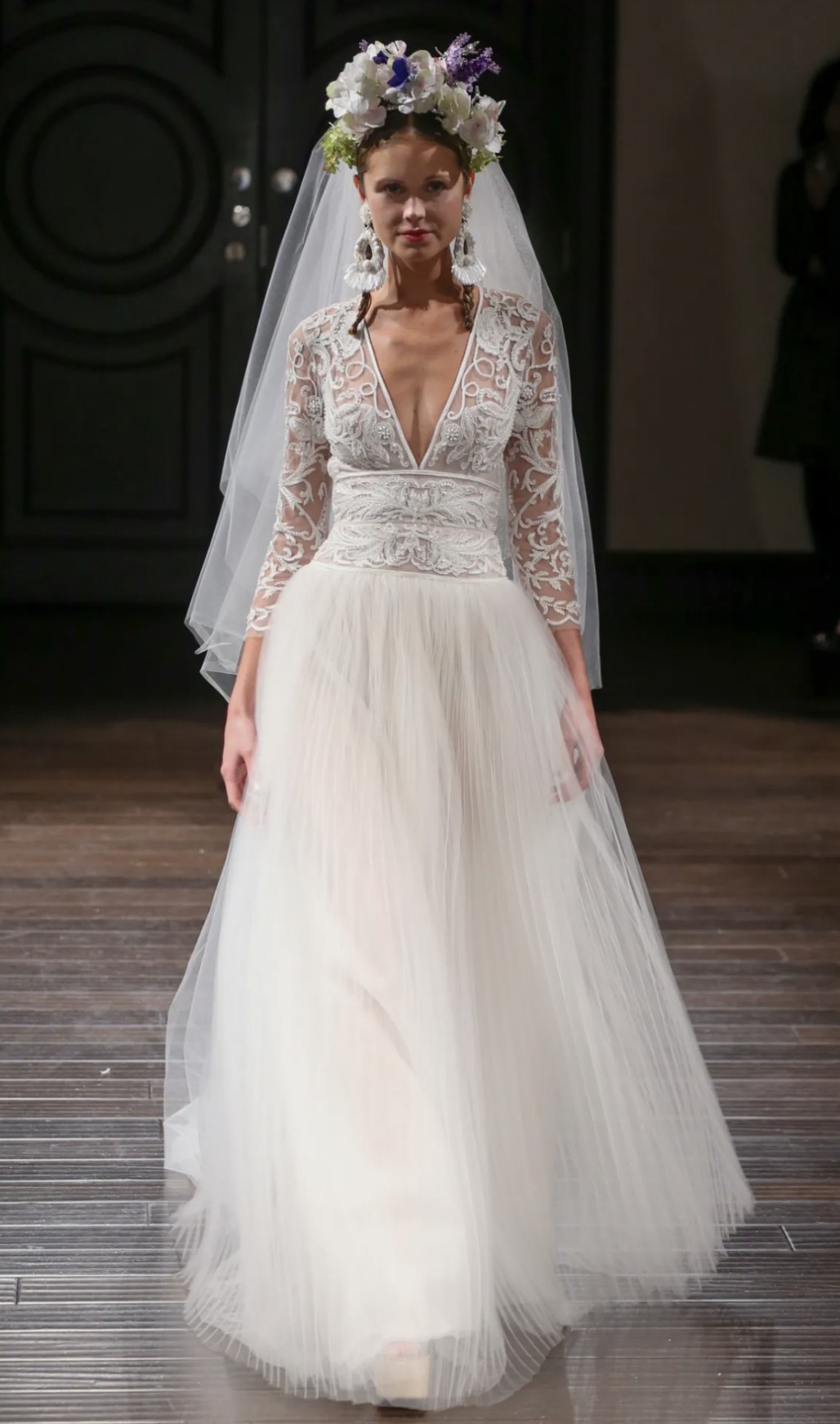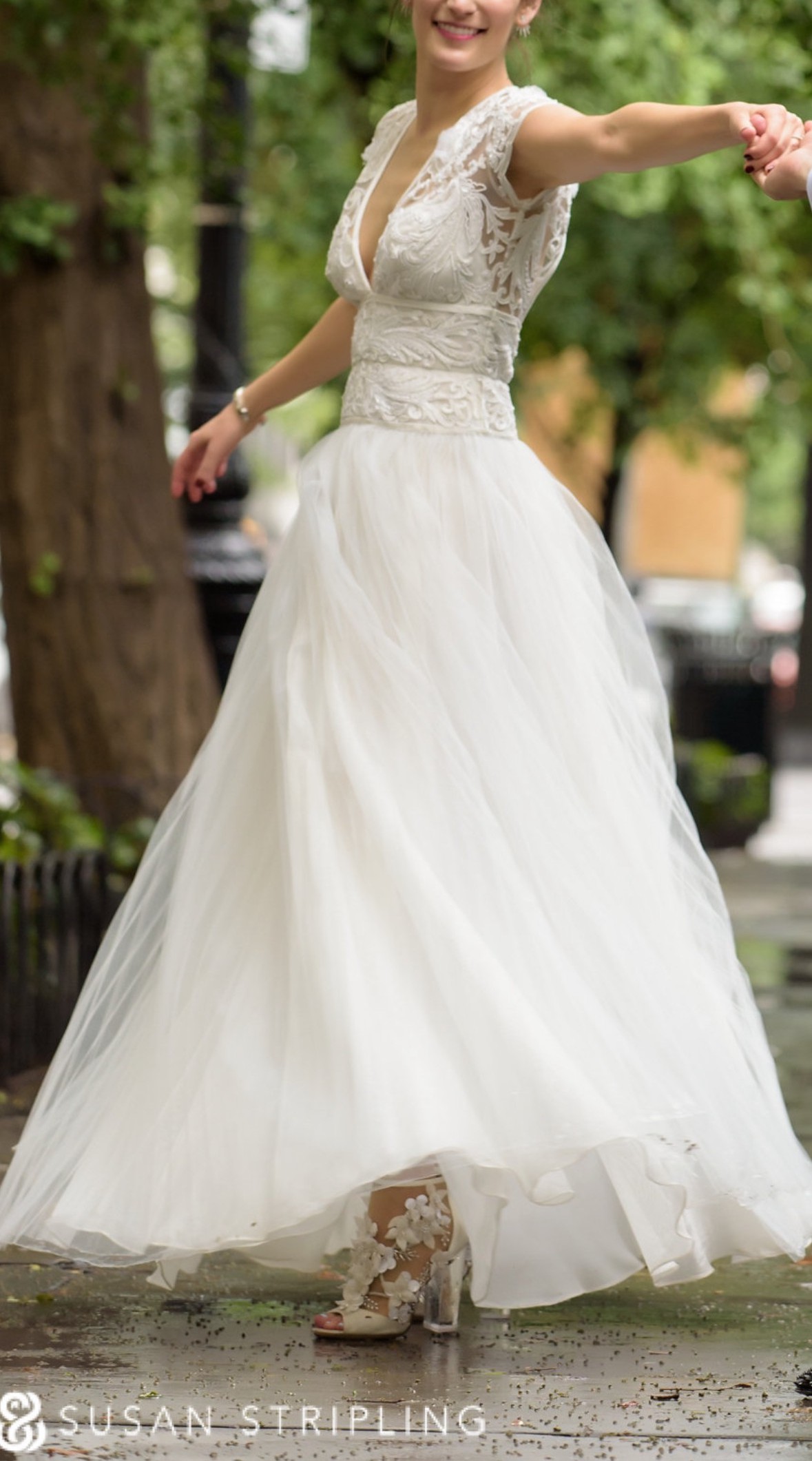 Beautiful Naeem Khan wedding dress featuring a romantic lace bodice with a flattering deep V neckline and a soft, flowing A-line tulle skirt. The silhouette is lightweight and effortless with stunning movement, perfect for both indoor and outdoor weddings.