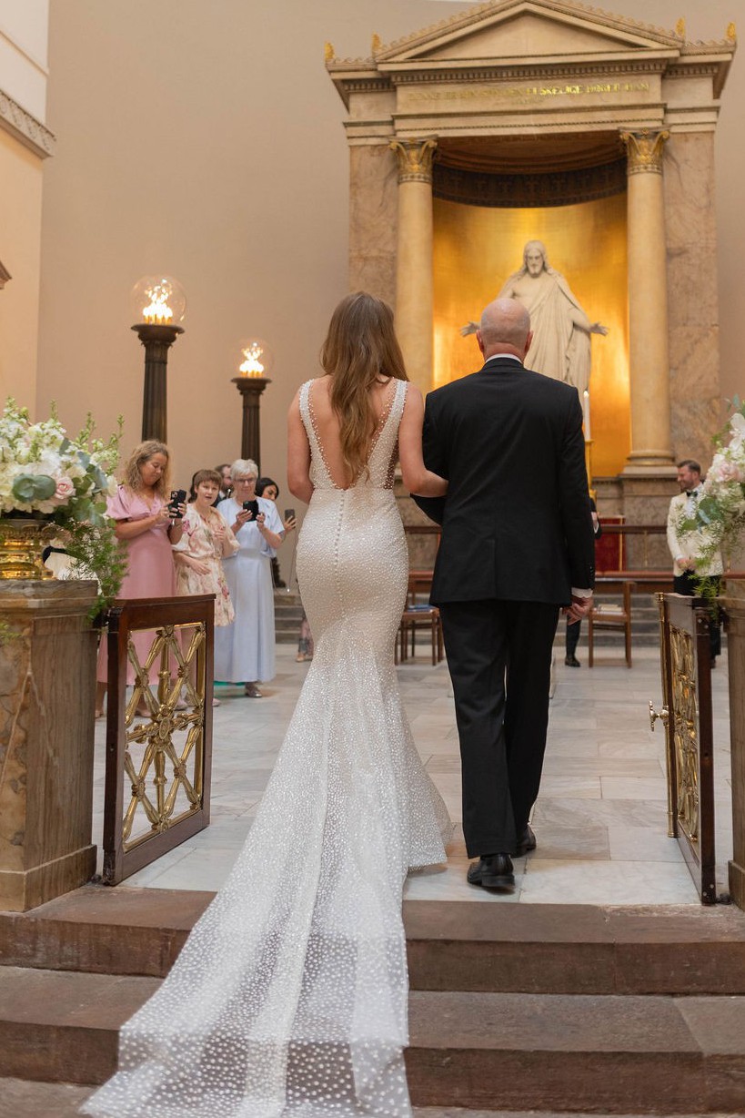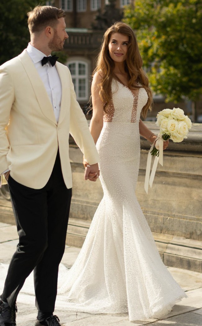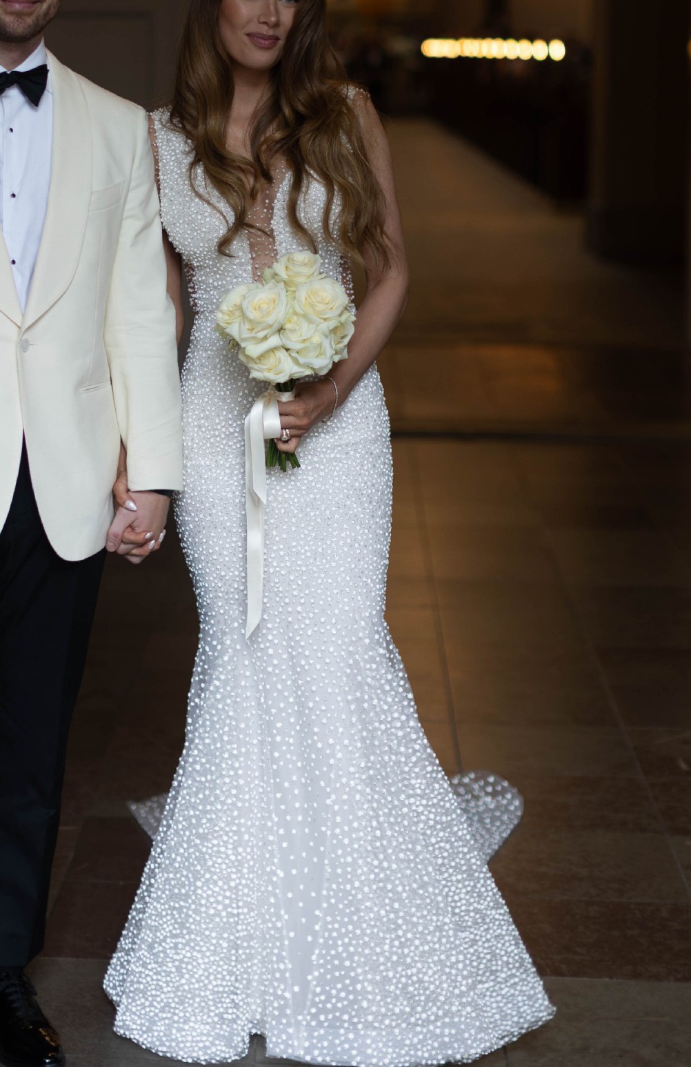 The gown features a sheer nude tulle base adorned with thousands of pearl-like beads that shimmer softly in the light. With its elegant straight neckline, wide beaded straps, and dramatic full train, this dress offers both glamour and grace. The beading covers the entire dress — front, back, and train — with no need for additional accessories.