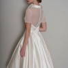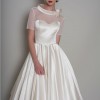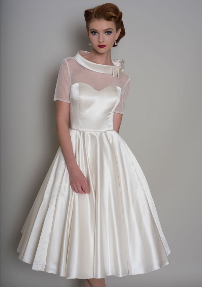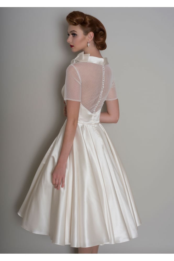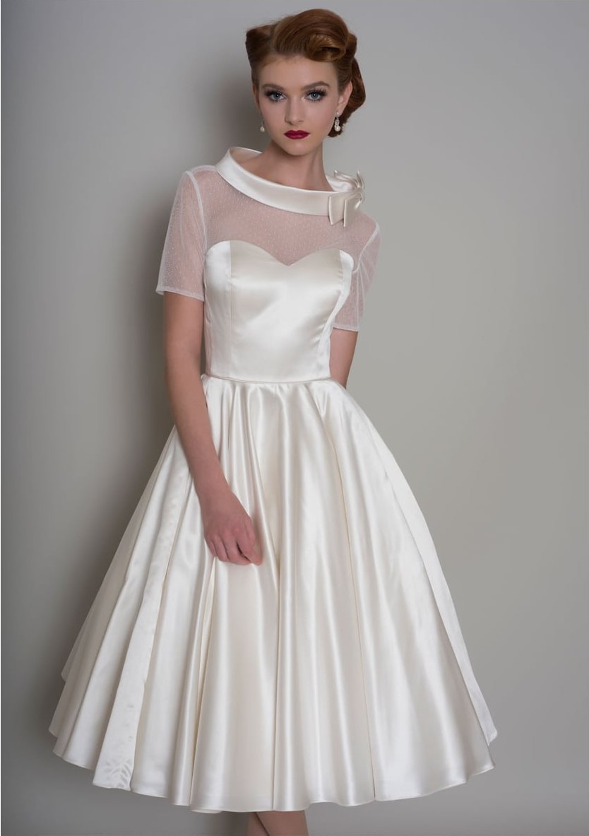 The LouLou Bridal Hattie (LB139) is a vintage-inspired 1950s-style tea-length wedding dress featuring a satin skirt, spotted tulle illusion neckline, and sleeves. Designed with a rolled bateau collar and bow details.
