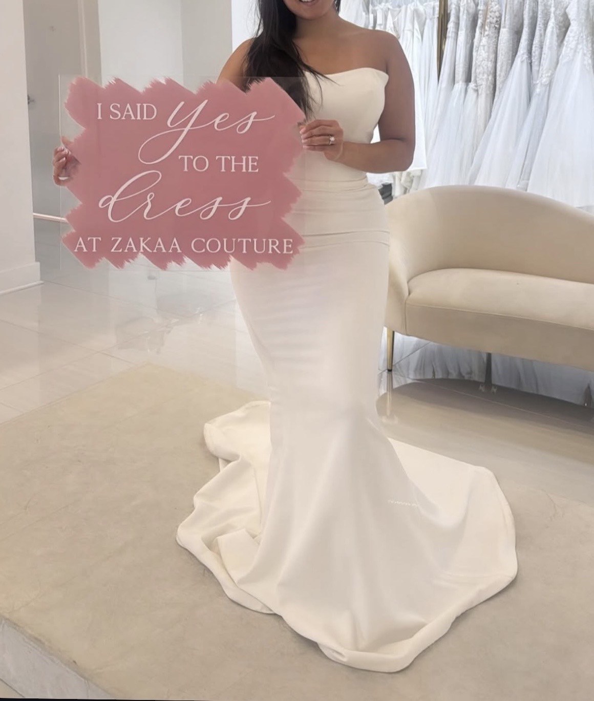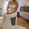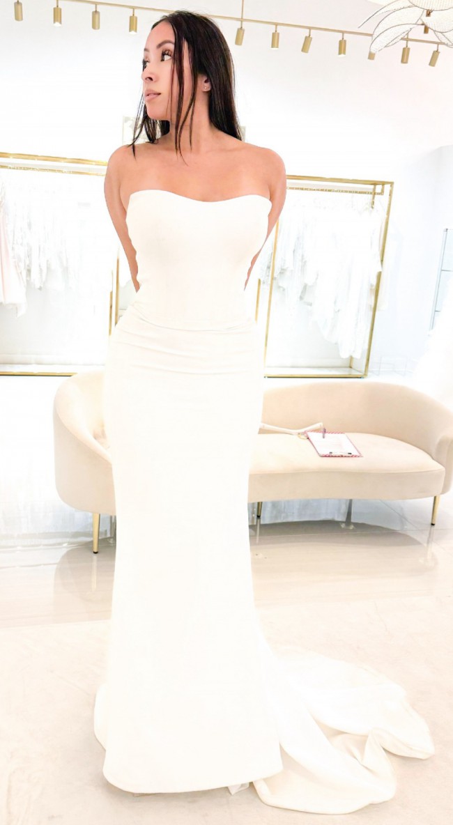 Stunning minimalist strapless fitted gown with an elegant silhouette and soft train.