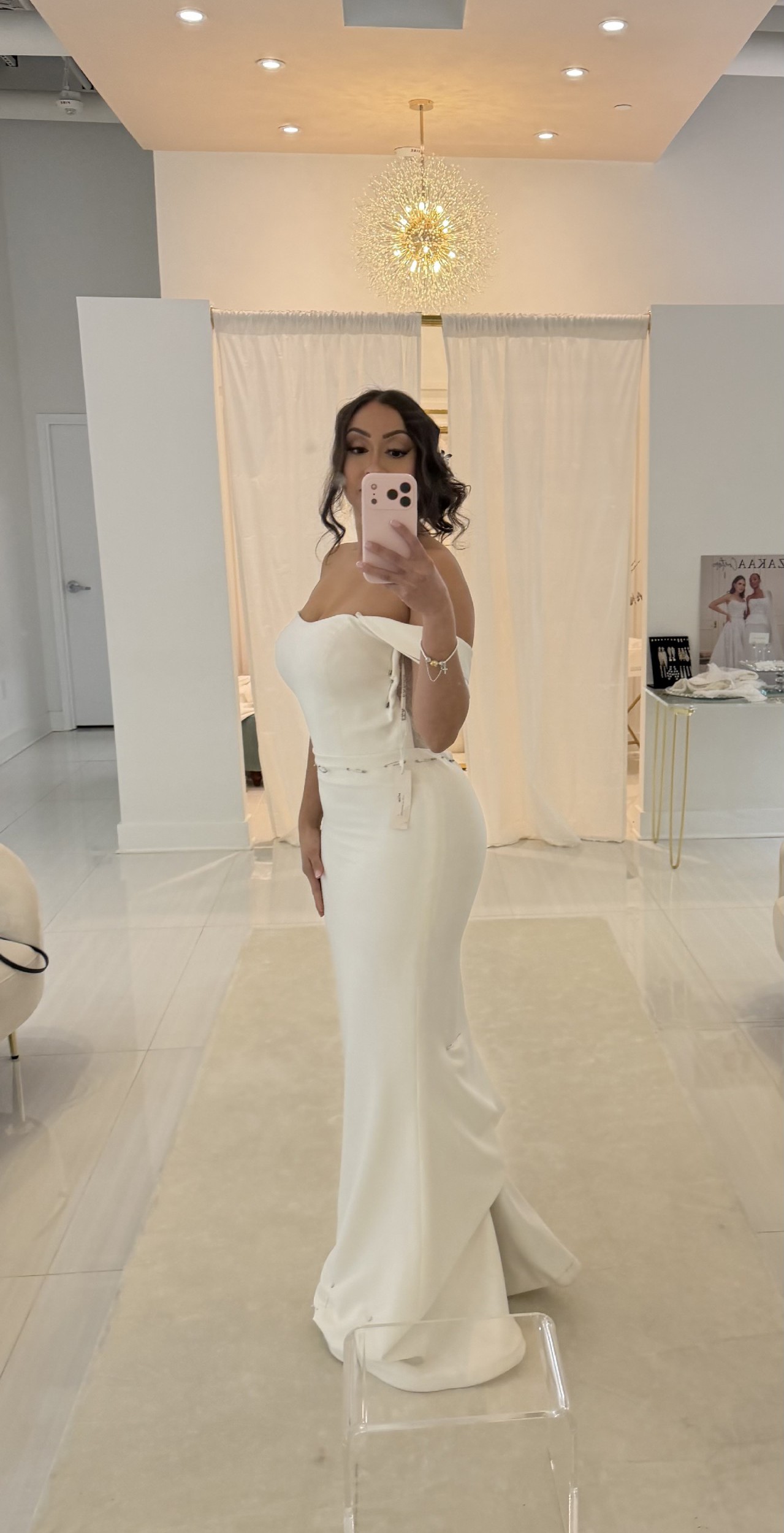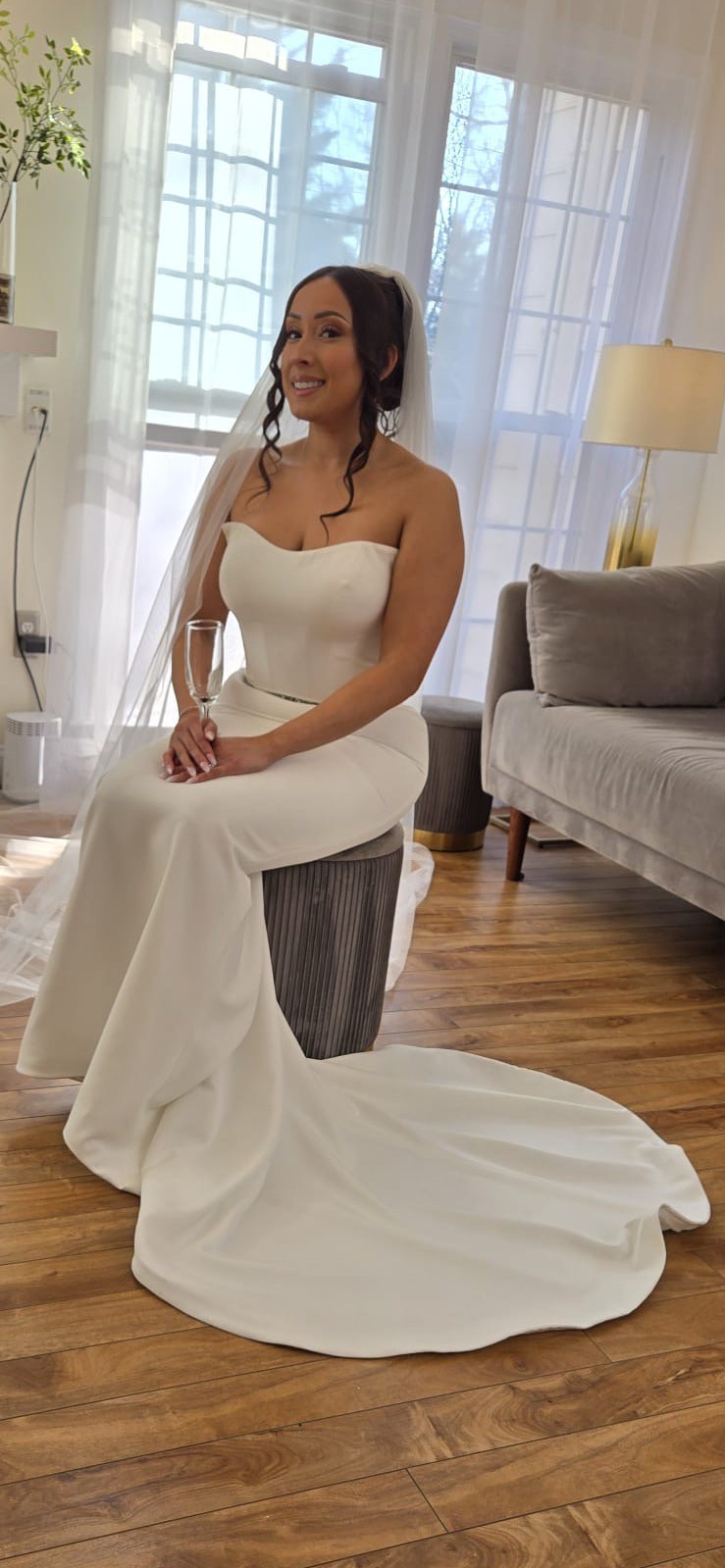 Altered for a tailored fit — happy to provide exact measurements. Perfect for a modern bride looking for a timeless, clean look.