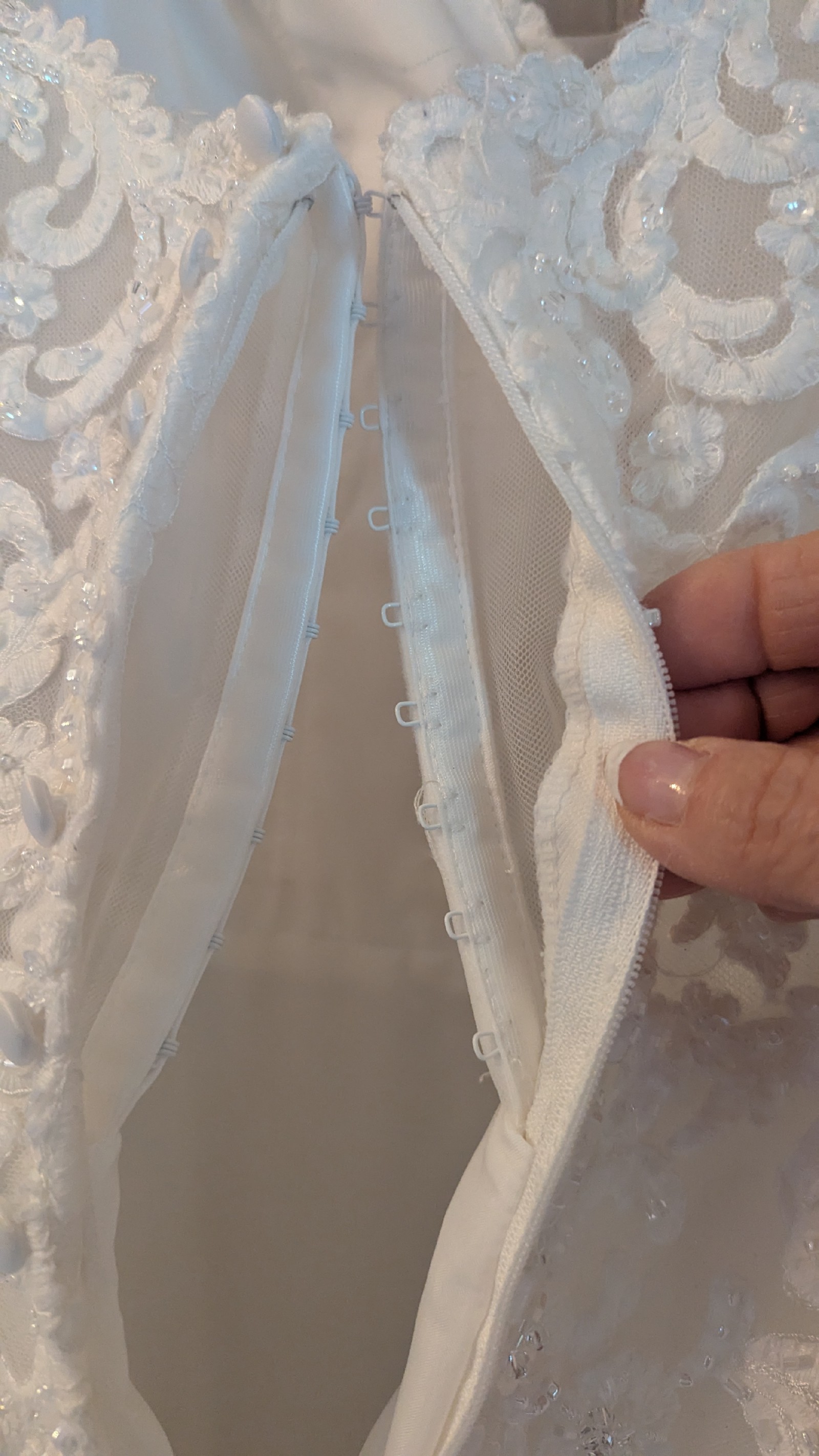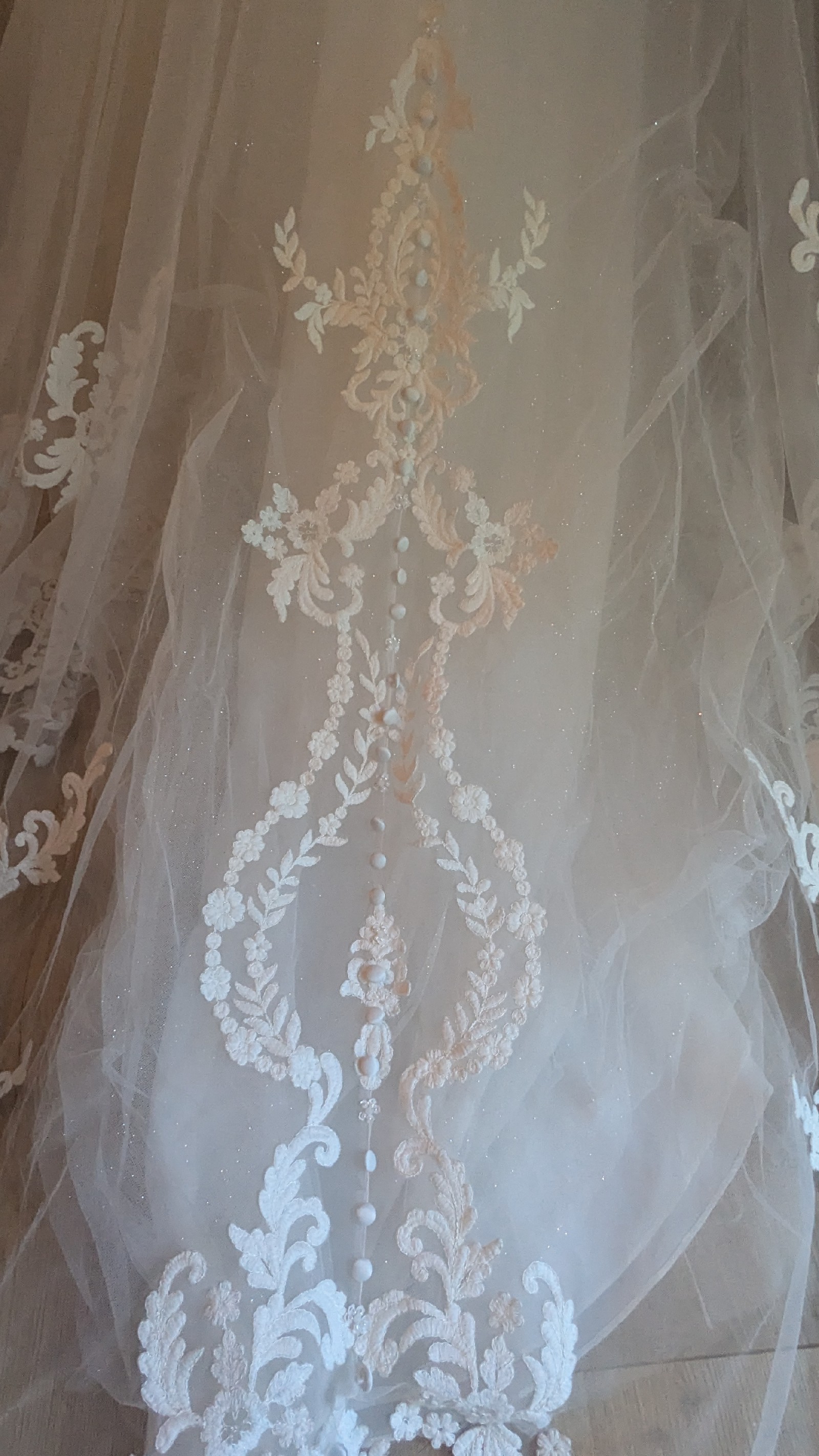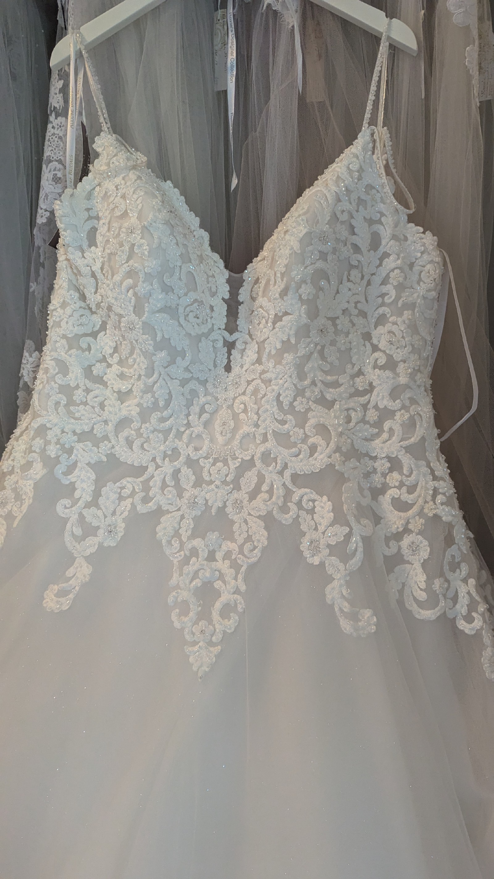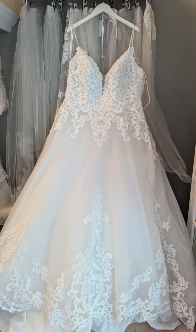 A beautiful and a romantic airline bridal gown from allure bridal spring 2020 wedding dress collection this Lacey dream dress is style 9732. It has comfortable straps and a plunging sweetheart neckline. It's flirty and fun. Perfect for the destination, or formal church wedding. Distress is a store sample. It's in great condition. Never want to any event.