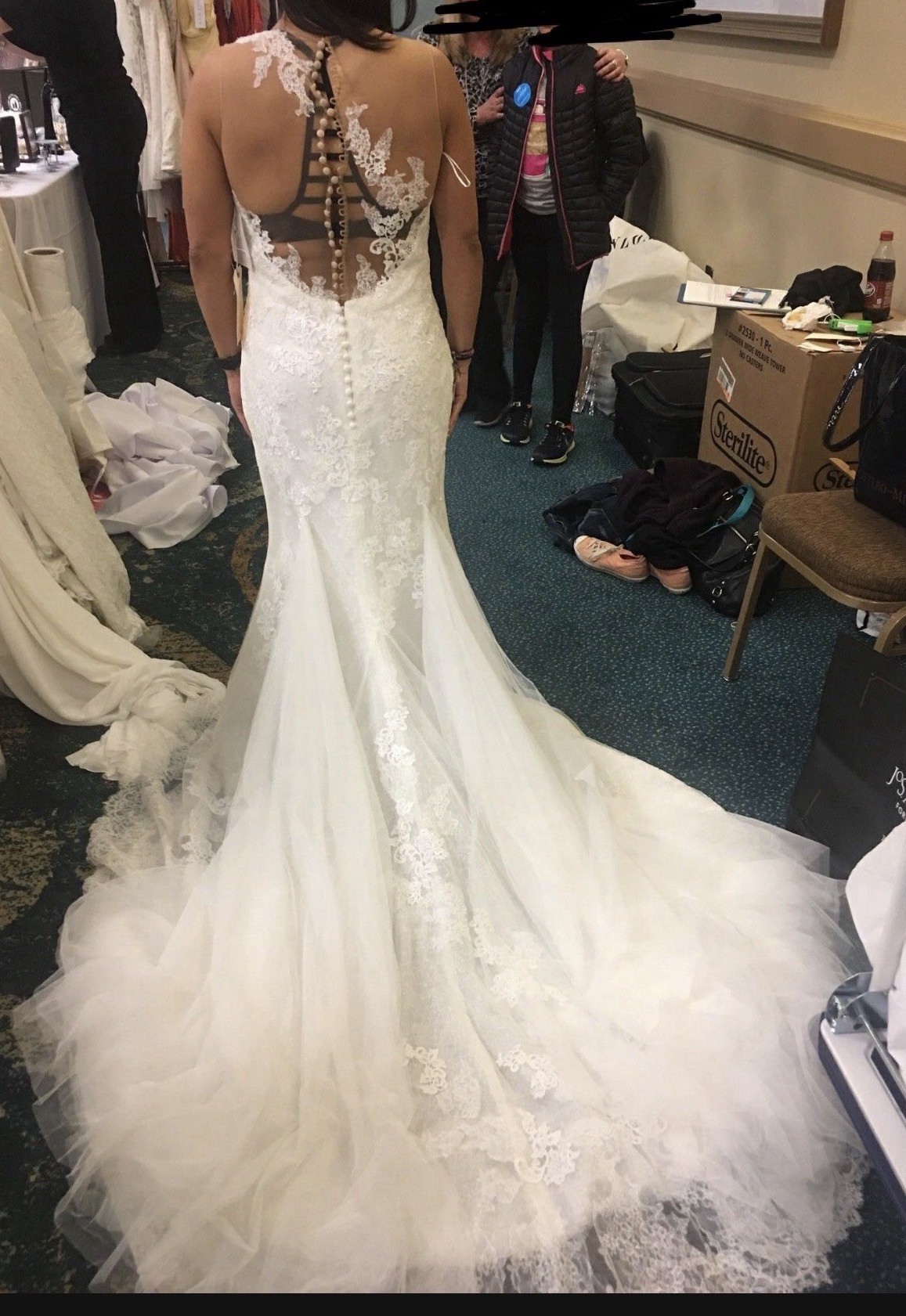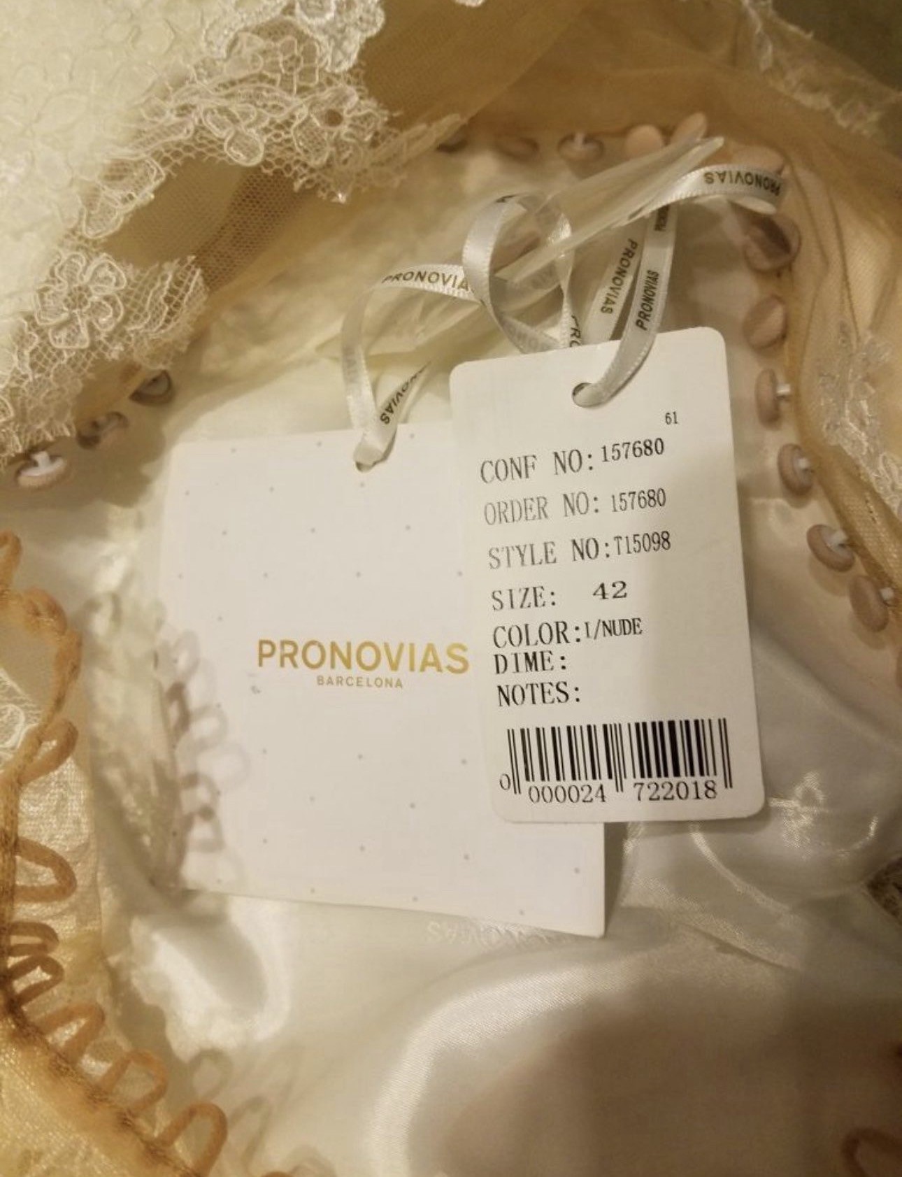 Pronovias. Style name: unknown. Dress New with Tags. Never Used. Only tried on Twice, at time of purchase, and pictures to sell dress.