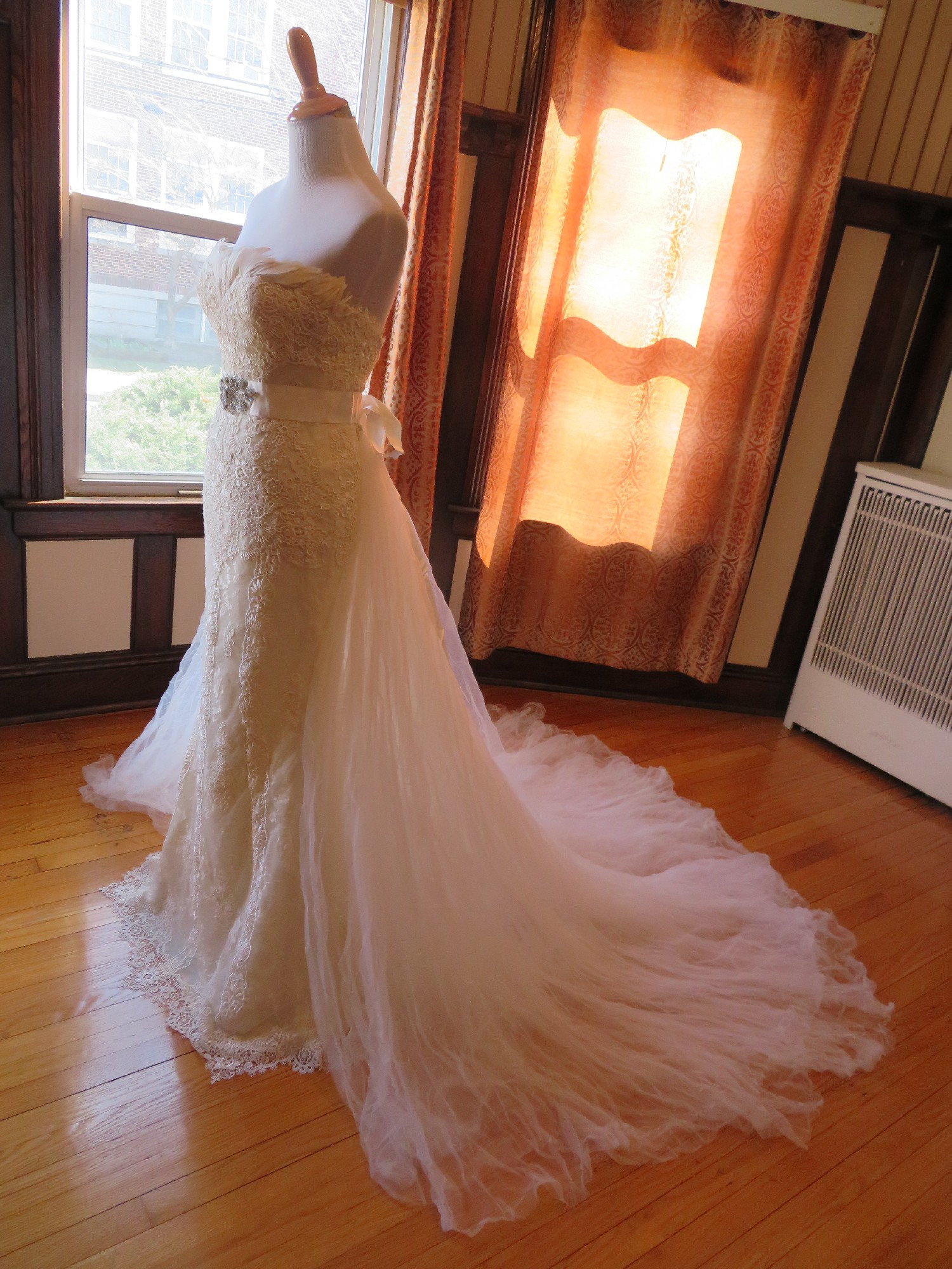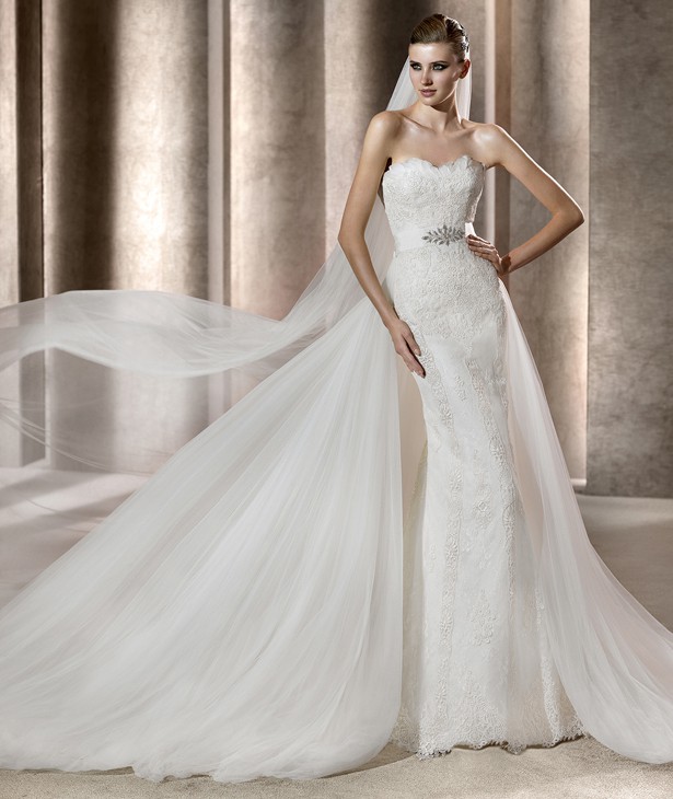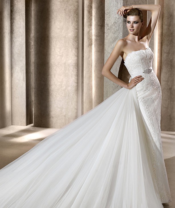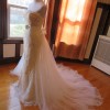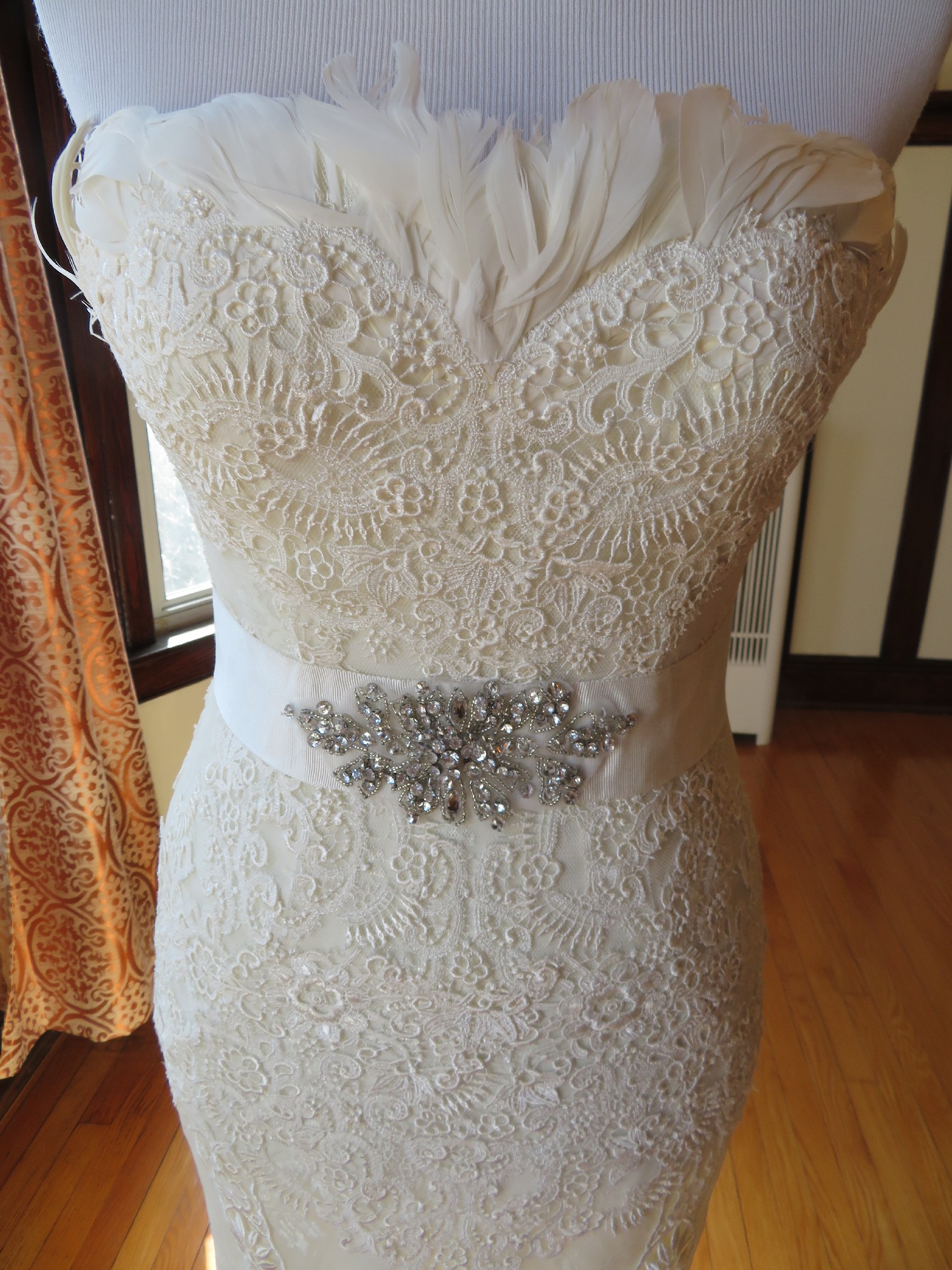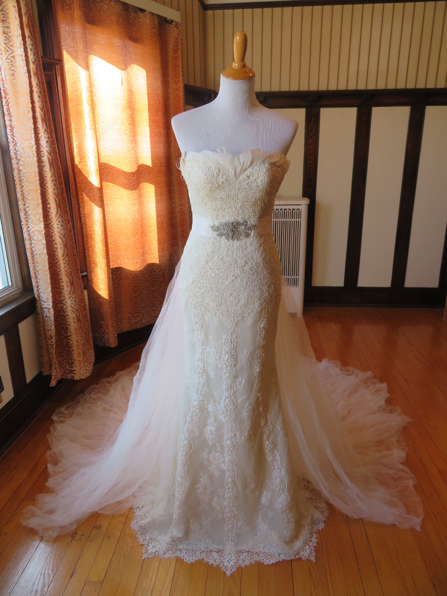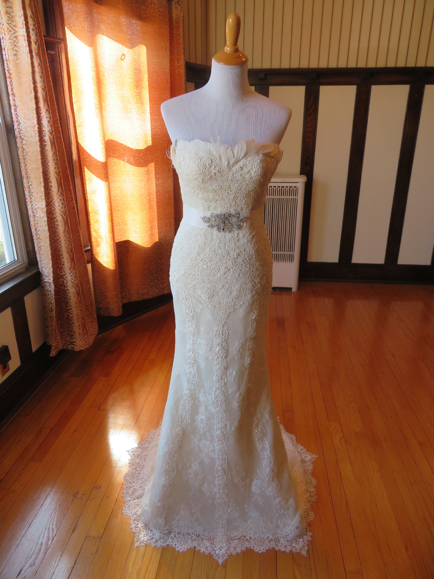 This is an Authentic PRONOVIAS Bridal Wedding Dress Gown. The name of the dress is BALCAN. It has a gorgeous mermaid style with a chapel train. The entire dress is embellished with exquisite floral lace, and exquisite feather on the neckline. The second layer is beautiful floral lace which is see through under the first layer. The bodice also has boning to built a perfect shape. It comes with a detachable fabulous long train, and a detachable belt decorated with stunning crystals in the center. This dress is brand new in great condition with the original label and tags. It was never worn.