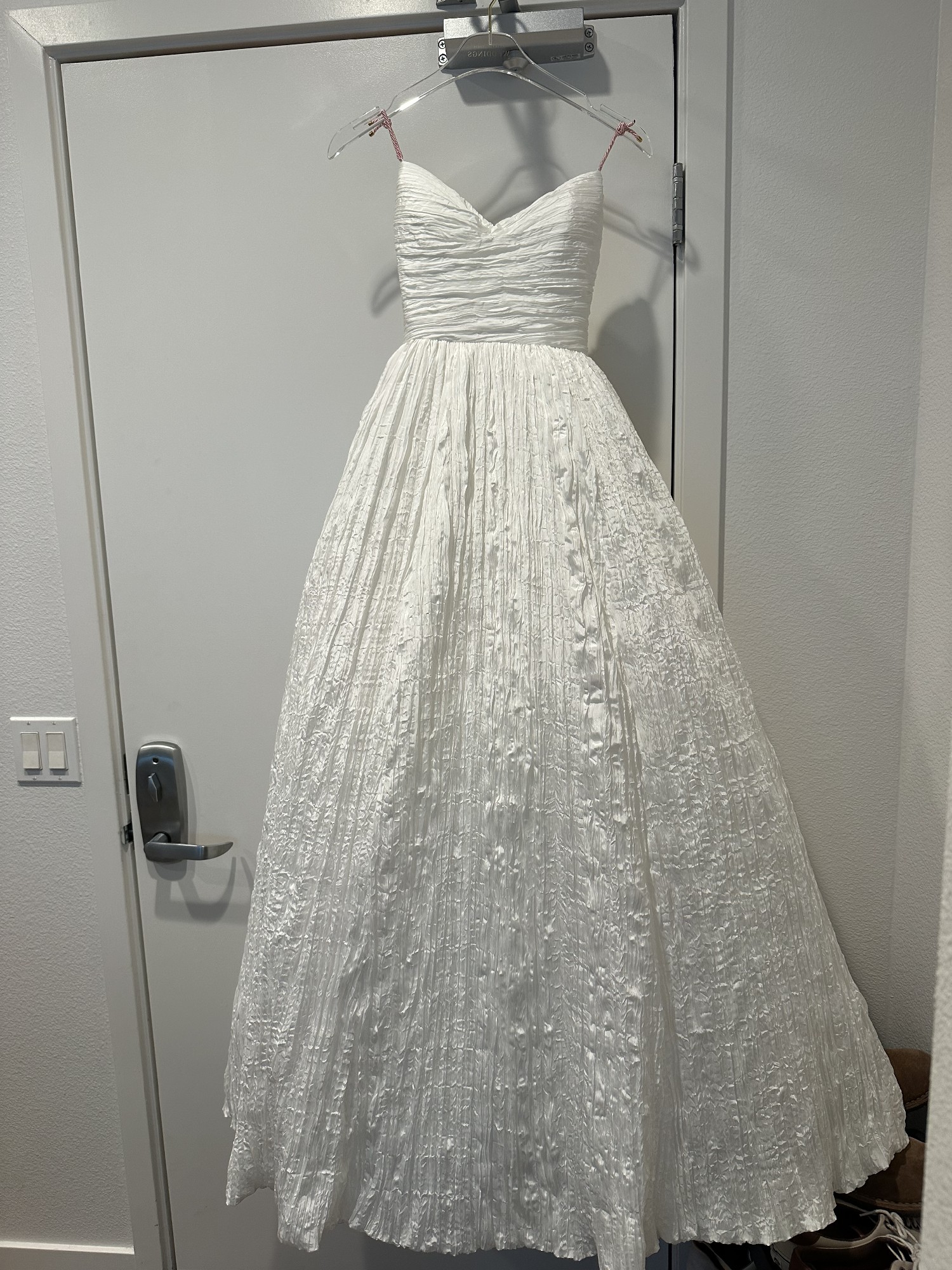 - Dress hemmed to the floor in front for wearing 2.5" heels (no hem on the cathedral-length train)