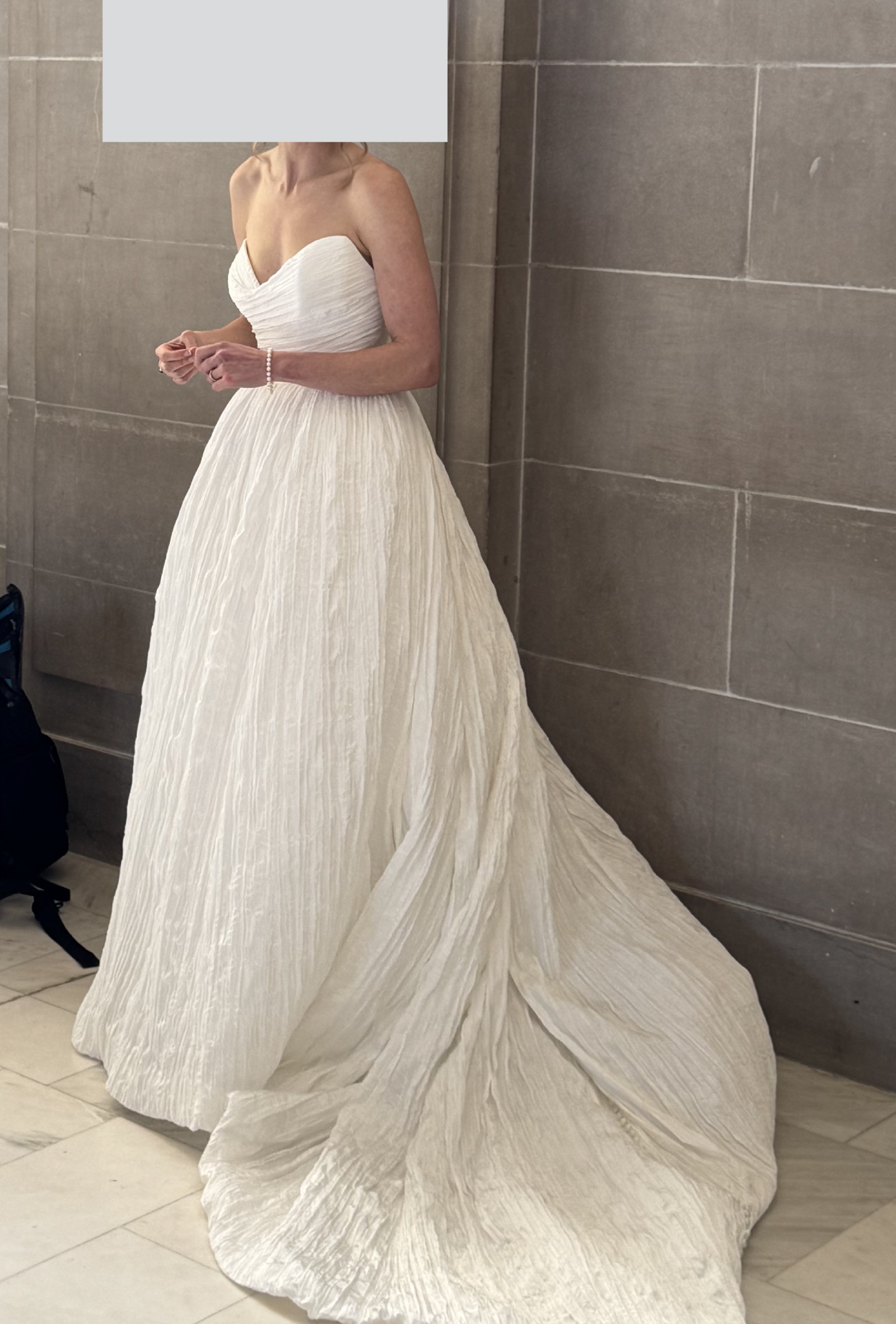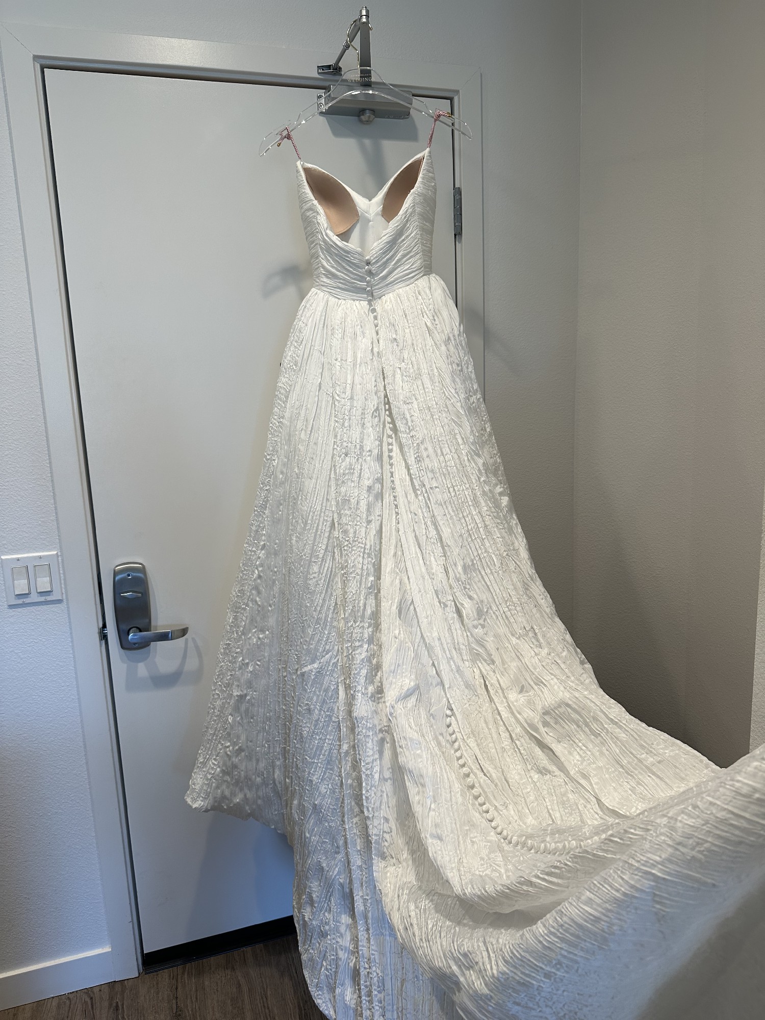 This dress is in fantastic, like-new condition and has been cleaned. A bustle was added during alterations and worked perfectly for the reception - no dragging.