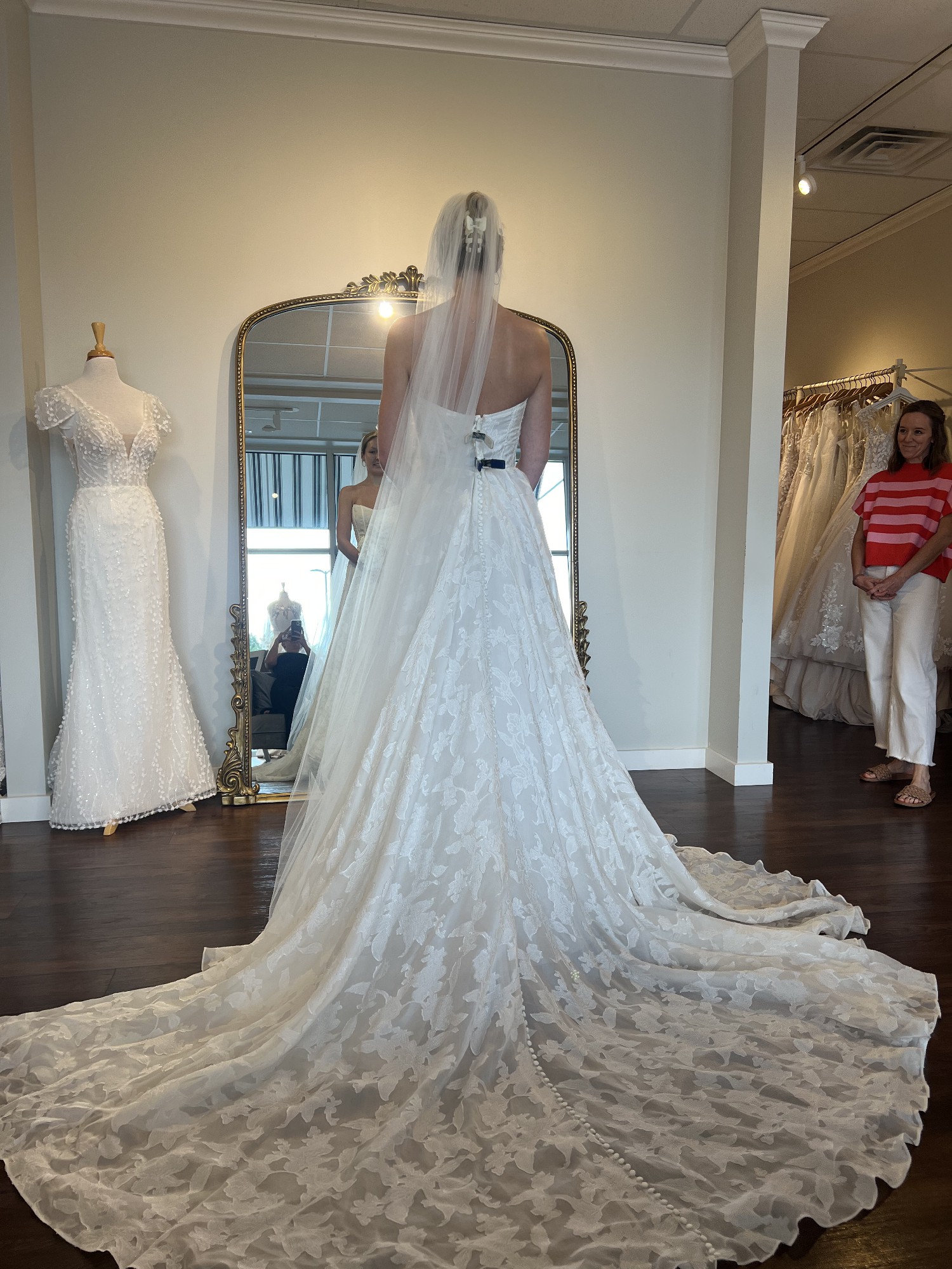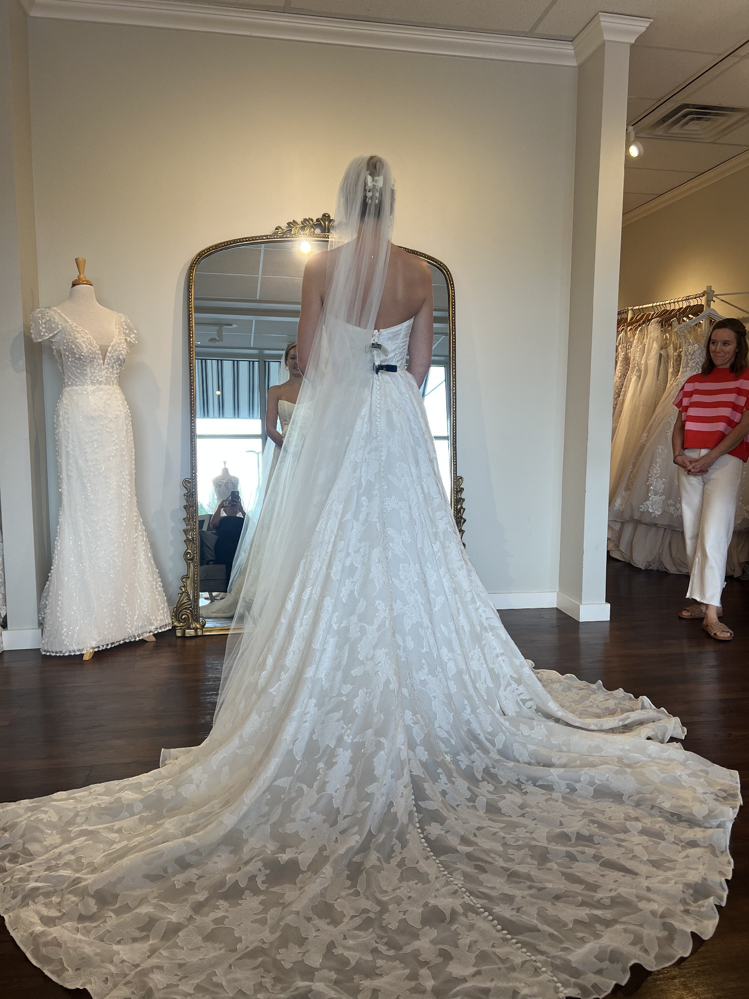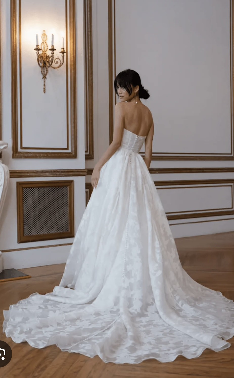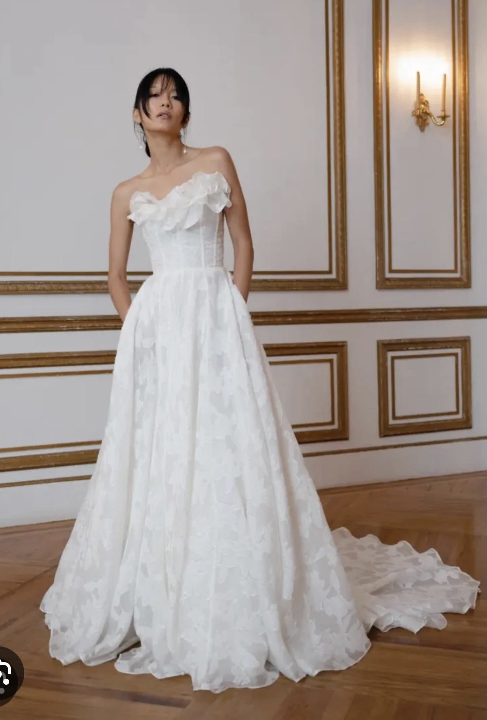The textured floral jacquard gives it a timeless, elevated look—perfect for a classic, modern, or garden-style wedding. The gown also includes the detachable ruffle neckline detail, allowing for two different looks: a clean strapless style or a more dramatic, fashion-forward neckline.