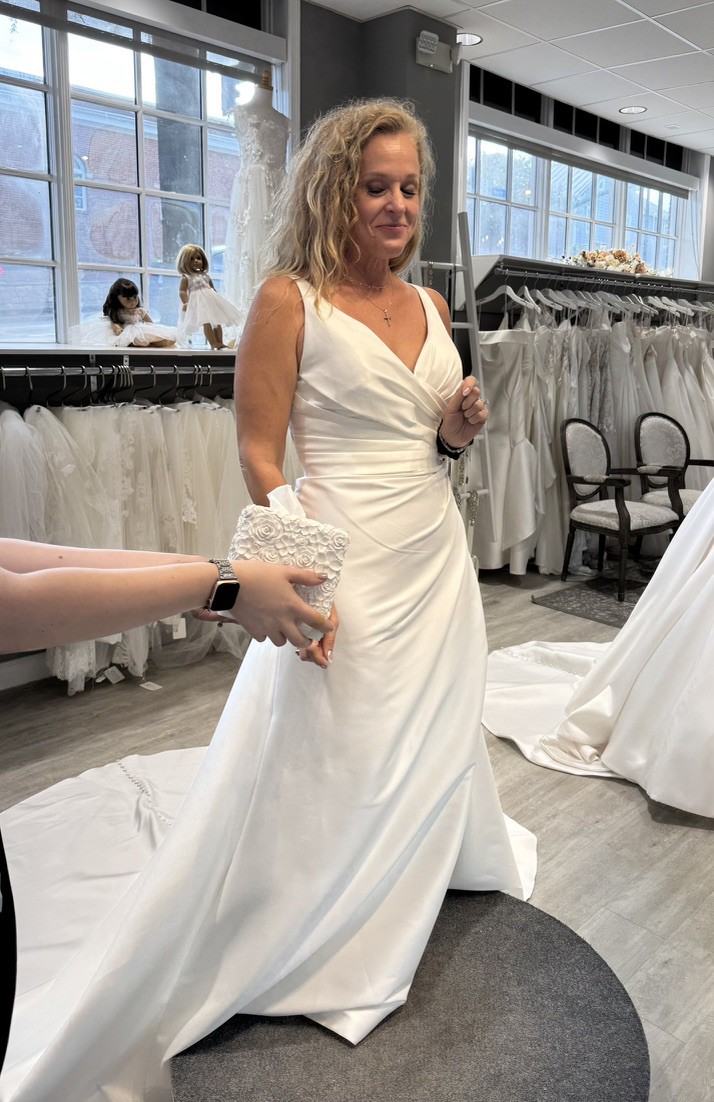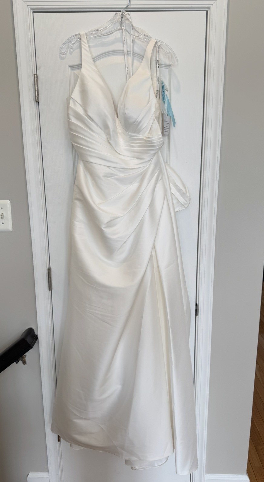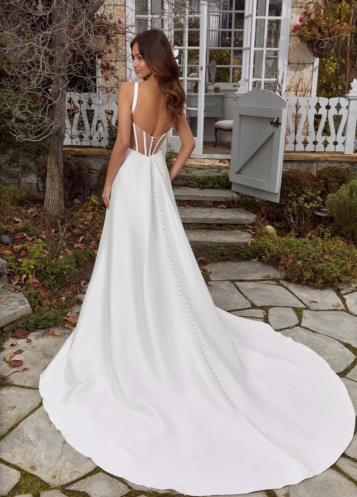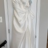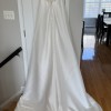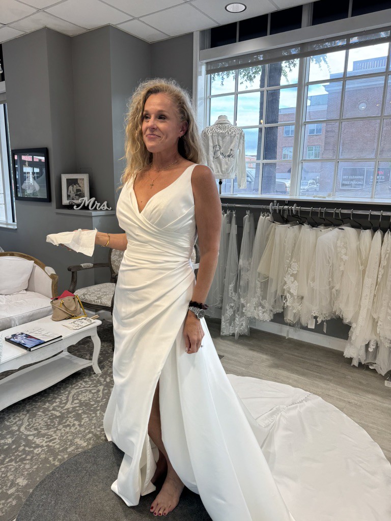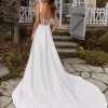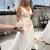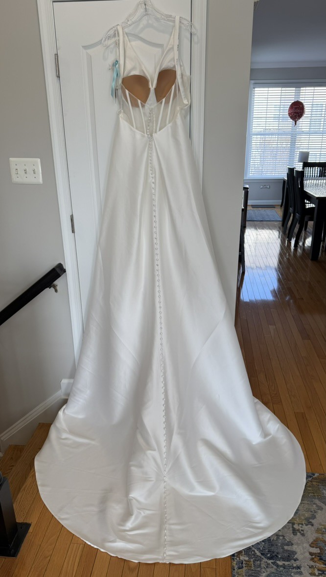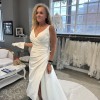 NEW - Unaltered - Never Worn - The slim A-line gown has a v-neckline on a surplice bodice with draped detailing that creates a faux-wrap skirt, serving a sultry dose of leg. Our favorite part is the sheer back with couture boning and buttons leading down to the hemline for a timeless look. (Includes 4 yards of Roxie Satin if you'd like to have a sash or handbag created or line the sheer back.) Pics of me in bridal shop are of a sample gown.