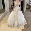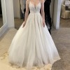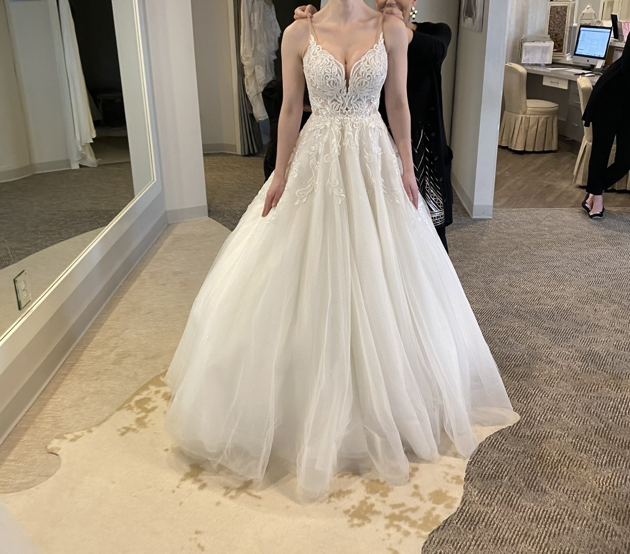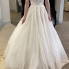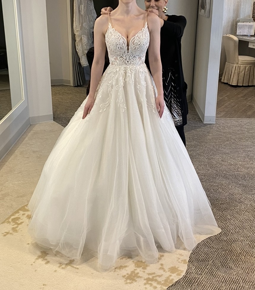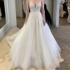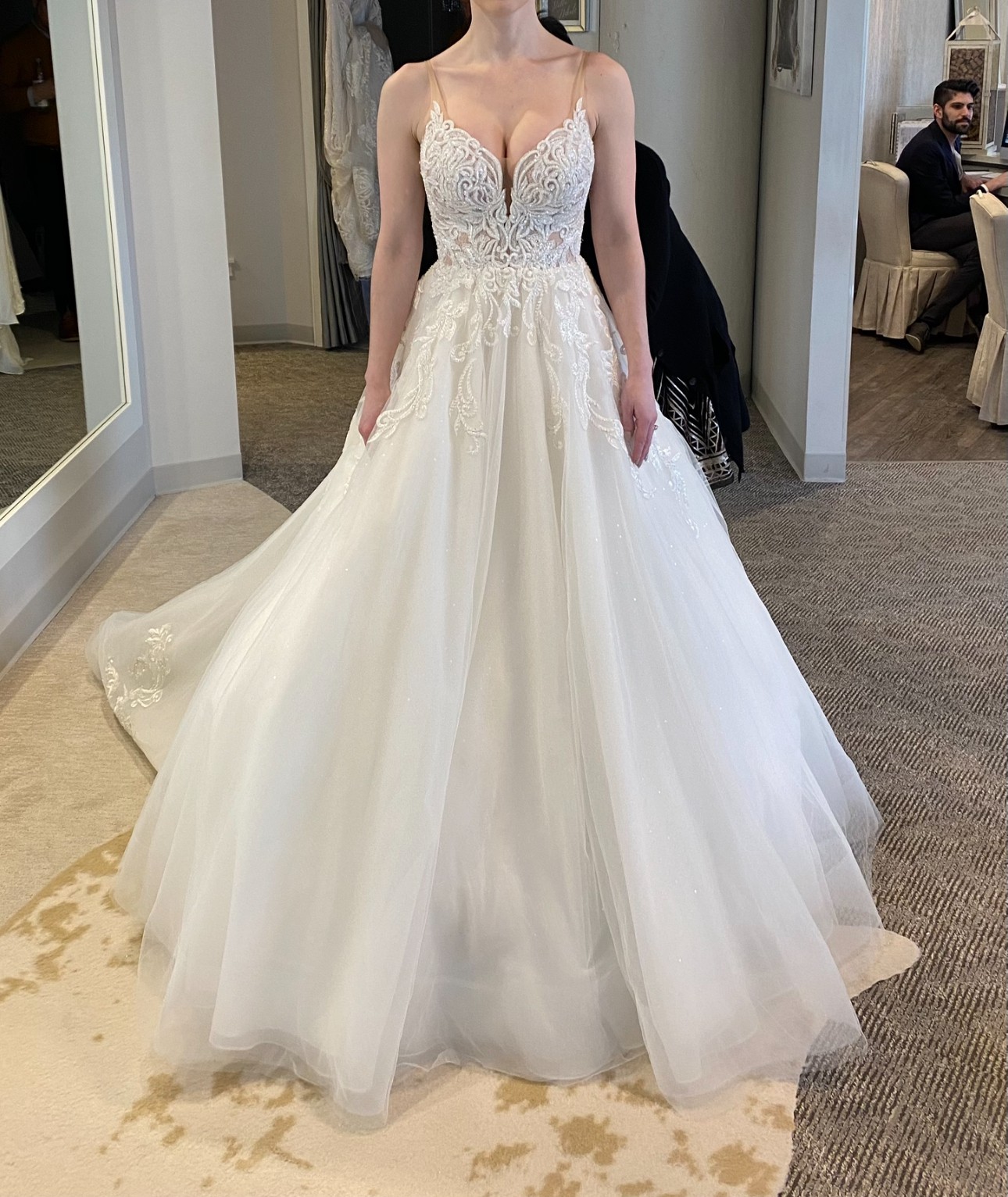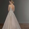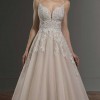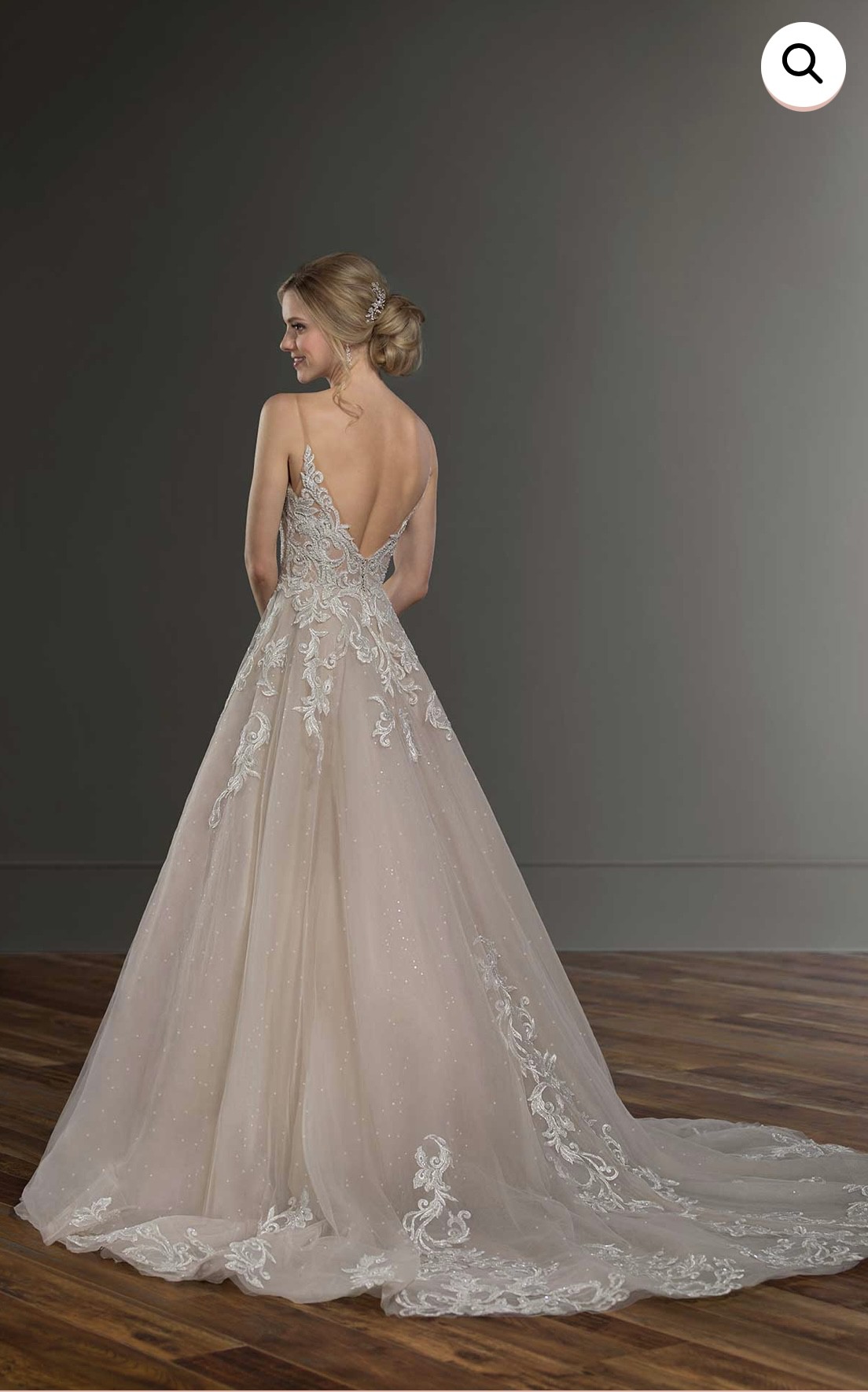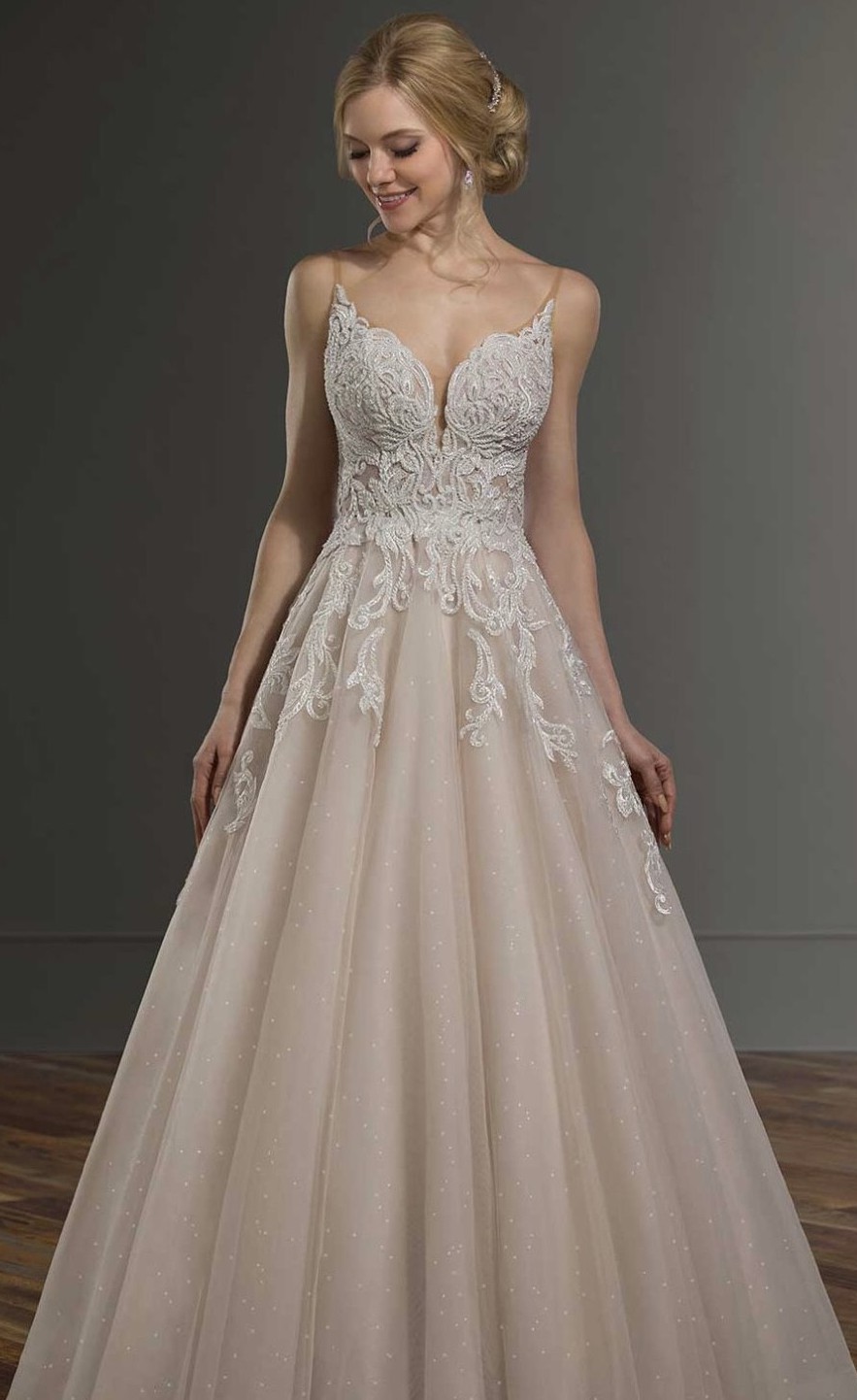 A style that incorporates a traditional silhouette with modern detailing, this A-line wedding dress with sparkle from Martina Liana gives you the best of both worlds! Layered lace gives just enough coverage to this bodice while remaining semi-sheer and sexy — creating a nice juxtaposition against the frothy, full skirt. A mixture of bugle beading throughout the lace and sparkle tulle within the skirt gives this gown an enviable shimmer, while a horsehair trim gives it a formal, polished look. An open V highlights the back of this bodice, while lace appliques adorn the skirt and train, creating a romantic and dramatic feeling. The back of this A-line wedding dress with sparkle zips up beneath crystal buttons.