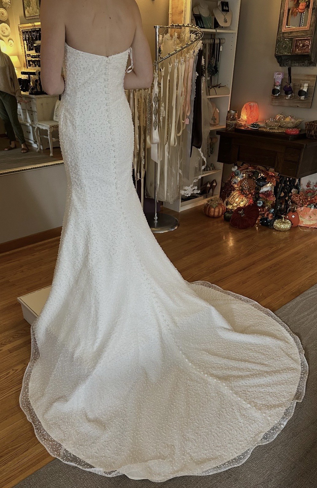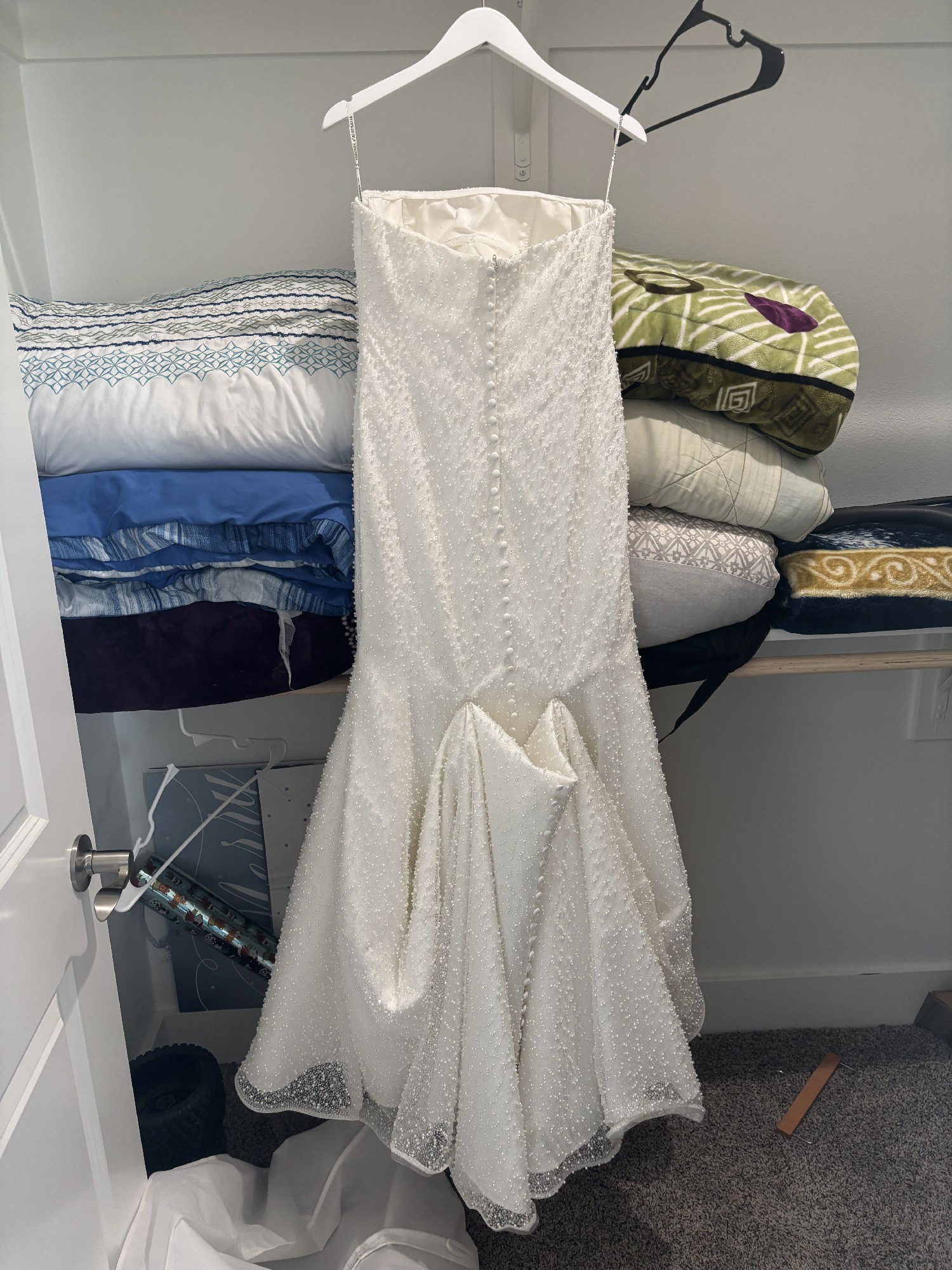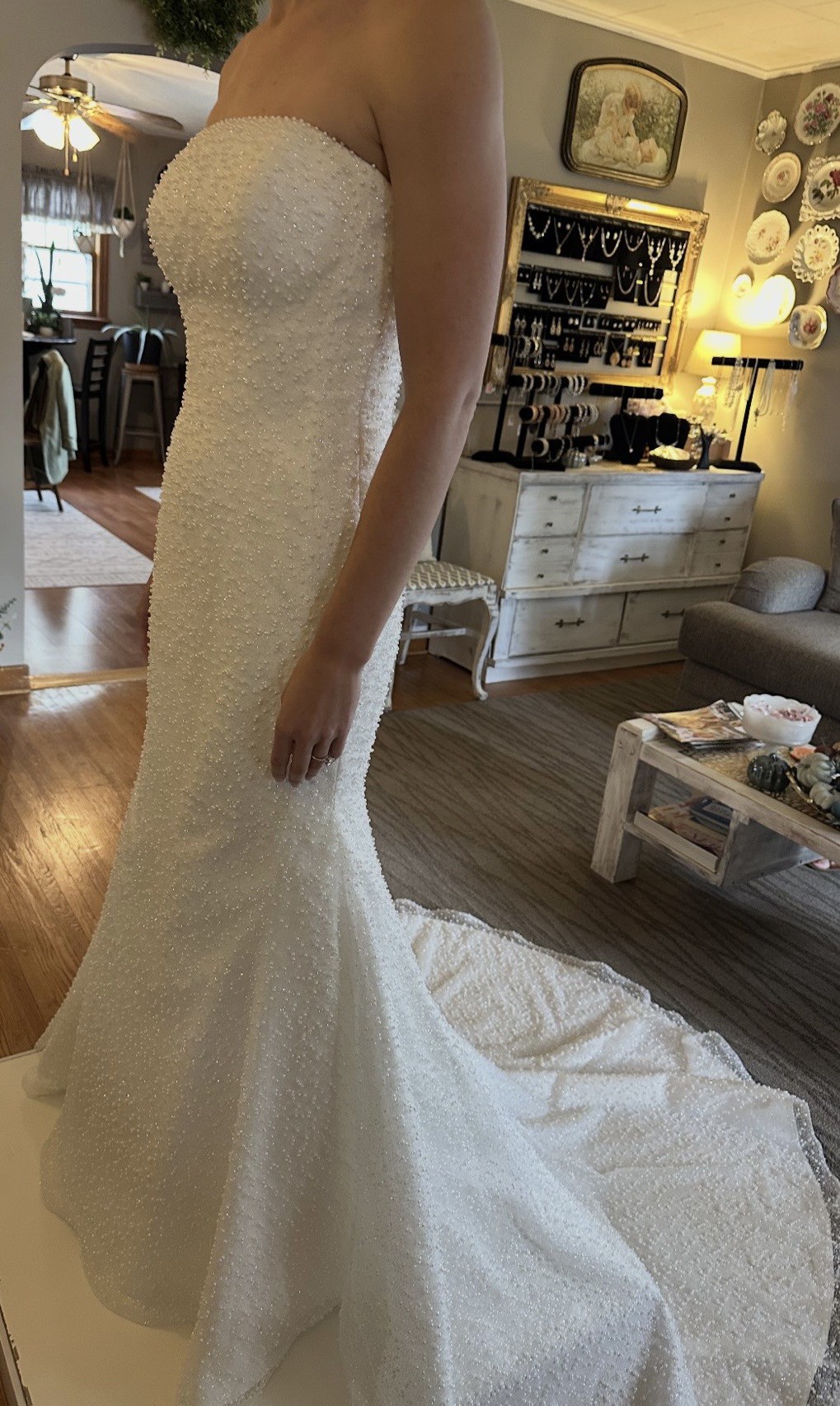 My dream dress just did not fit! I bought from a lovely bride on this app with hopes of it fitting and not having to pay an arm & leg. Unfortunately, I have huge hips and it did not fit. Beaded with pearls and has lots of sparkle too!