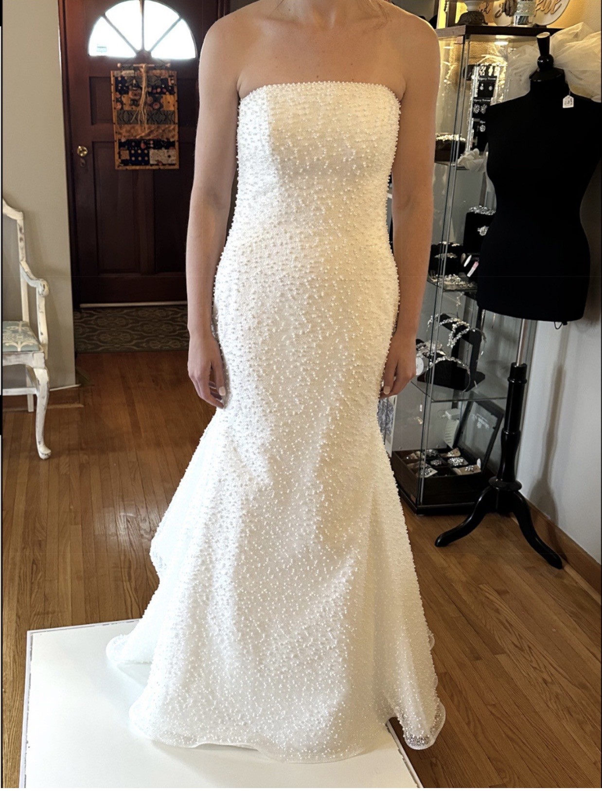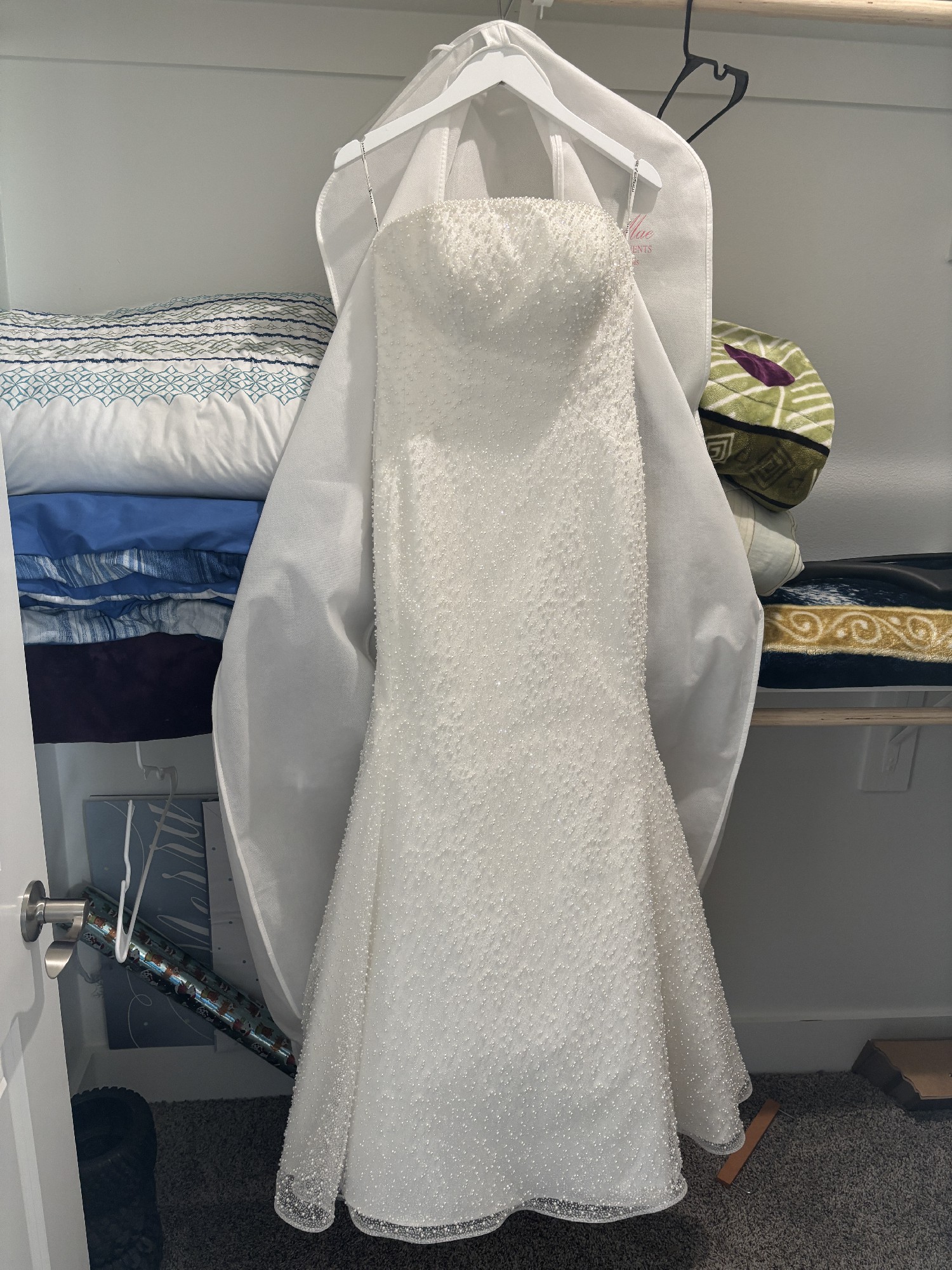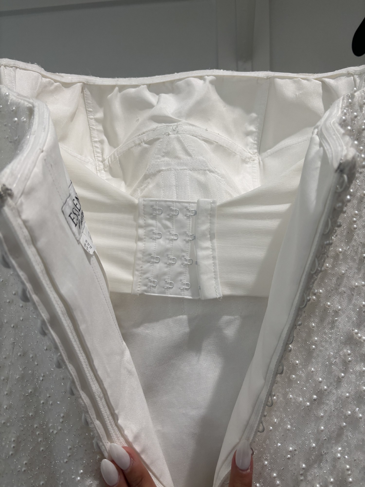 My dream dress just did not fit! I bought from a lovely bride on this app with hopes of it fitting and not having to pay an arm & leg. Unfortunately, I have huge hips and it did not fit. Beaded with pearls and has lots of sparkle too!