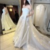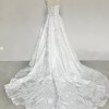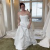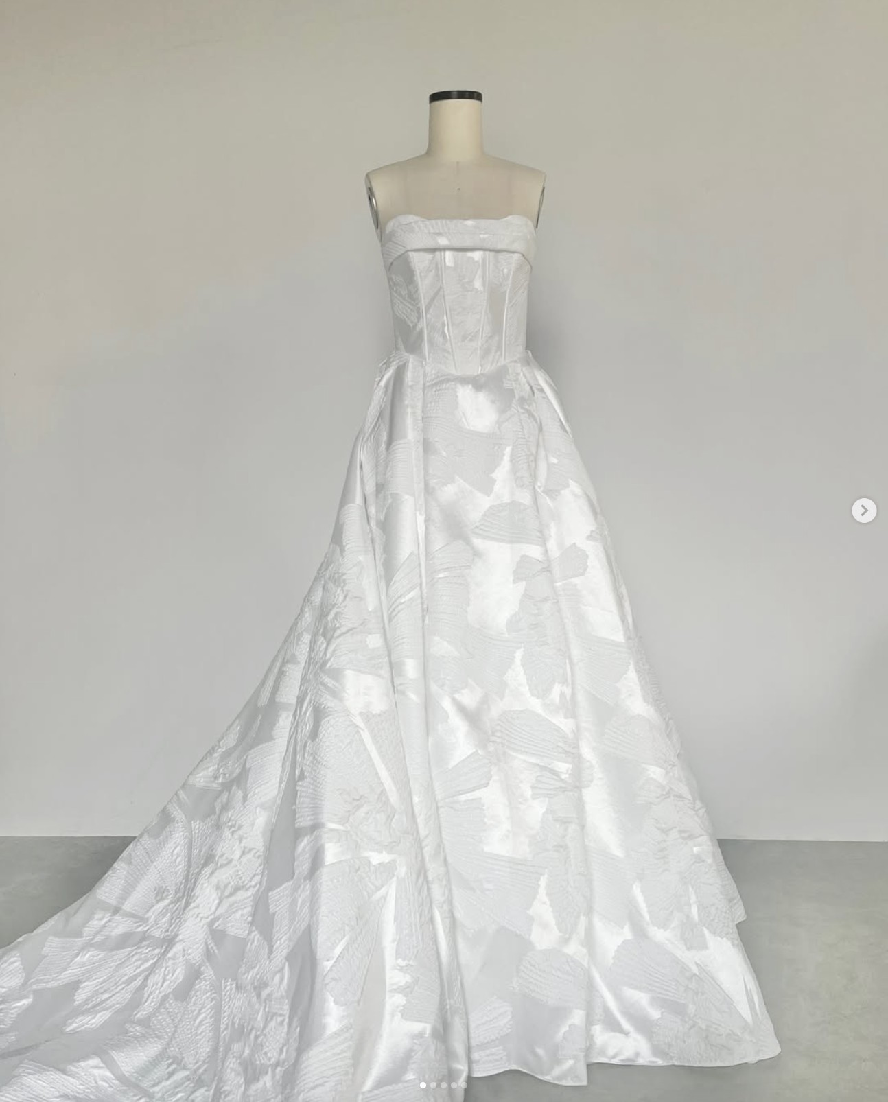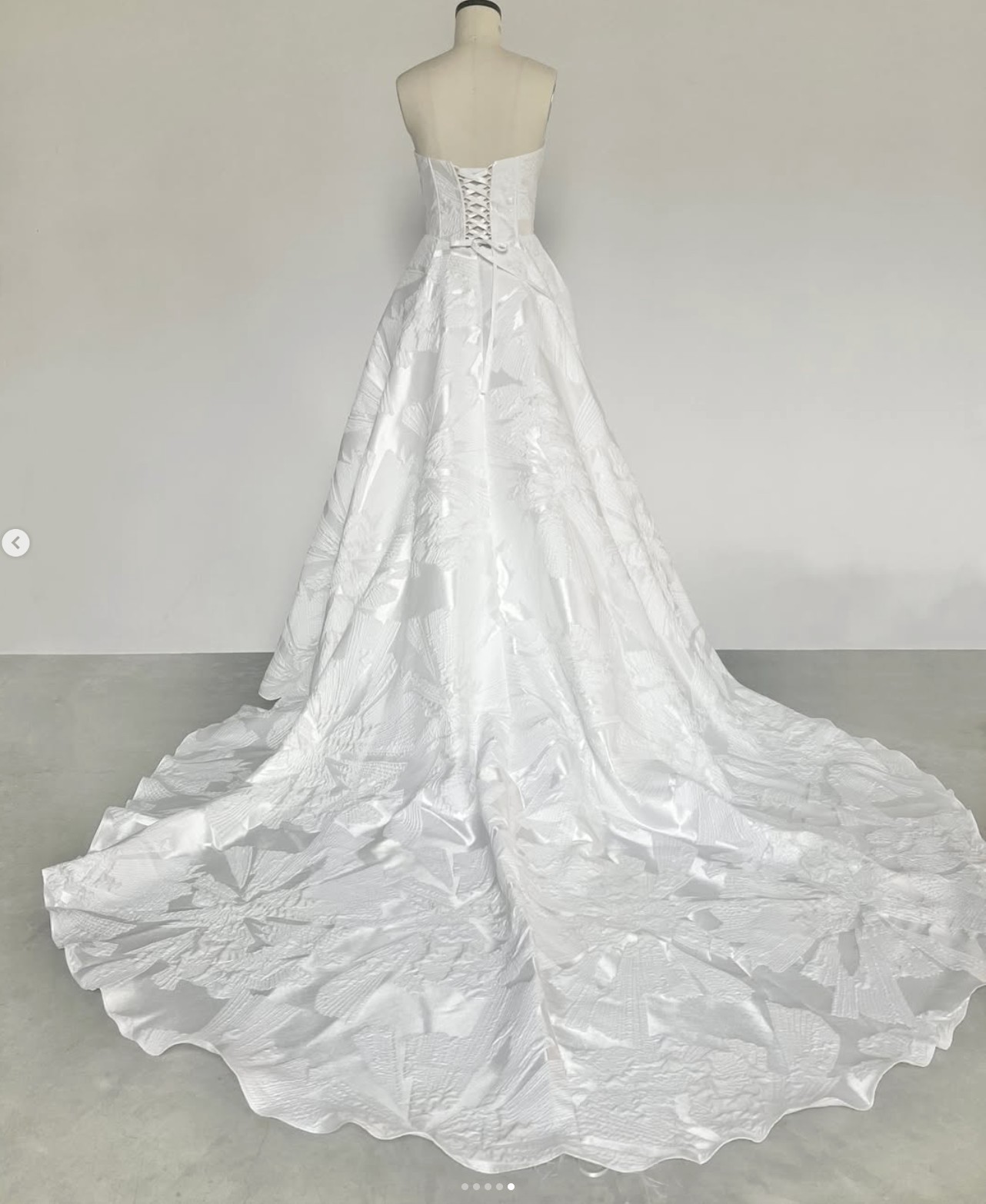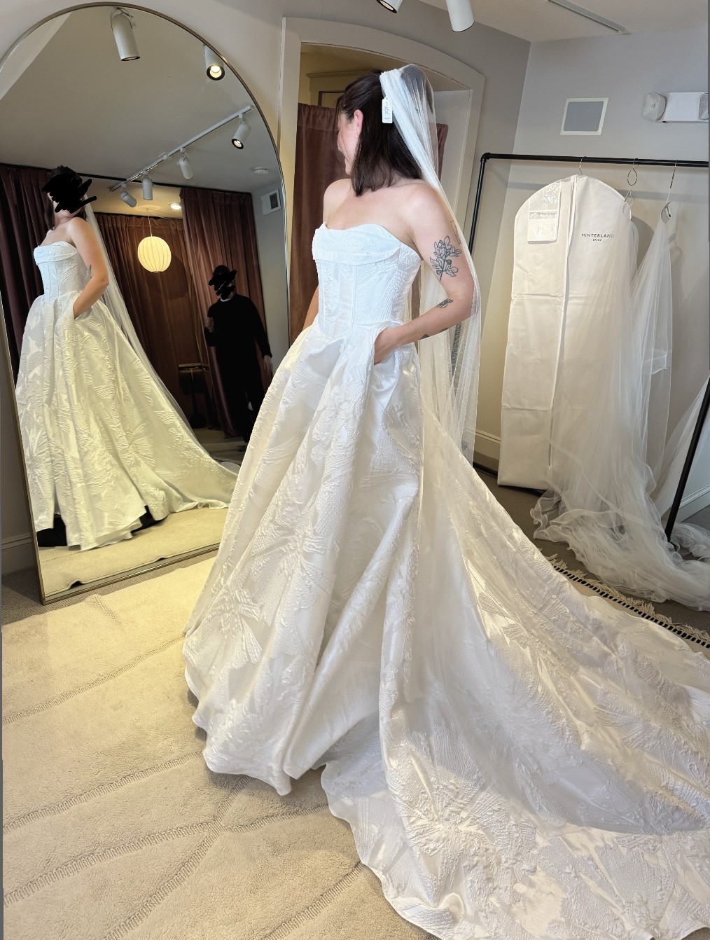 "Adelina" is classic and elegant with an edgy twist, she is brand new, unaltered and unworn. Stylistically, she is a romantic, strapless gown with a front cowl, corset back and exposed boning. She has a gently curved neckline, a subtle basque waist, a full, box pleated skirt and a dramatic 80" train. She’s been customized with the Mahsa Fabric—a beautiful textured flower jacquard. She’s lined with smooth off-white midori and comes with a yard of extra fabric for any desired changes. The corseted back also makes the dress flexible in sizing, it can be tightened or loosened to fit like a glove. And last but not least, she has pockets!