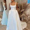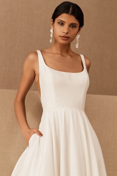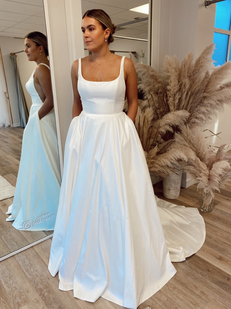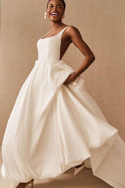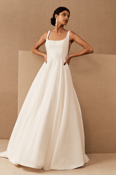 This crisp taffeta ballgown is the epitome of bridal elegance, with illusion side cutouts and a soft square neckline bringing a touch of modernity. (Plus, it has pockets!). By Jenny Yoo.