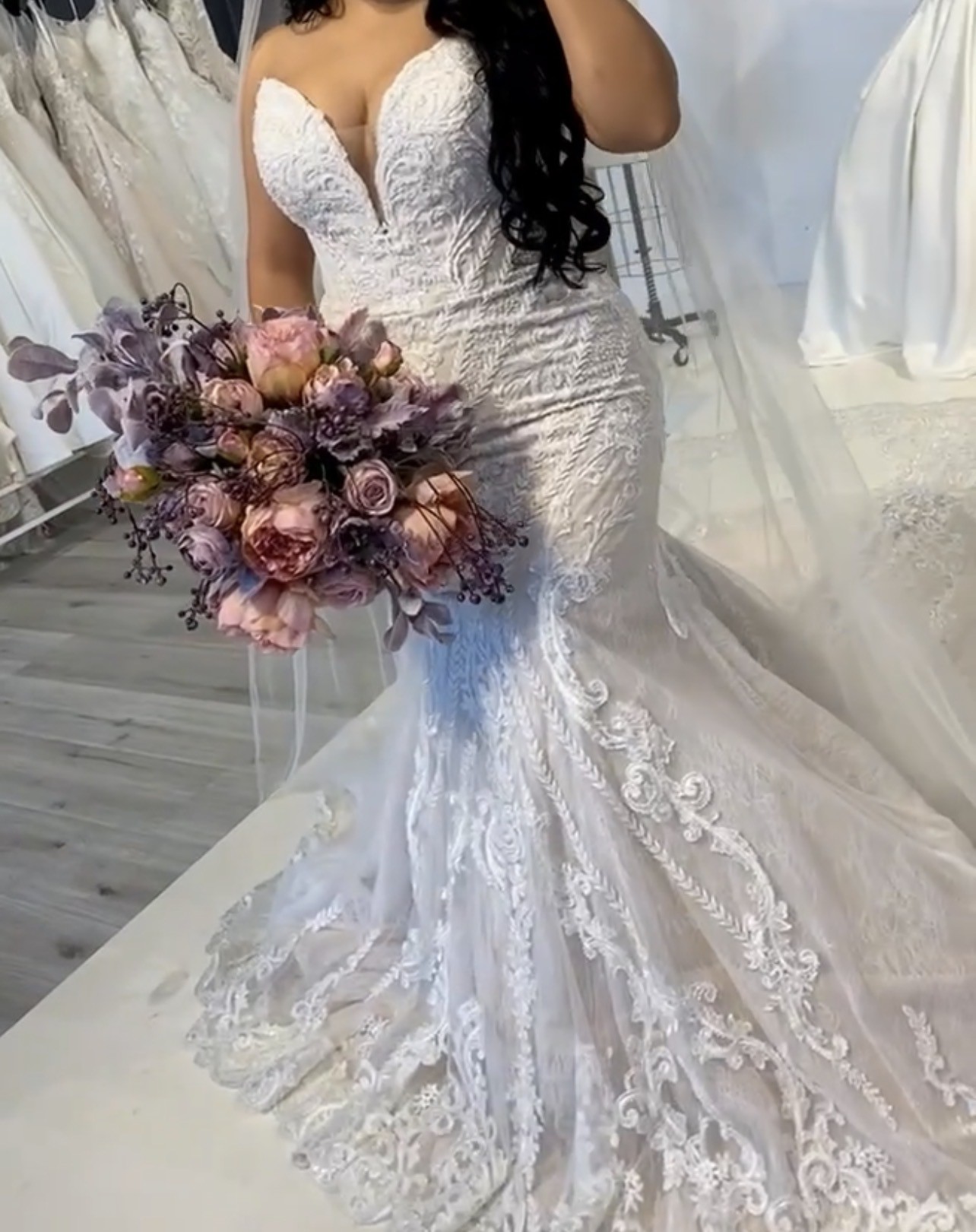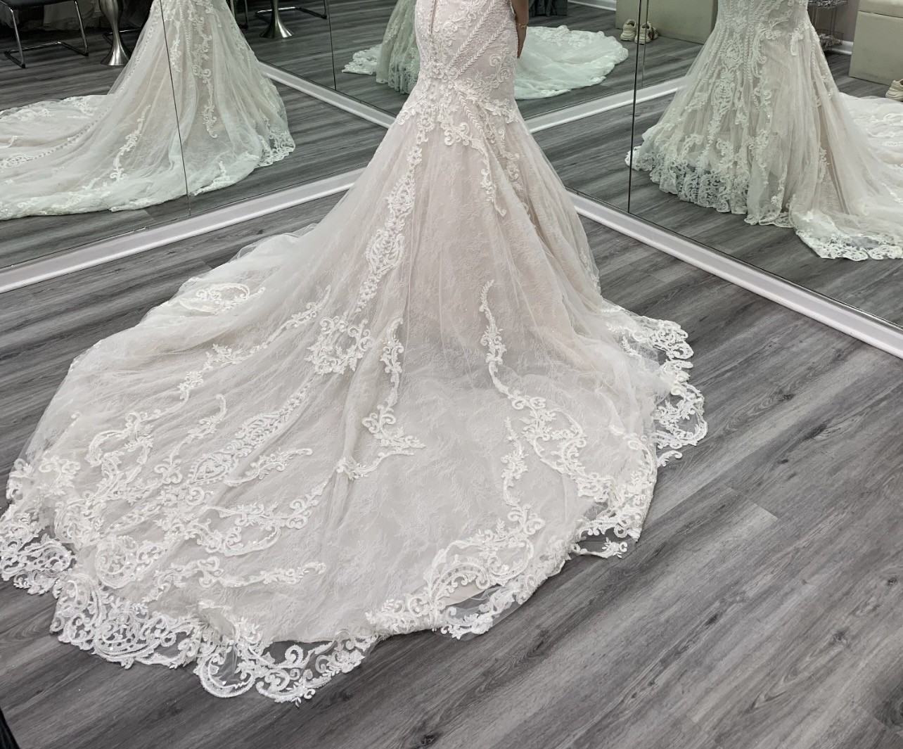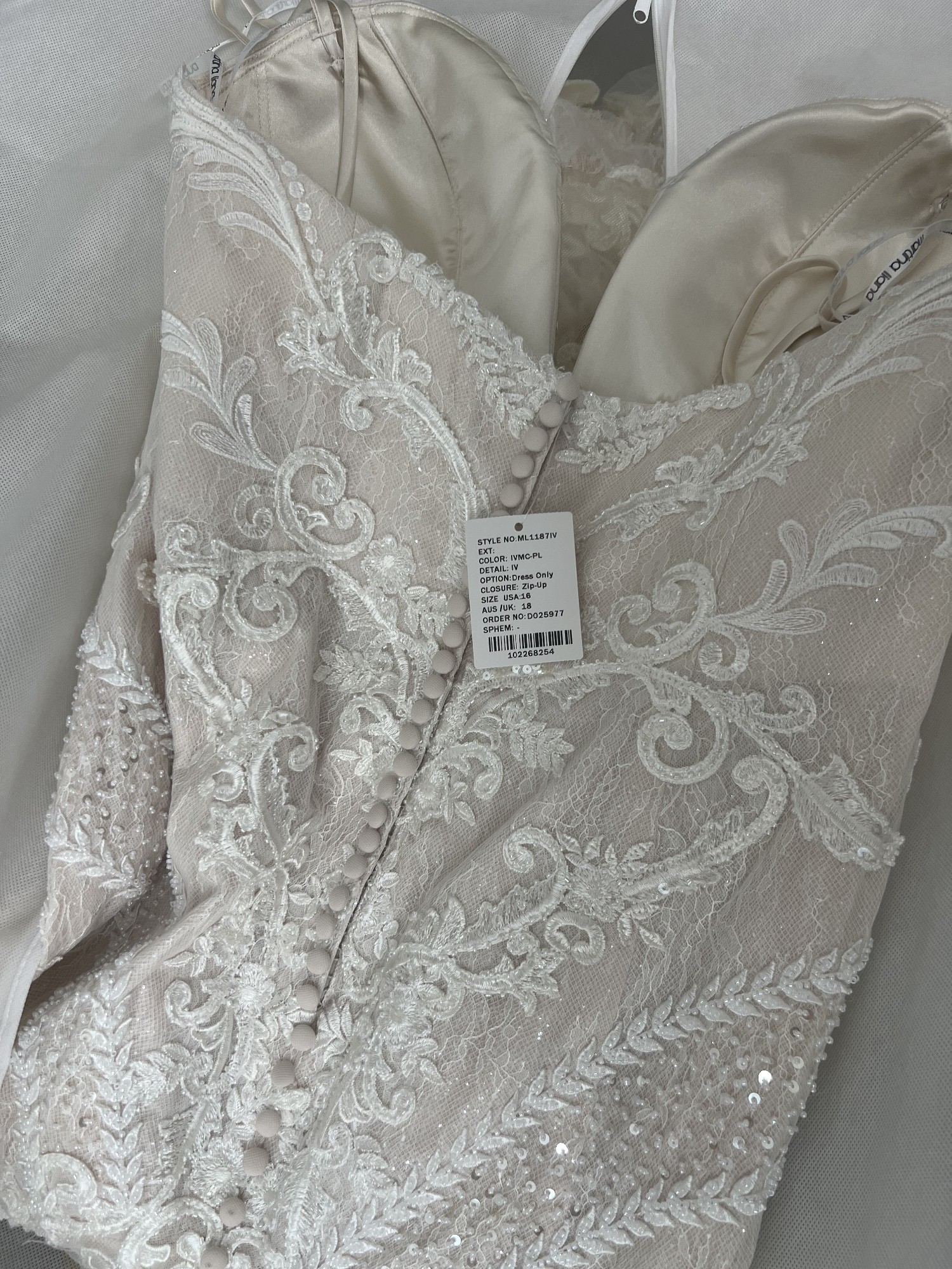 This Martina Liana 1187 dress is a breathtaking embodiment of elegance and romance, perfect for the bride who dreams of a magical wedding day. Crafted from exquisite ivory lace, this stunning gown features a flattering trumpet silhouette that hugs your curves and flows gracefully into a dramatic floor-length skirt. The sweetheart neckline enhances the décolletage, while the beaded detailing adds an enchanting sparkle that catches the light with every movement.