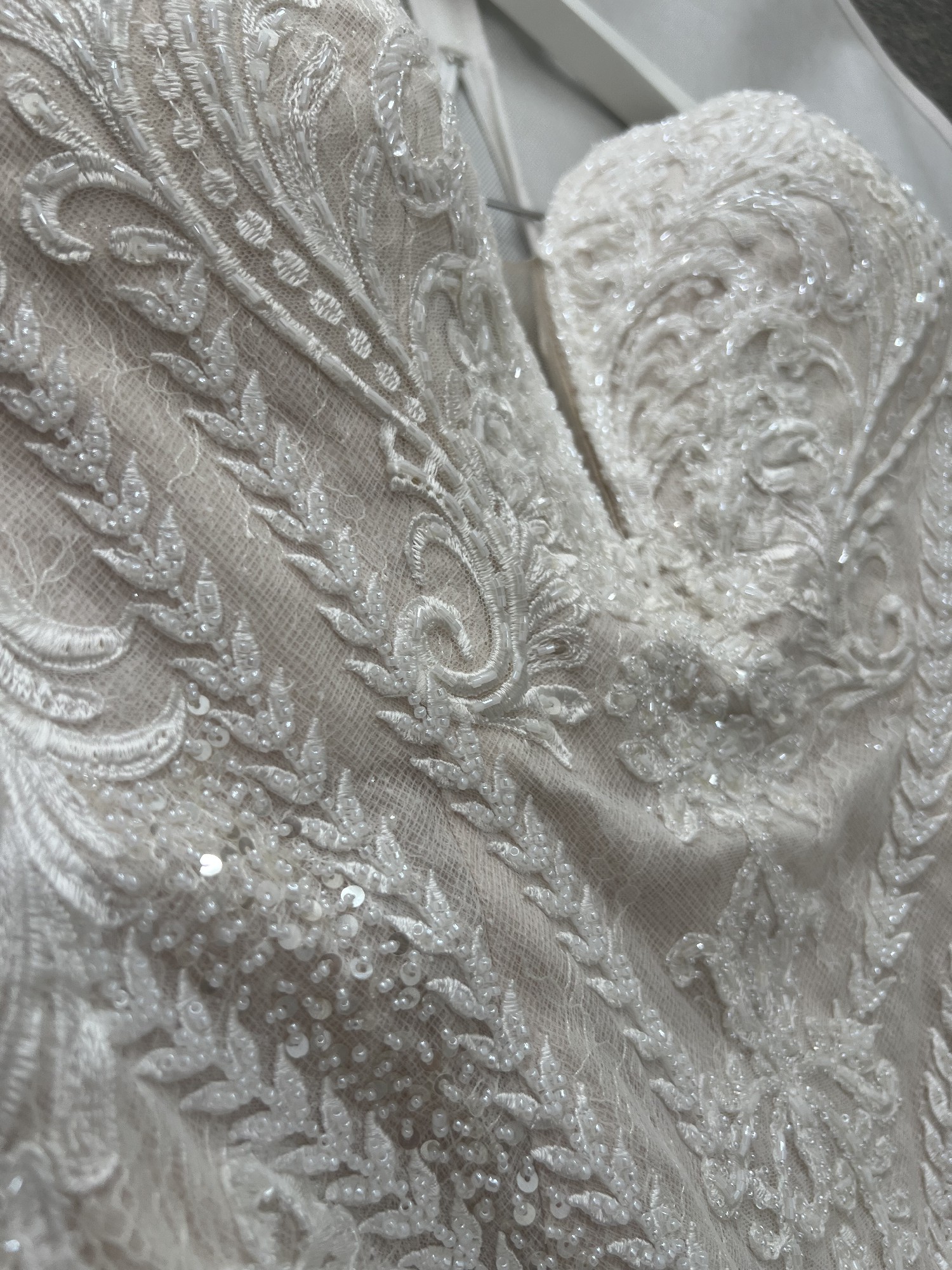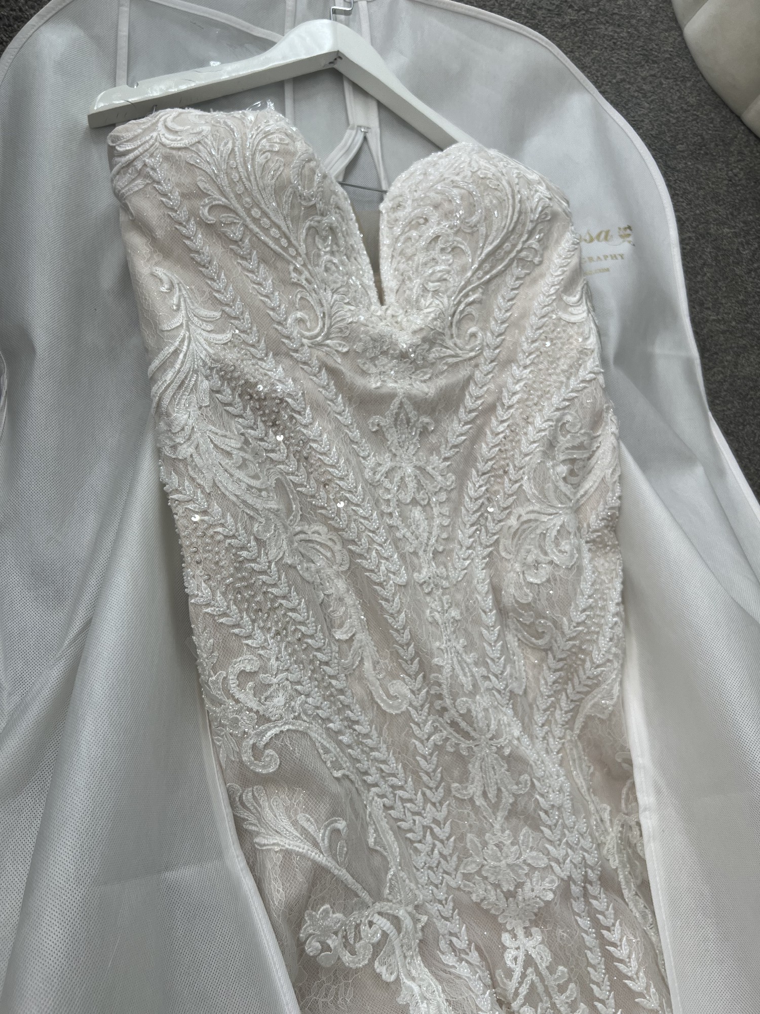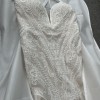 The strapless design ensures you feel confident and beautiful, highlighting your shoulders and collarbone. With a mid-back closure, this dress stays securely in place throughout your celebration, allowing you to dance the night away with ease. Made in size 16, this dress is designed to embrace your figure while providing exceptional comfort.
