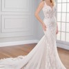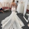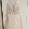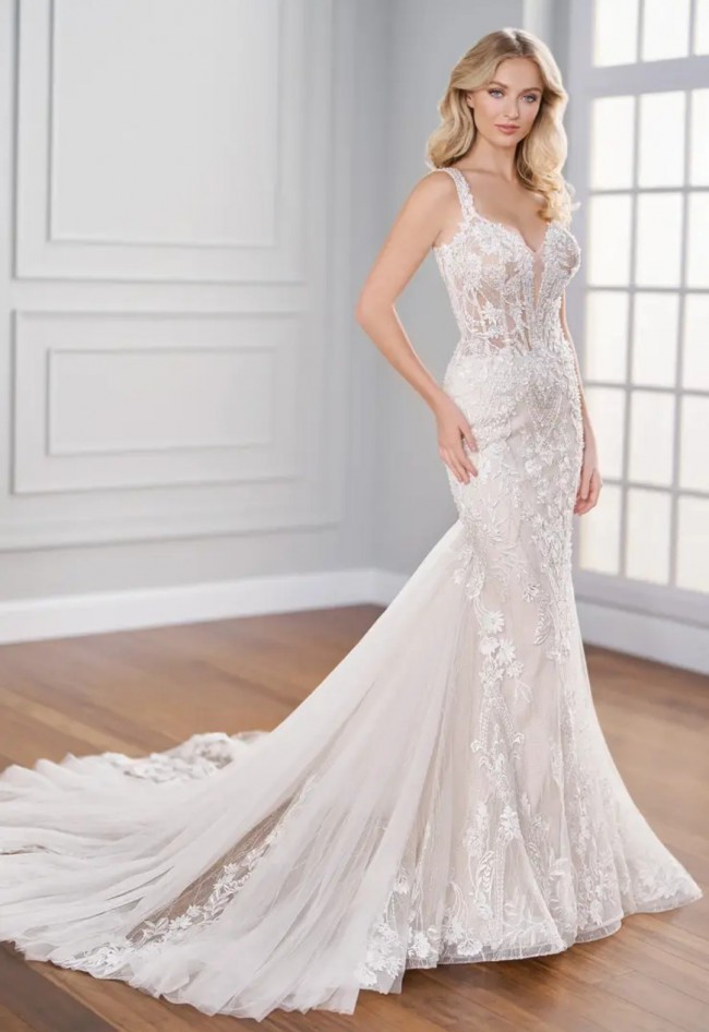 This gown features a romantic and elegant design with delicate lace detailing, a flattering silhouette, and a timeless yet modern feel. It beautifully enhances the figure while still being comfortable and easy to move in.