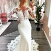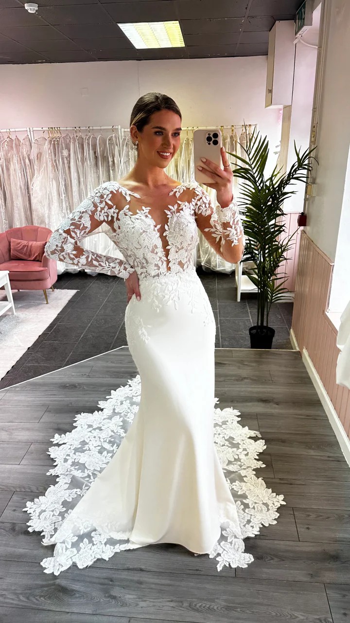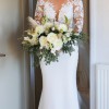 Illusion tulle in the bodice, back and sleeves make the intricate lace appear to float along the body. In the back, delicate lace decorates the open design for a slight keyhole effect. Buttons at the cuffs of the sleeves add a touch of timeless bridal glam. The simple skirt complements the bold bodice, with beautiful contour seaming down the skirt providing effortlessly glamorous structure. Floral motifs from the bodice continue to the top of the skirt and at the bottom of the train for a cohesive, romantic finish.