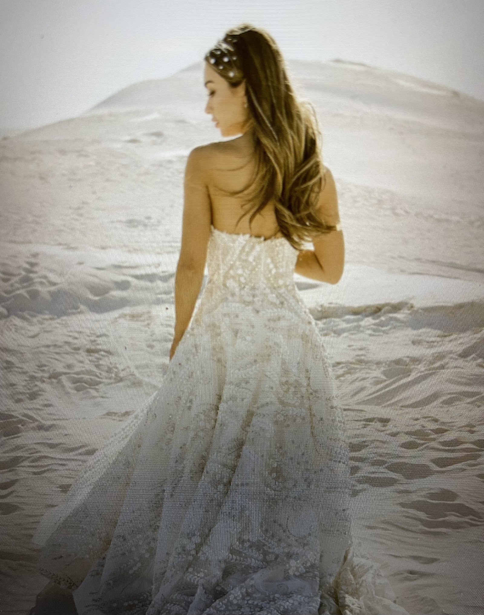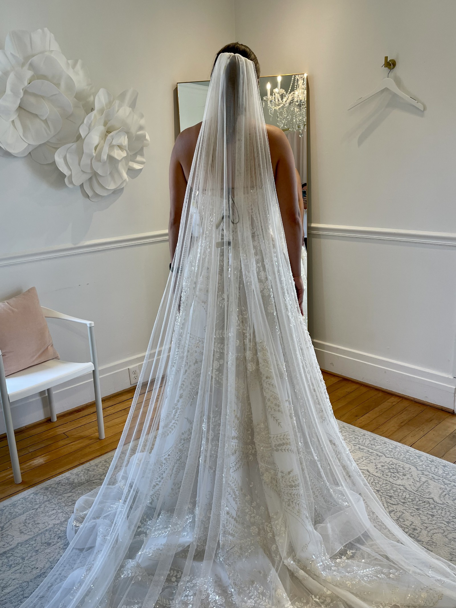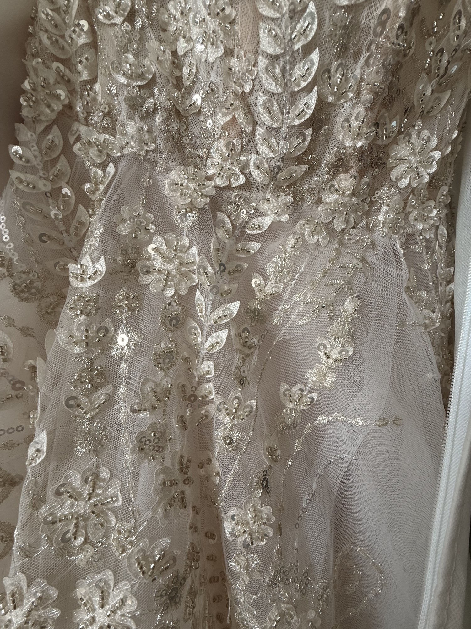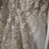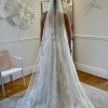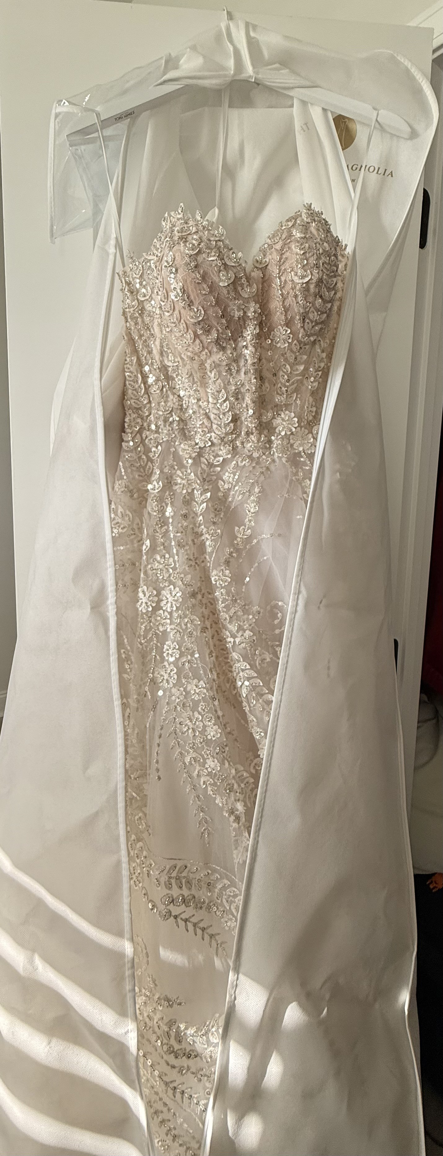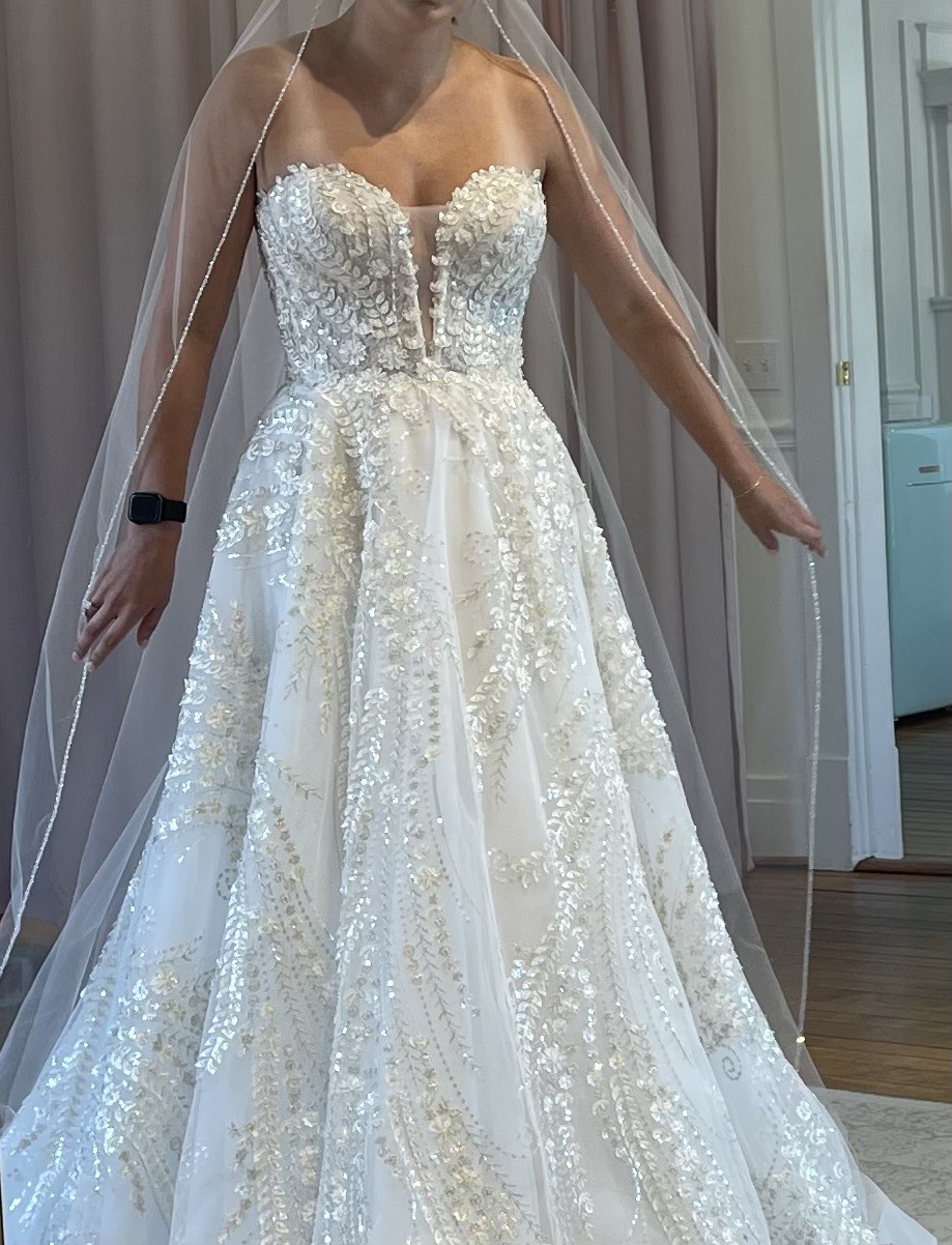Adorned with exquisite beading and sequins, this dress sparkles subtly. Unique pockets offer a blend of practicality and elegance, allowing you to keep essentials close while maintaining the gown's flawless design. Toni Federici veil included.