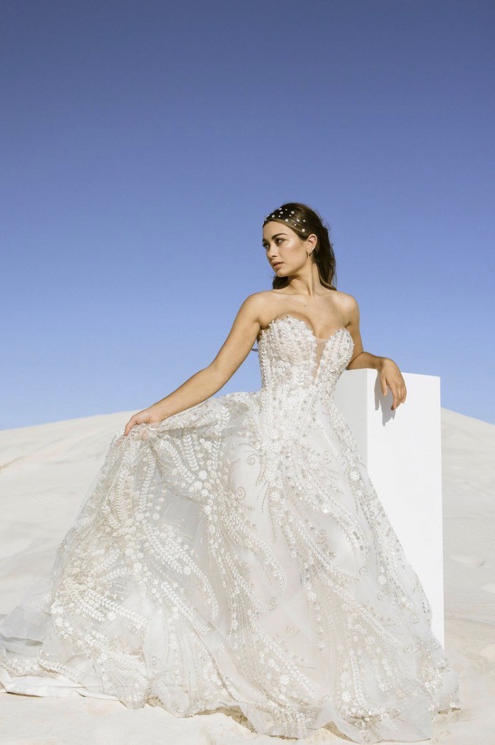 This enchanting ballgown by Zavana Couture is the epitome of bridal elegance. The floor-length design creates a dramatic silhouette that flows gracefully with every step.