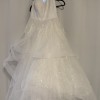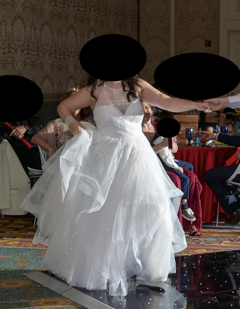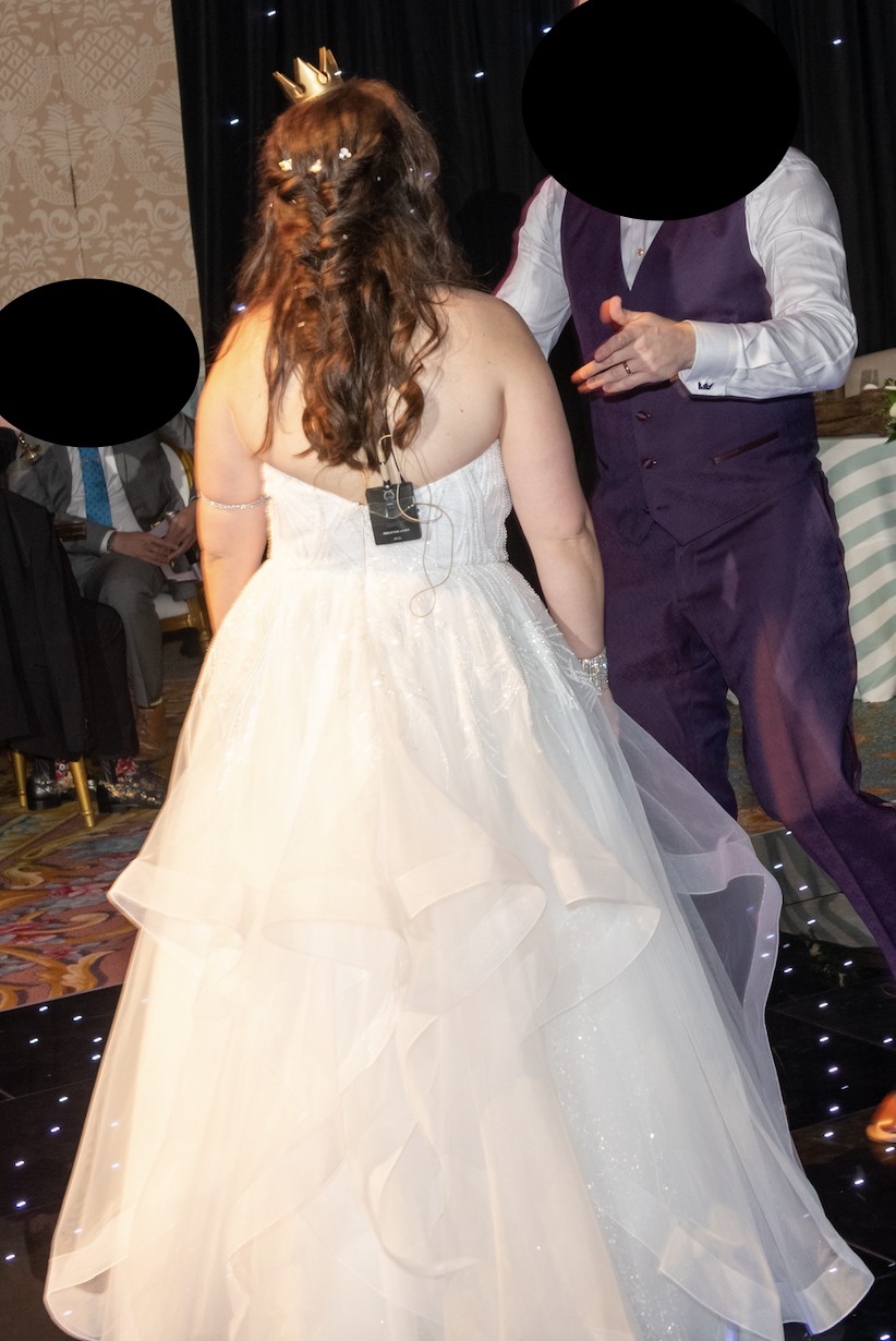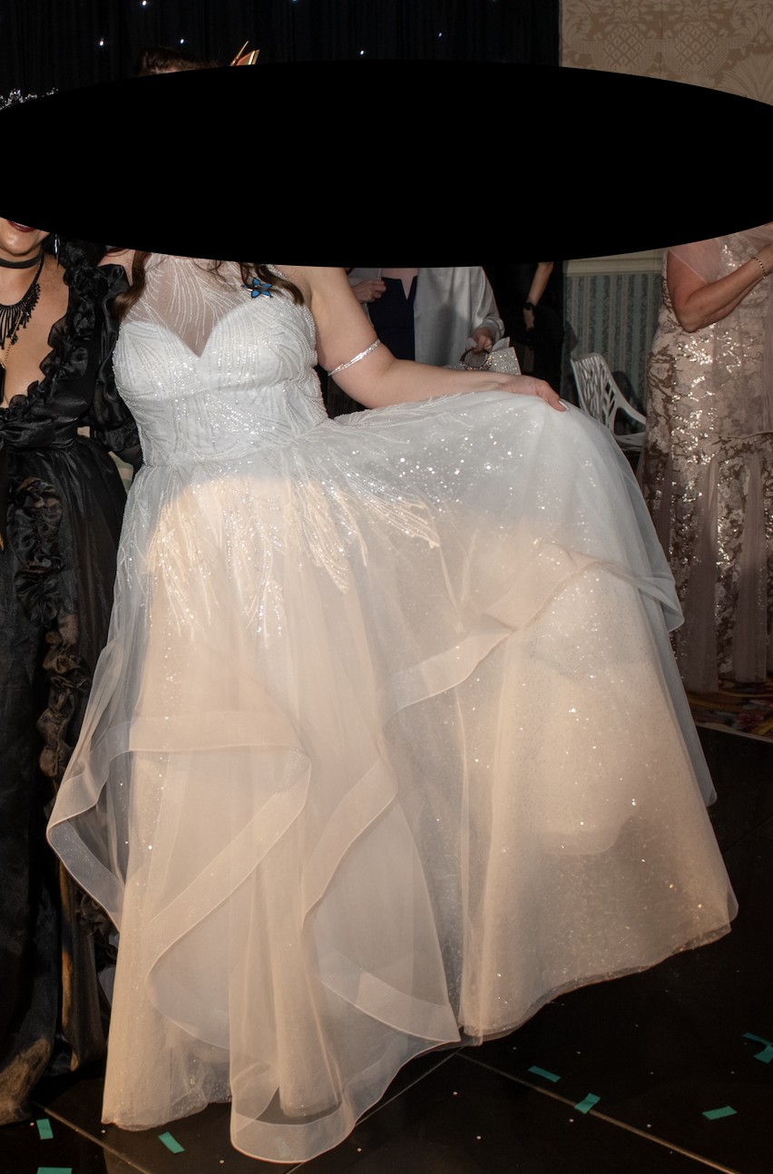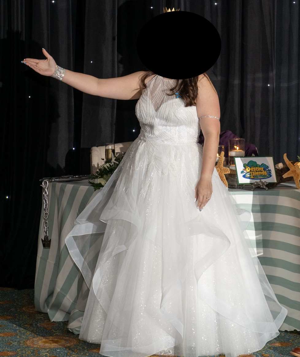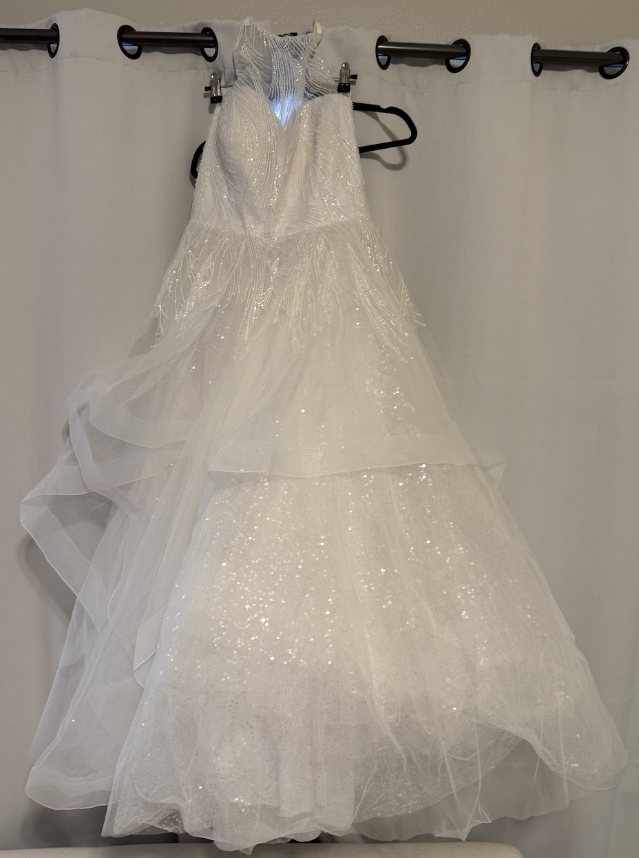 What truly sets this dress apart are the all-over sparkles, intricate ruffles and shimmering sequins that dance with every step. The spaghetti straps add a touch of delicate charm, making it feel both timeless and modern. Designed with a size 10 body in mind, this floor-length gown flatters curves and provides the perfect foundation for any bride to feel confident and radiant on her special day.