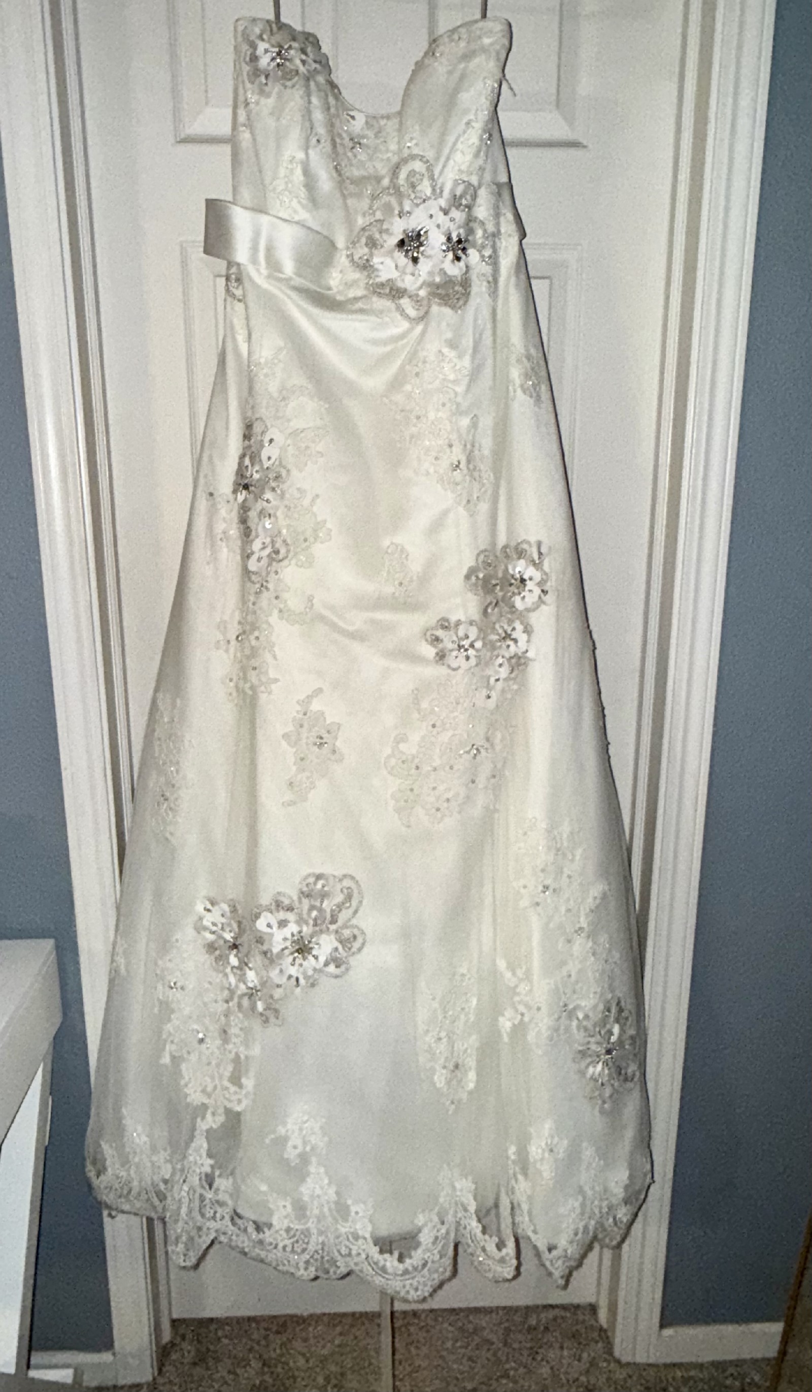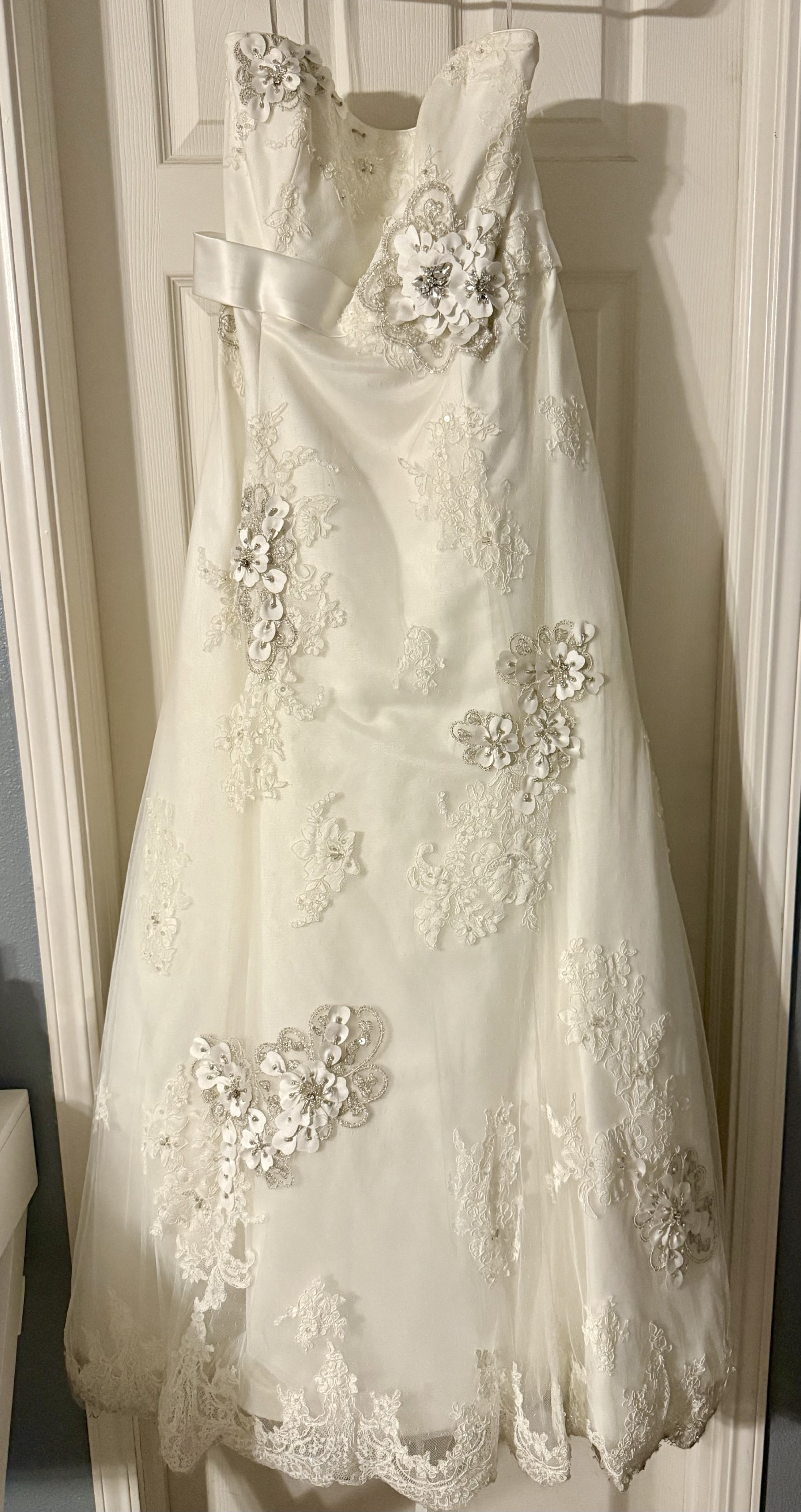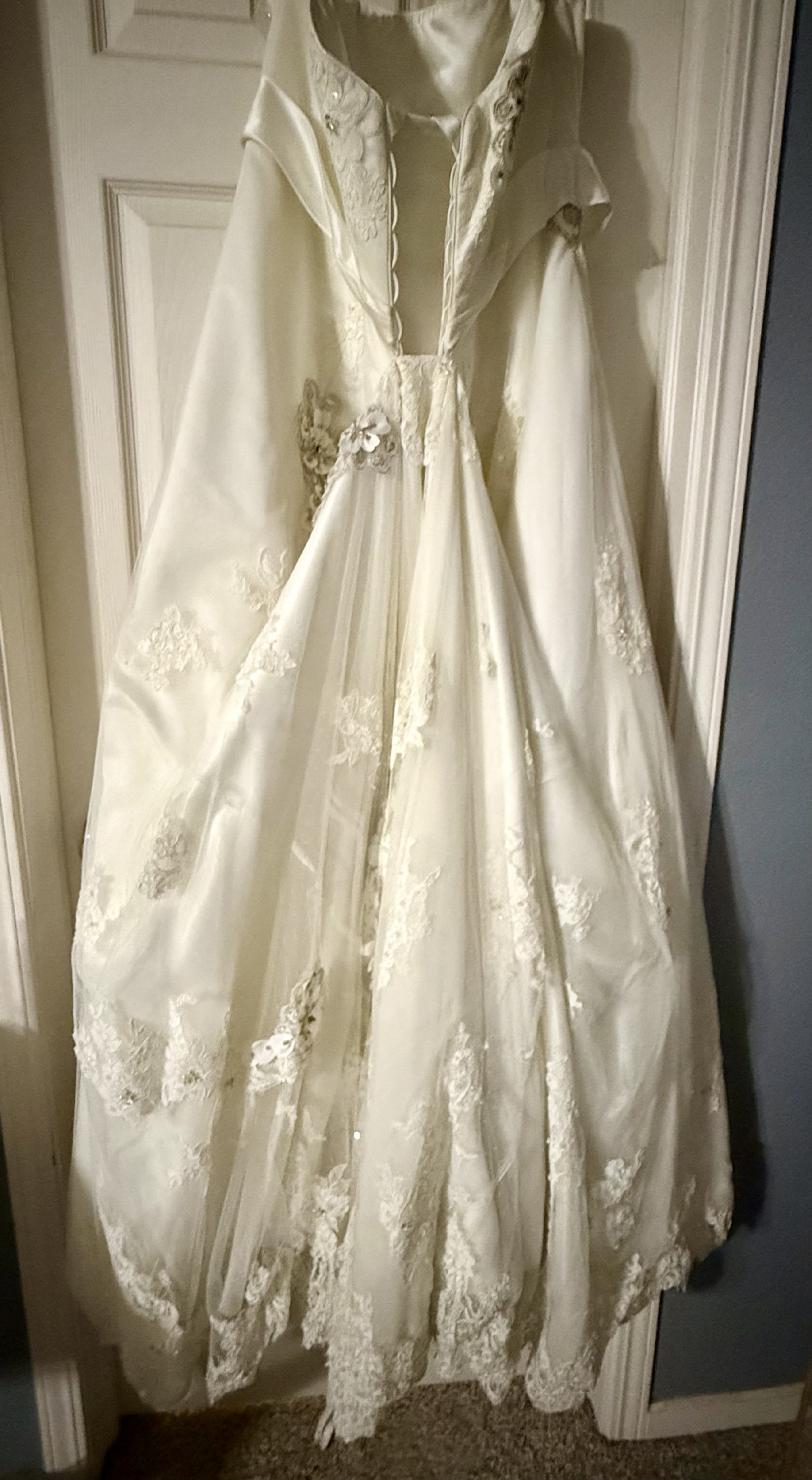 Floor-length with a flowing train, it creates a stunning look as you walk down the aisle. I felt like the most beautiful version of myself in this dress, surrounded by love and laughter. Now, I hope it can bring joy and elegance to another bride's special day. It's been carefully cleaned and preserved, waiting for someone to create their own magical moments. If you're looking for a dress that embodies romance and sophistication, this could be the one for you.