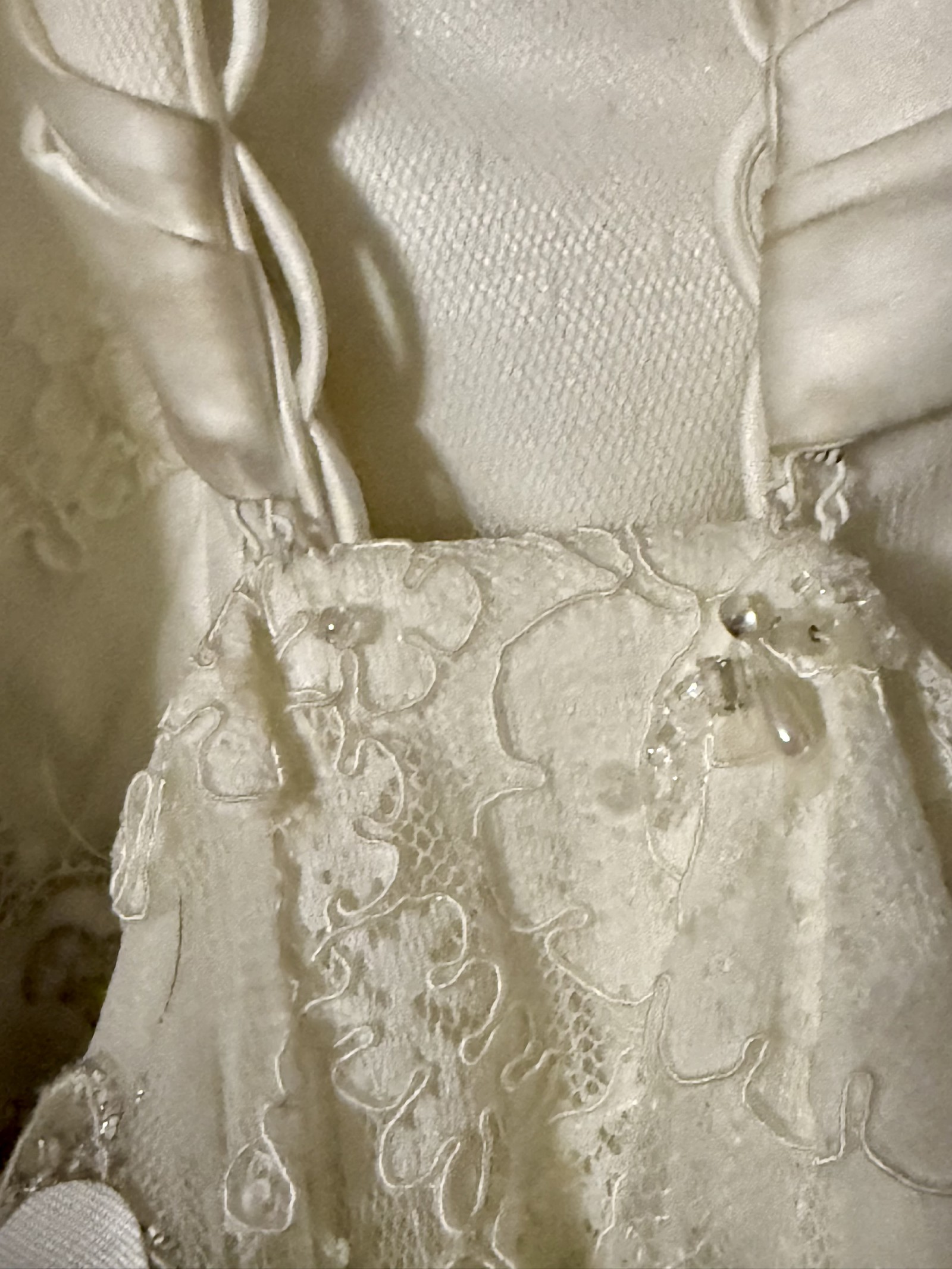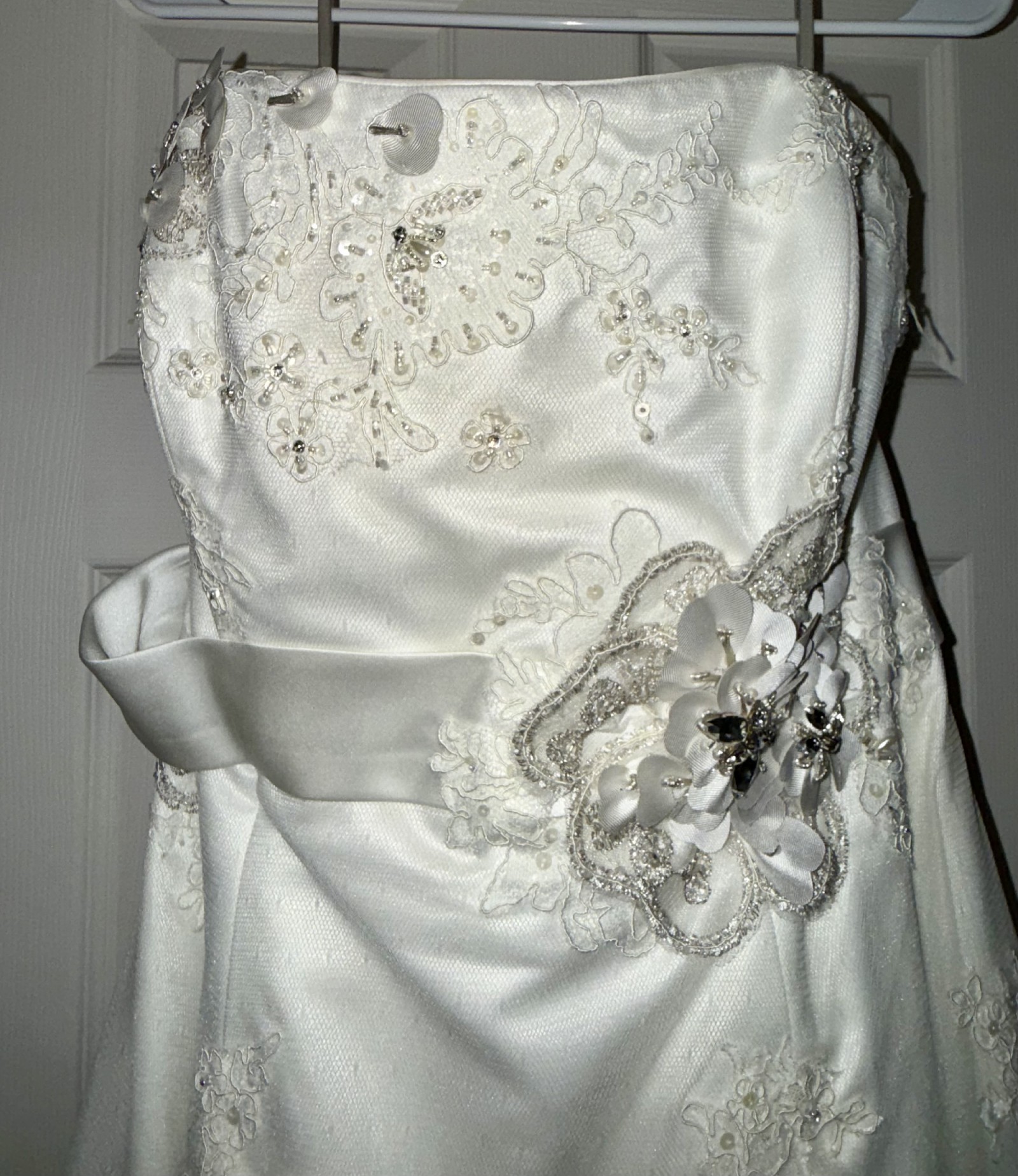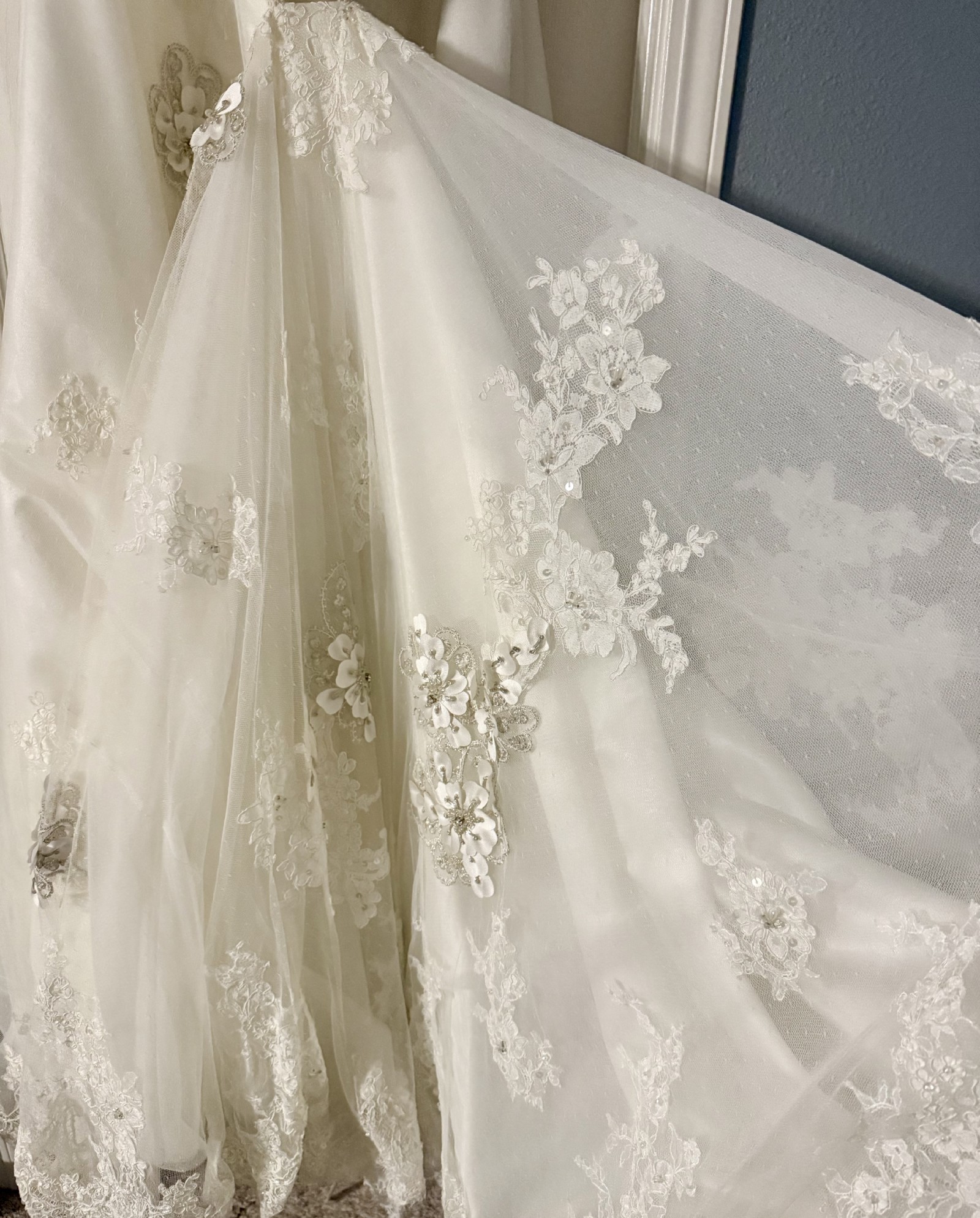 Floor-length with a flowing train, it creates a stunning look as you walk down the aisle. I felt like the most beautiful version of myself in this dress, surrounded by love and laughter. Now, I hope it can bring joy and elegance to another bride's special day. It's been carefully cleaned and preserved, waiting for someone to create their own magical moments. If you're looking for a dress that embodies romance and sophistication, this could be the one for you.