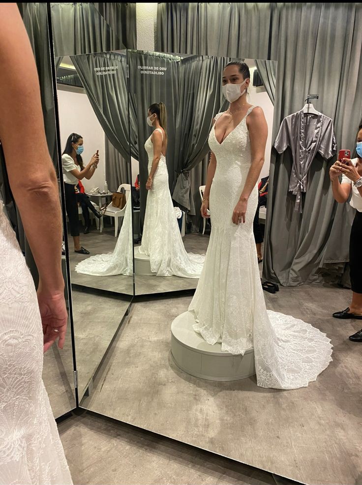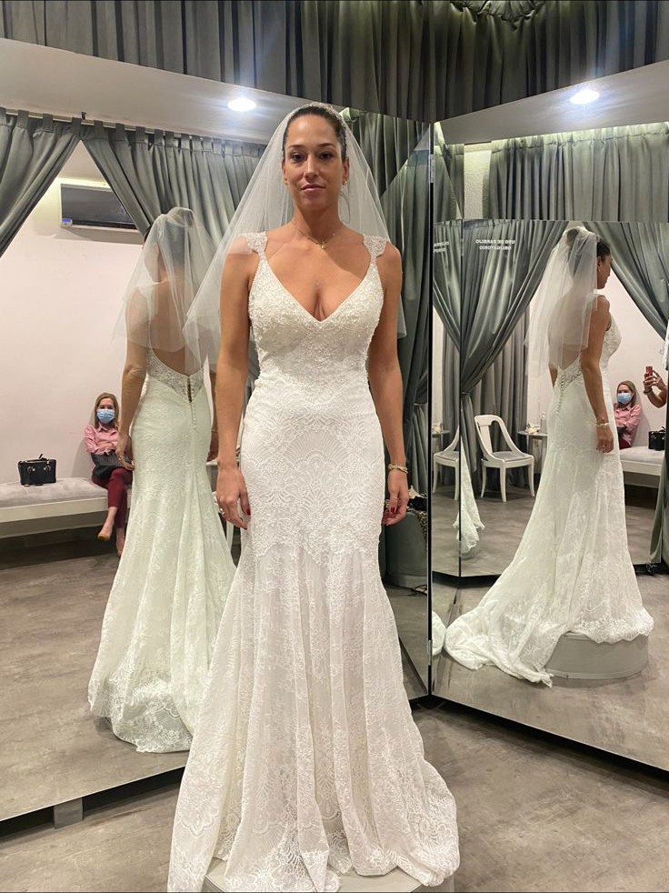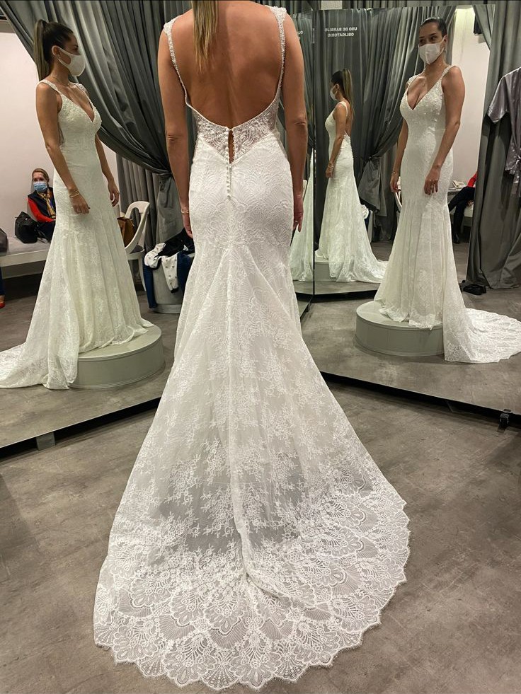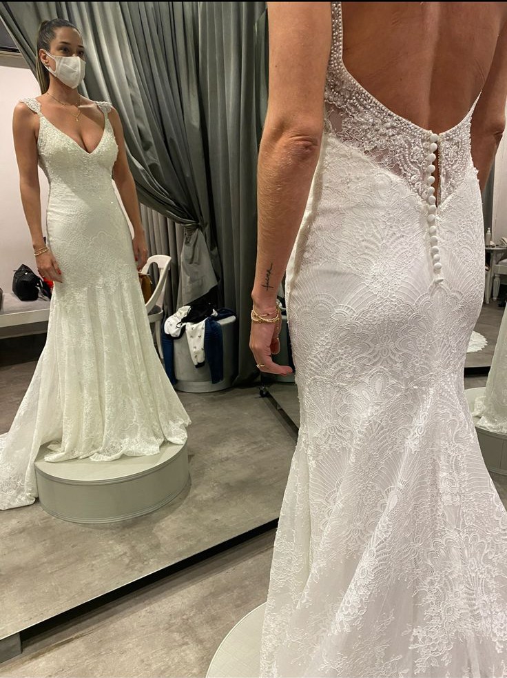 This exquisite Rosa Clará Couture dress is truly a dream for any bride. The Soft Couture mermaid silhouette elegantly hugs your curves, providing a timeless luxury that makes you feel like you’re walking on air. The stunning V-neckline is delicately framed with intricate embroidery and glistening crystals, adding just the right amount of sparkle to your special day.