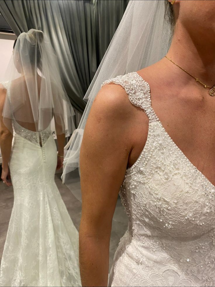 Worn once, this dress is in pristine condition, ready for its next adventure. If you are looking for that perfect blend of elegance and glamour to make your wedding unforgettable, look no further. Let this dress be the one that captures your heart and showcases the beauty of your love story.