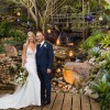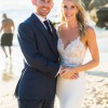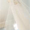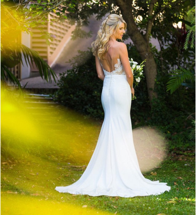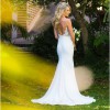 Silk crepe mermaid/fit and flare wedding dress with nude details. Sheer illusion tulle bodice with French chantilly and corded lace appliqué that creeps down onto skirt. Narrow silk crepe waist band. Low V back. Train can be bustled or held with ribbon on wrist.